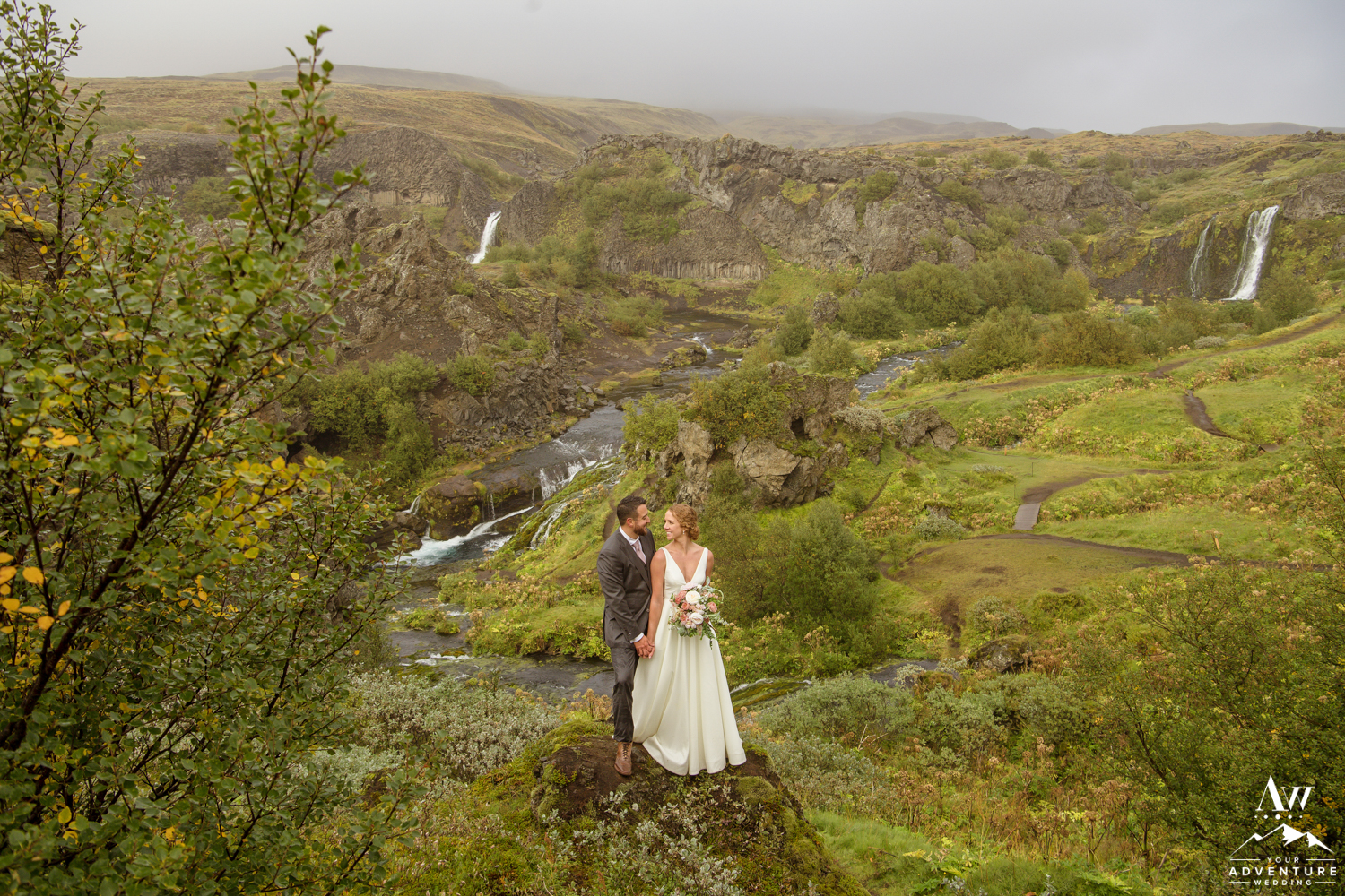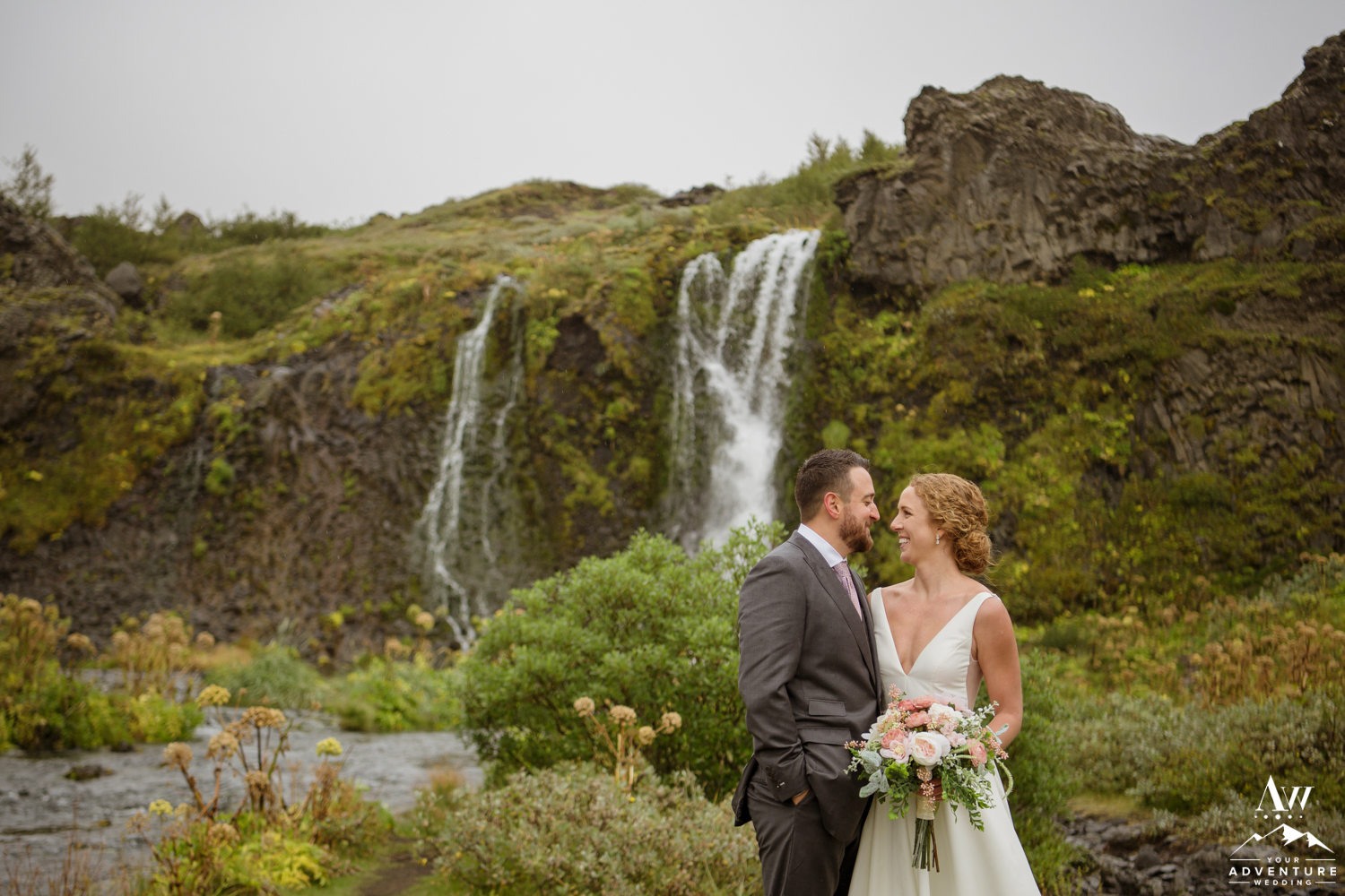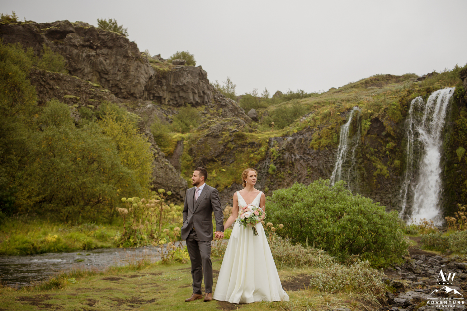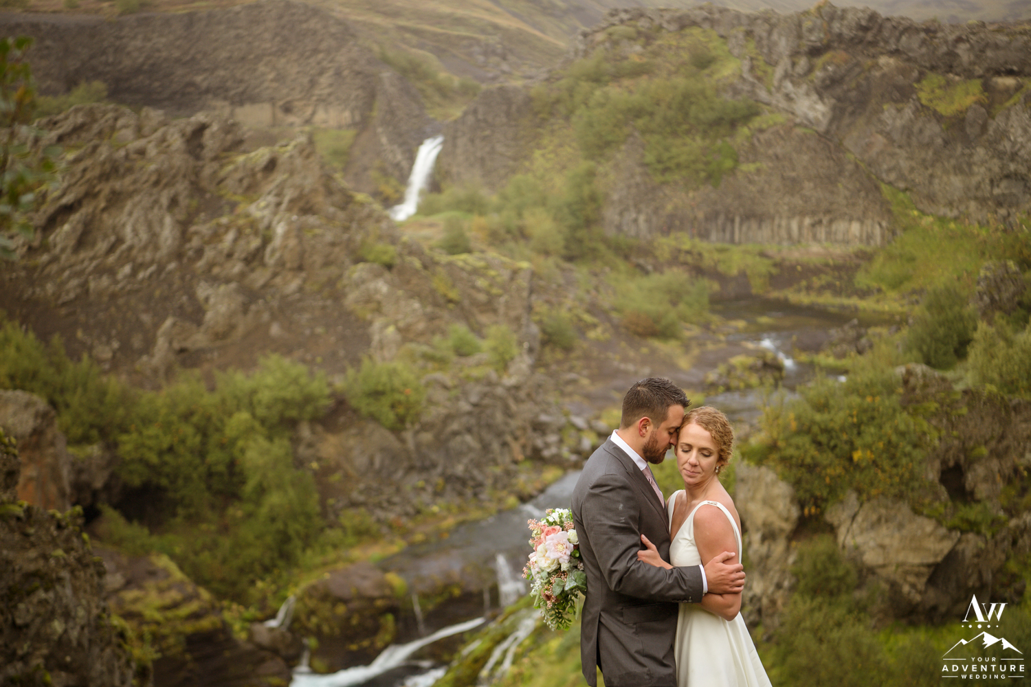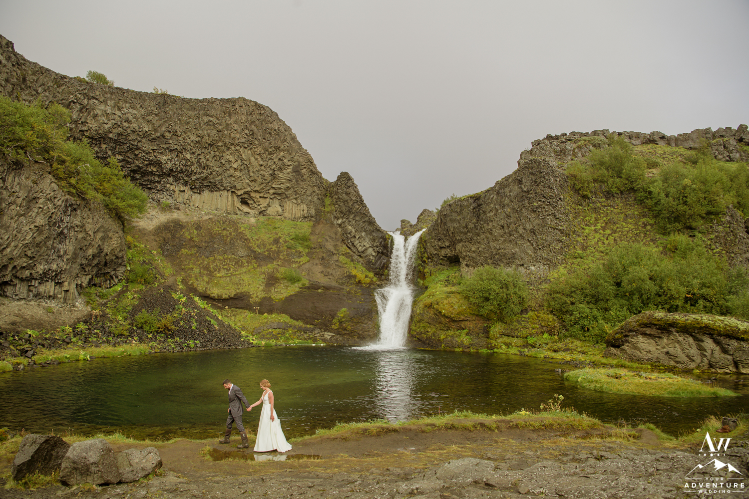 In our opinion champagne goes quite well with waterfalls, so a toast was in order before exploring the falls and the valley views! What is compelling about this Iceland adventure wedding location is that you get the best of all of the worlds… Gorgeous tall waterfalls, endless mountain views, and if you wanted to a challenging fun hike down into the valley! For time sake, we didn’t go on the full hike, but Erin and Jake had epic Iceland wedding photos to remember their adventure there!