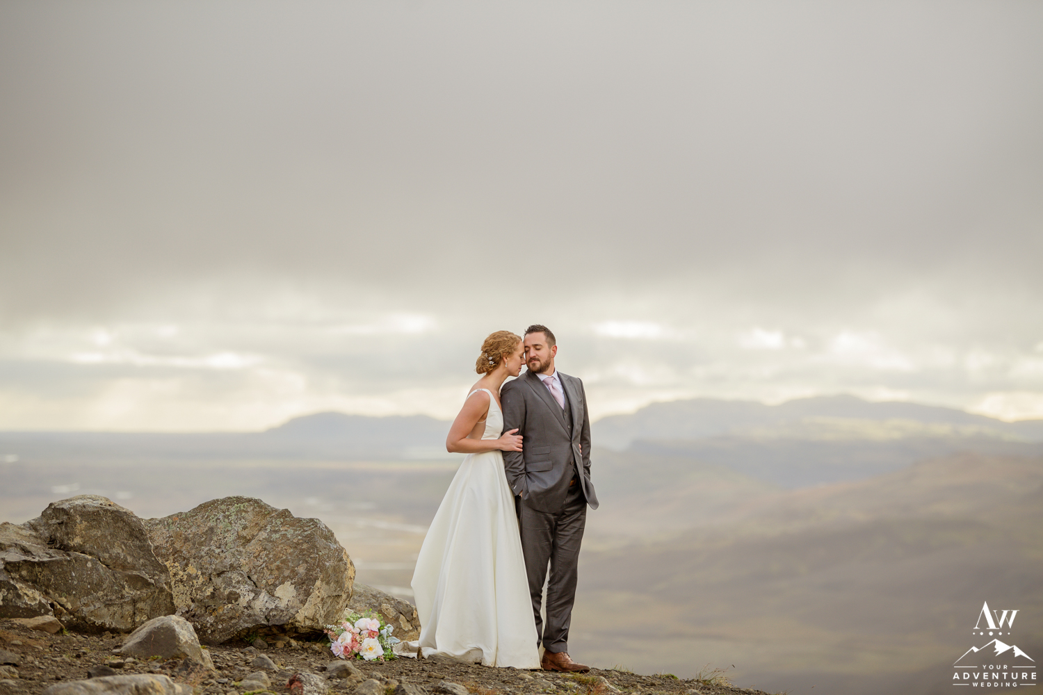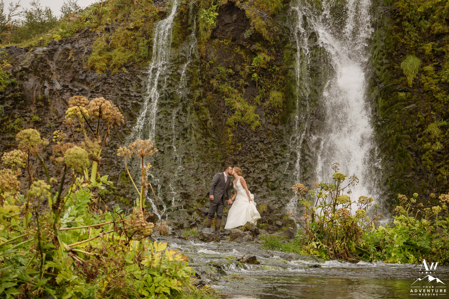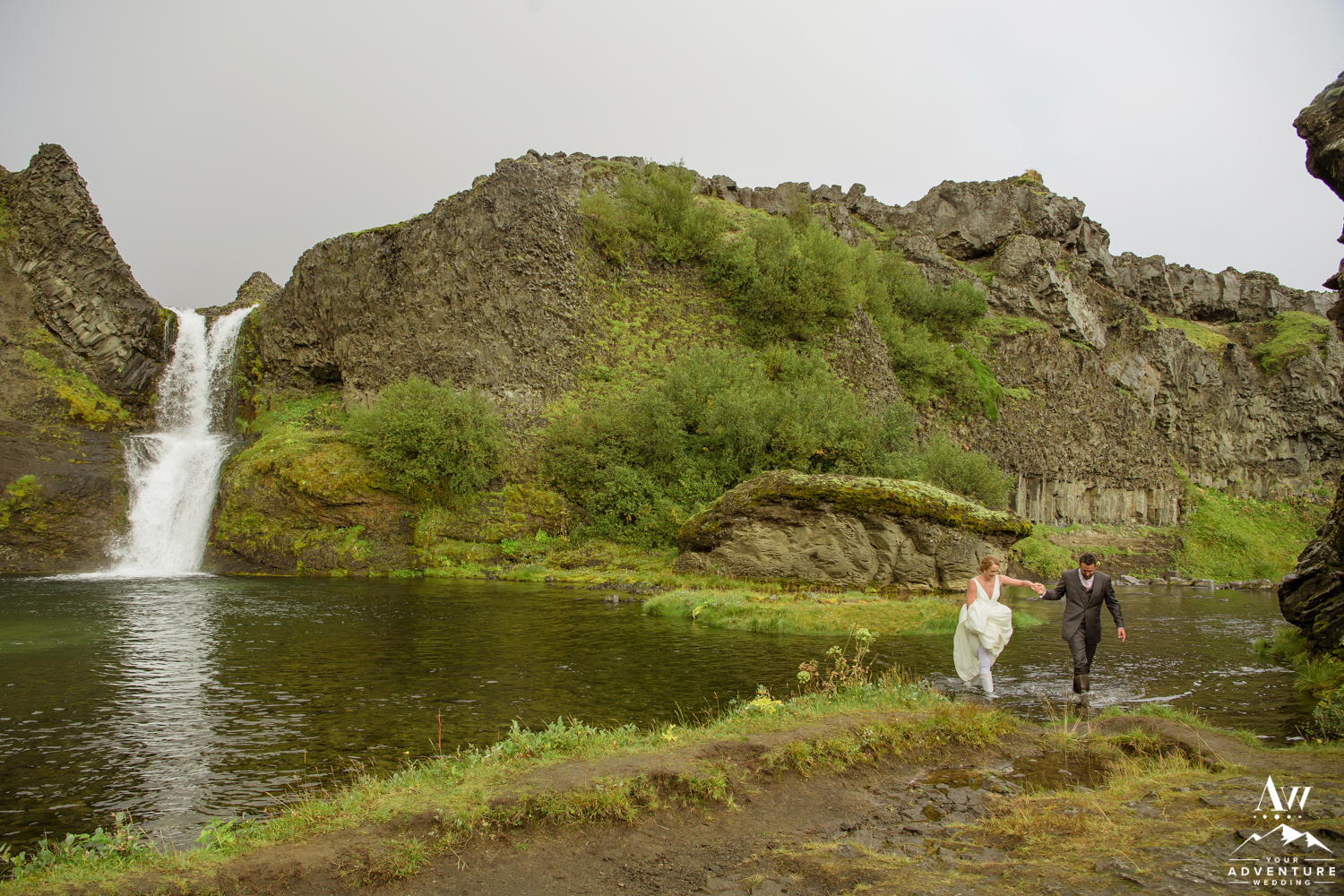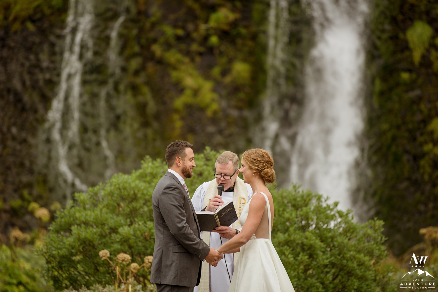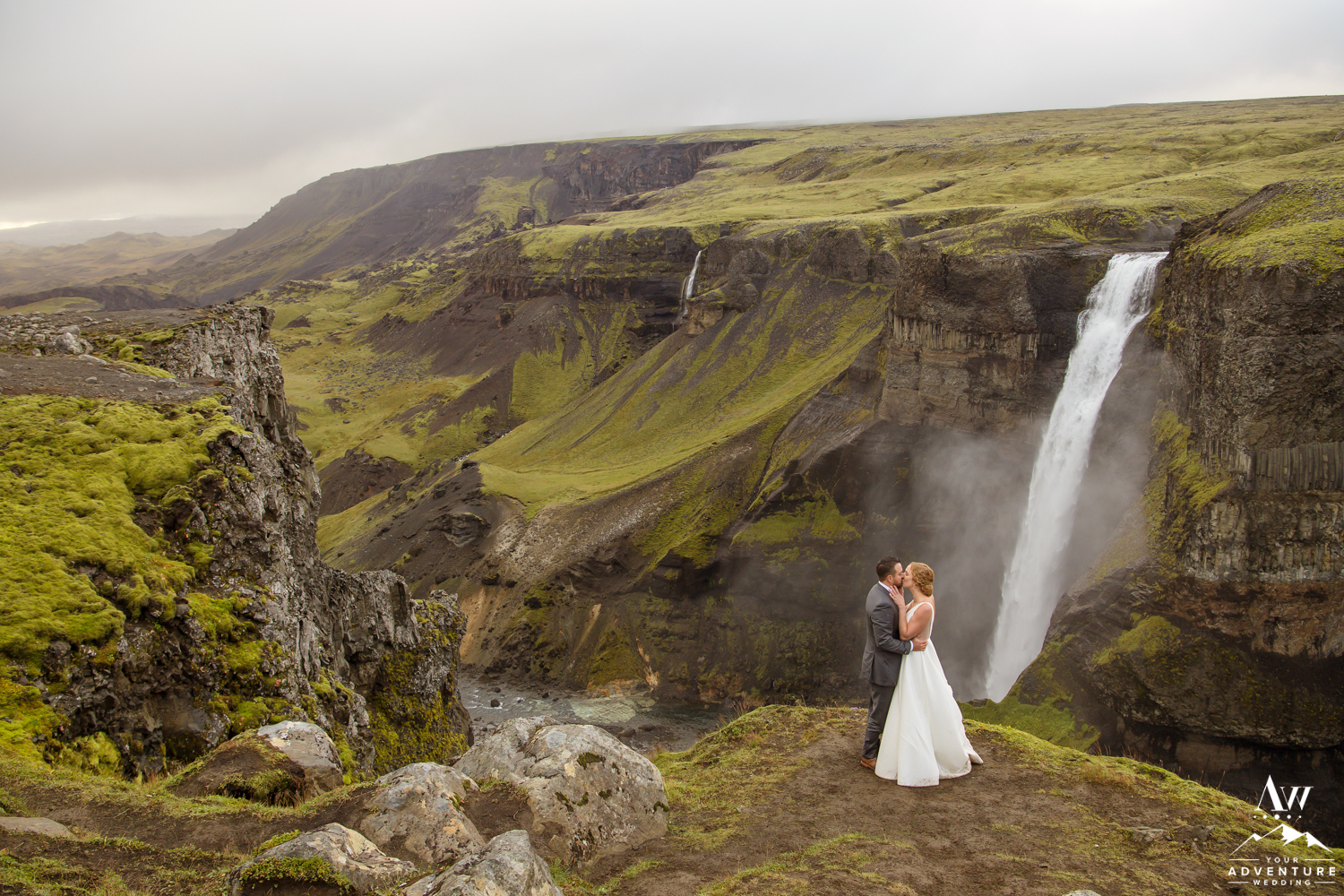 In our opinion champagne goes quite well with waterfalls, so a toast was in order before exploring the falls and the valley views! What is compelling about this Iceland adventure wedding location is that you get the best of all of the worlds… Gorgeous tall waterfalls, endless mountain views, and if you wanted to a challenging fun hike down into the valley! For time sake, we didn’t go on the full hike, but Erin and Jake had epic Iceland wedding photos to remember their adventure there!