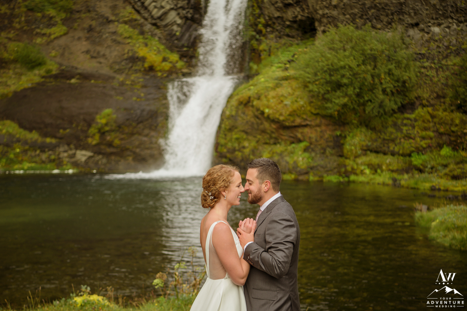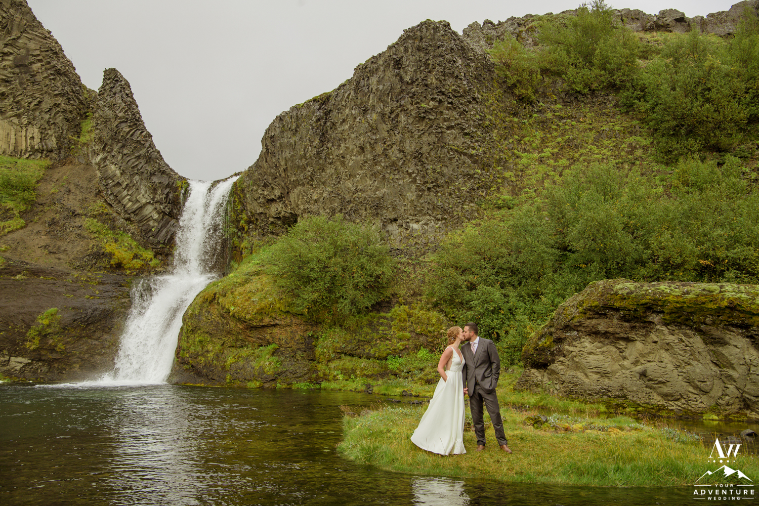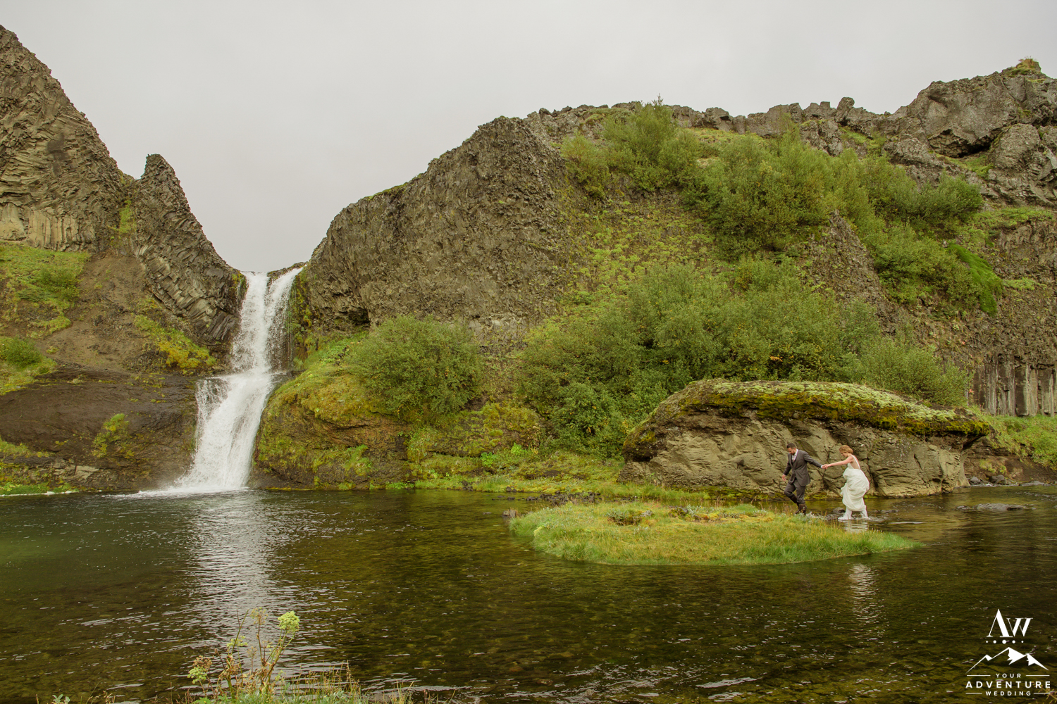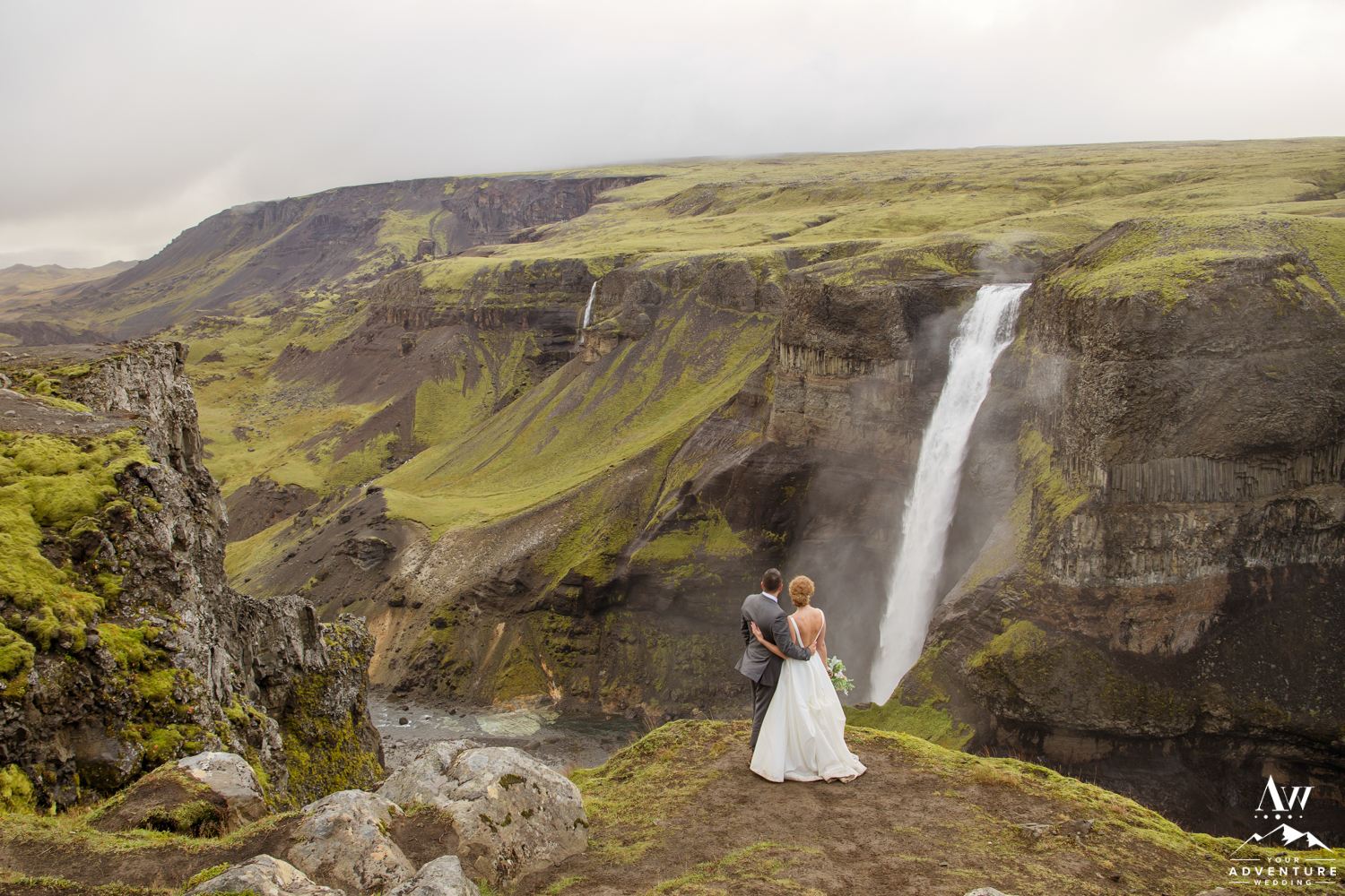 In our opinion champagne goes quite well with waterfalls, so a toast was in order before exploring the falls and the valley views! What is compelling about this Iceland adventure wedding location is that you get the best of all of the worlds… Gorgeous tall waterfalls, endless mountain views, and if you wanted to a challenging fun hike down into the valley! For time sake, we didn’t go on the full hike, but Erin and Jake had epic Iceland wedding photos to remember their adventure there!