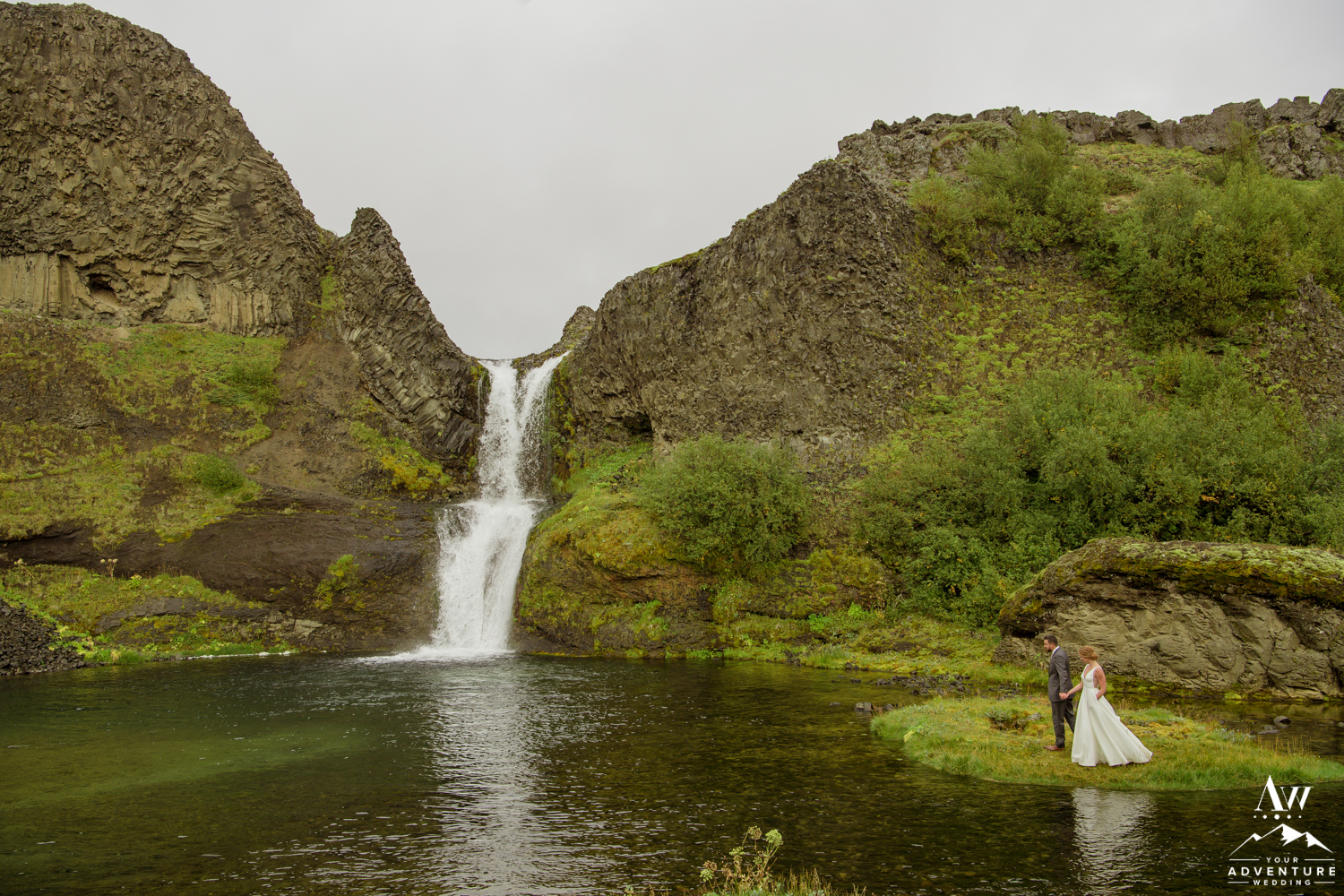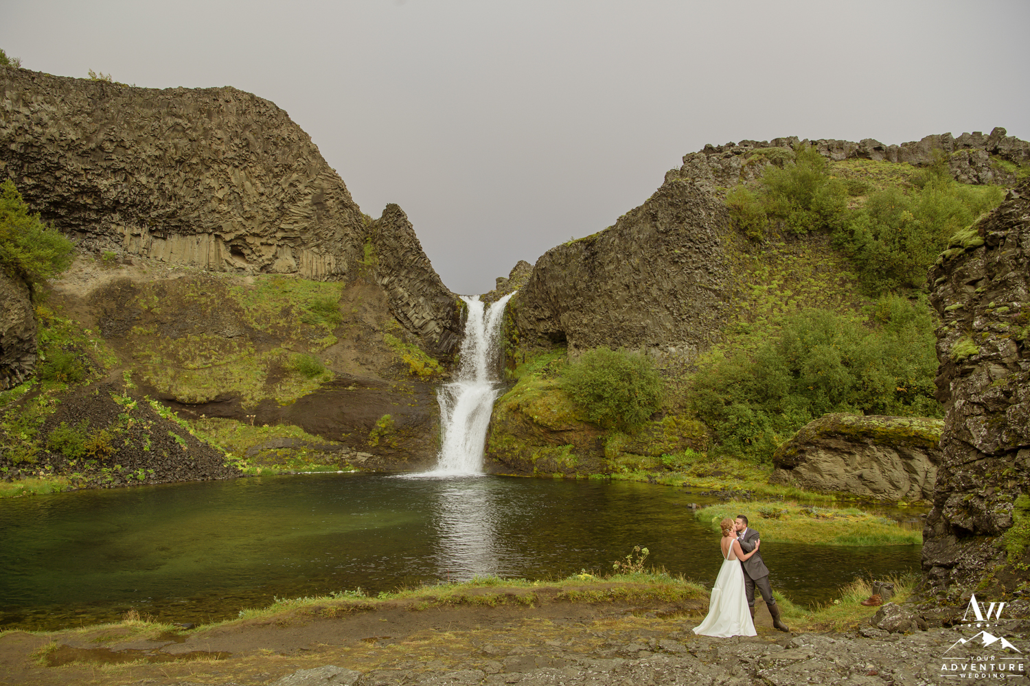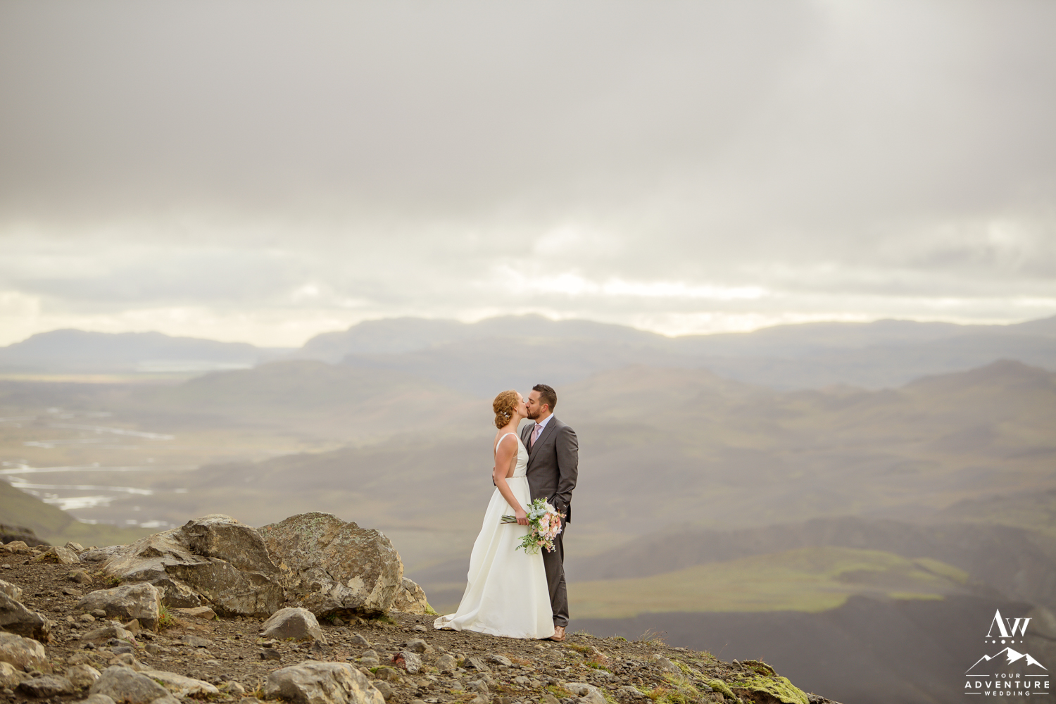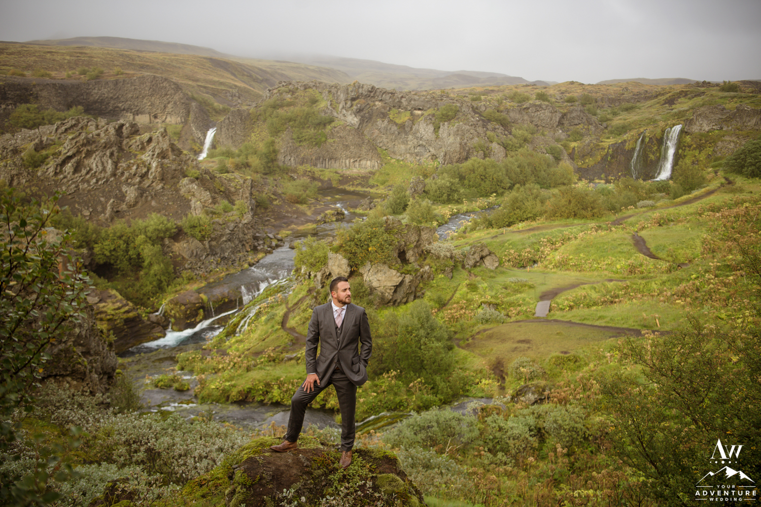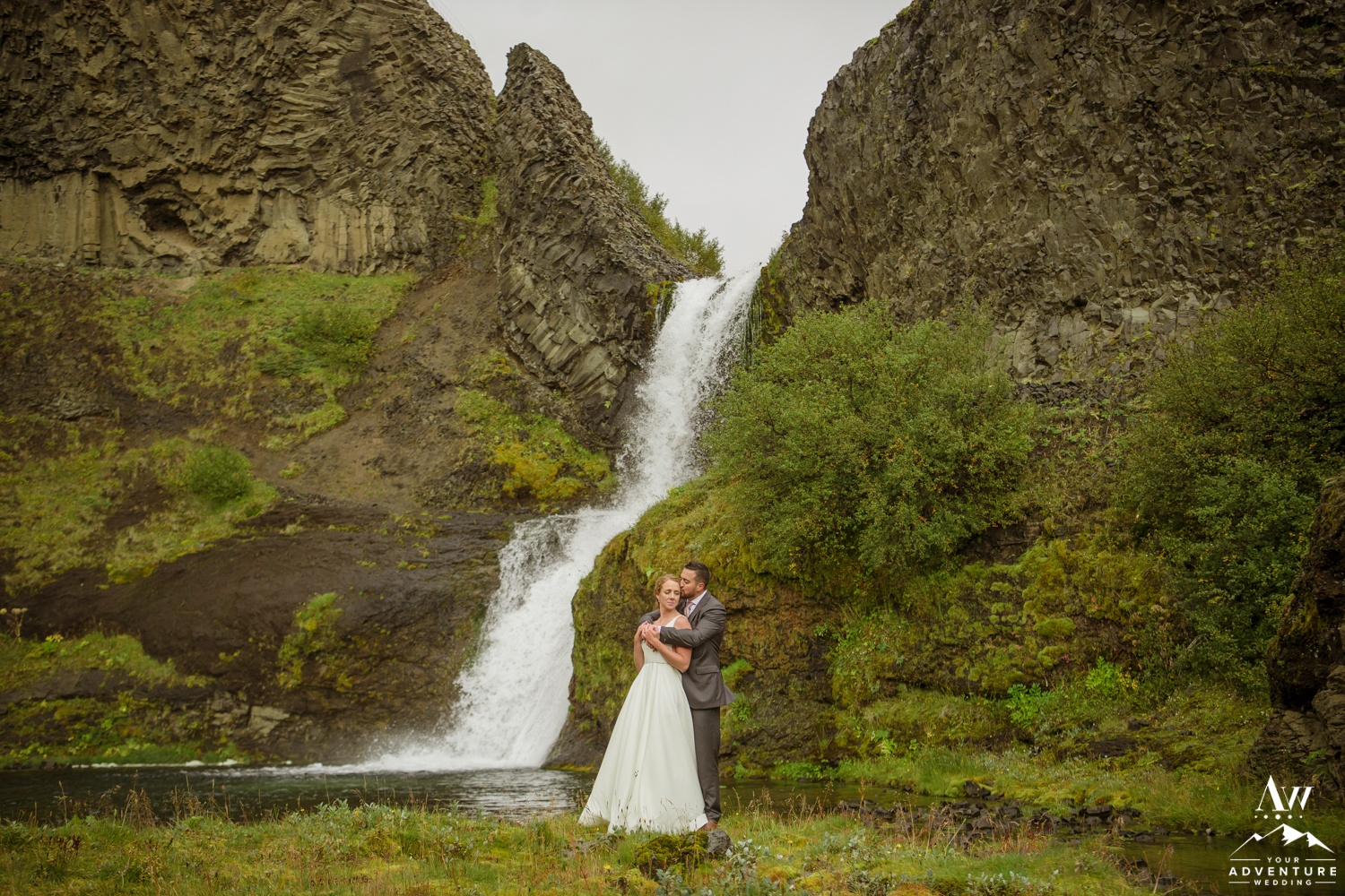 In our opinion champagne goes quite well with waterfalls, so a toast was in order before exploring the falls and the valley views! What is compelling about this Iceland adventure wedding location is that you get the best of all of the worlds… Gorgeous tall waterfalls, endless mountain views, and if you wanted to a challenging fun hike down into the valley! For time sake, we didn’t go on the full hike, but Erin and Jake had epic Iceland wedding photos to remember their adventure there!