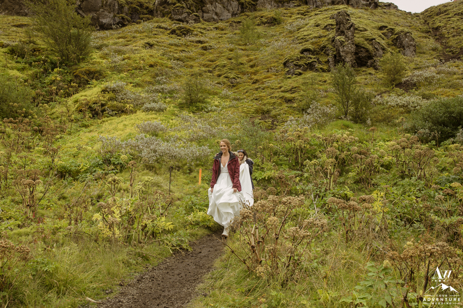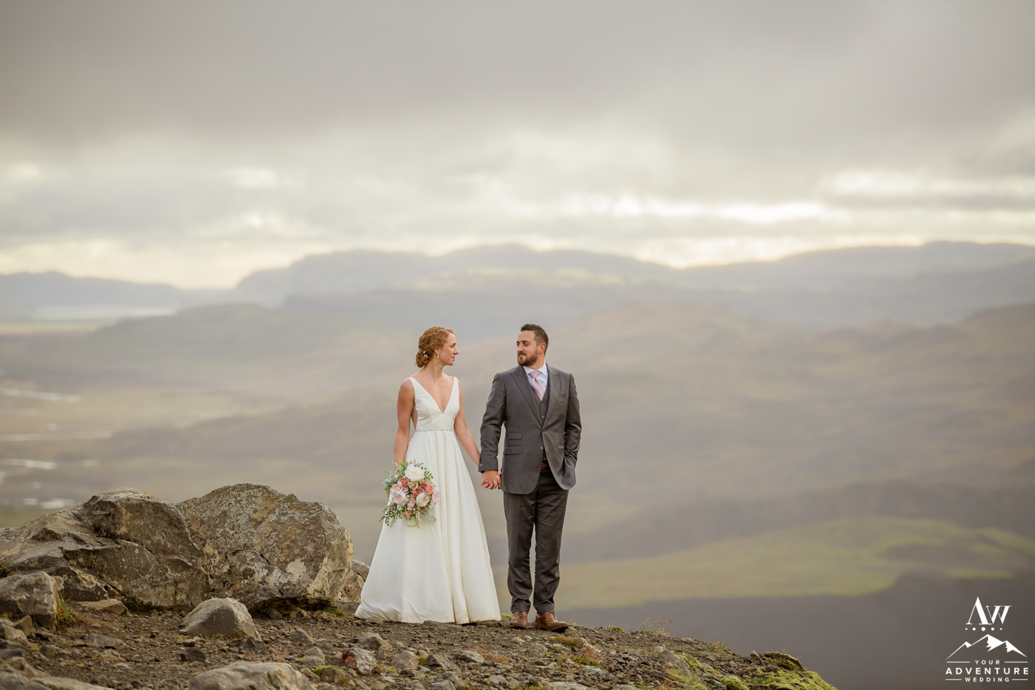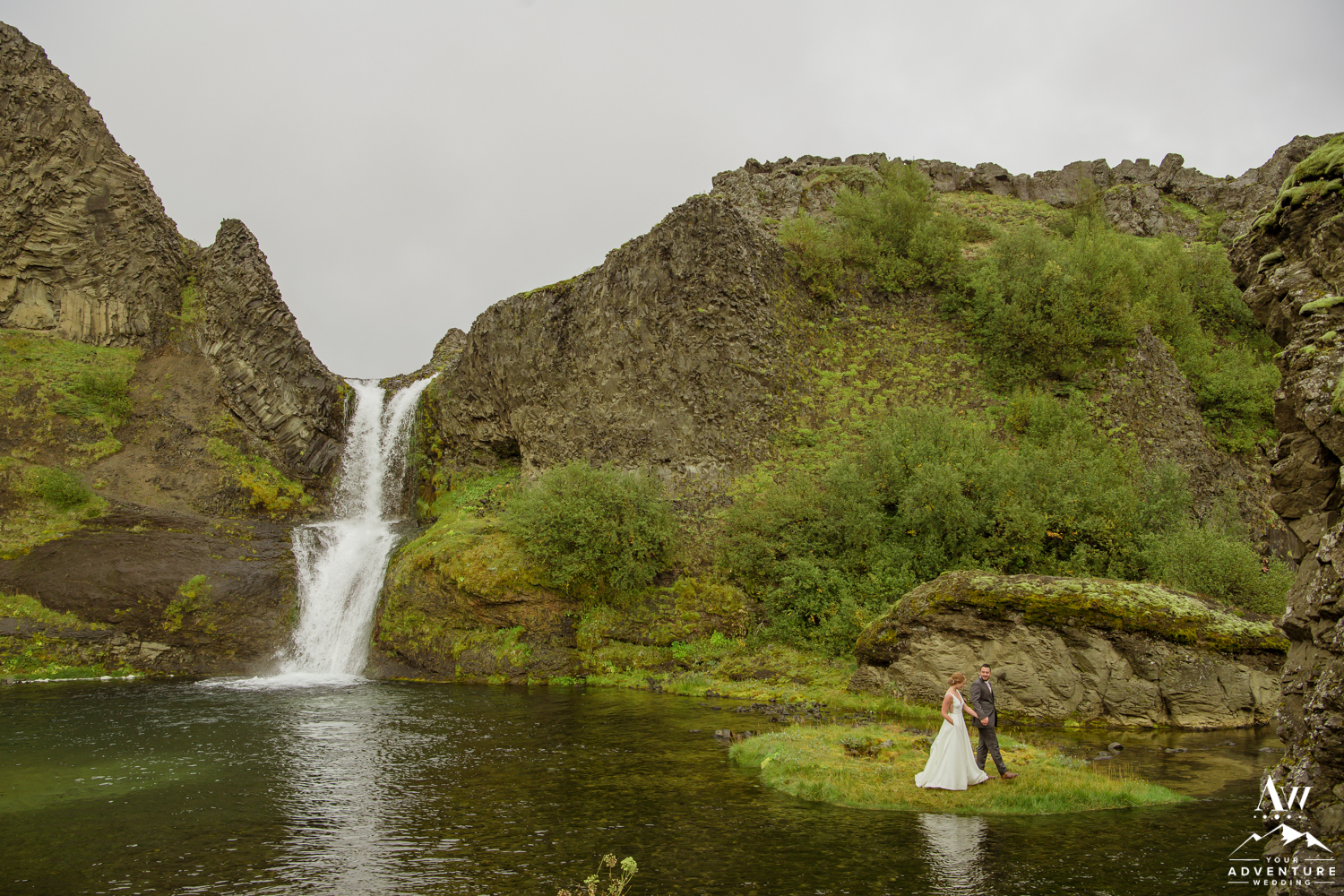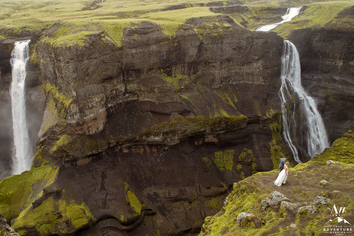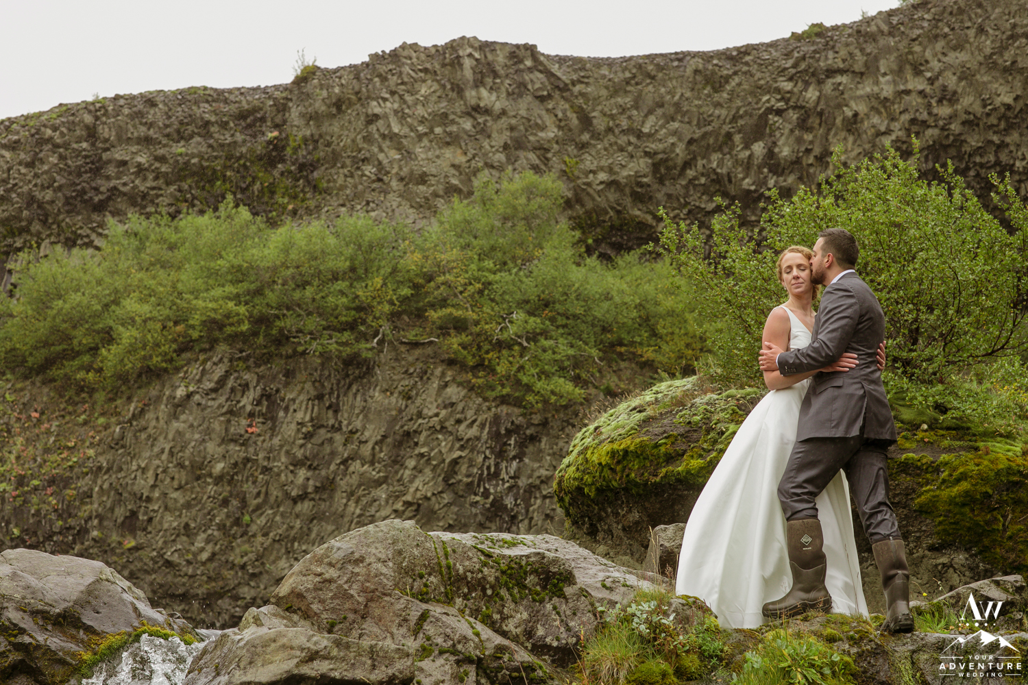 In our opinion champagne goes quite well with waterfalls, so a toast was in order before exploring the falls and the valley views! What is compelling about this Iceland adventure wedding location is that you get the best of all of the worlds… Gorgeous tall waterfalls, endless mountain views, and if you wanted to a challenging fun hike down into the valley! For time sake, we didn’t go on the full hike, but Erin and Jake had epic Iceland wedding photos to remember their adventure there!
