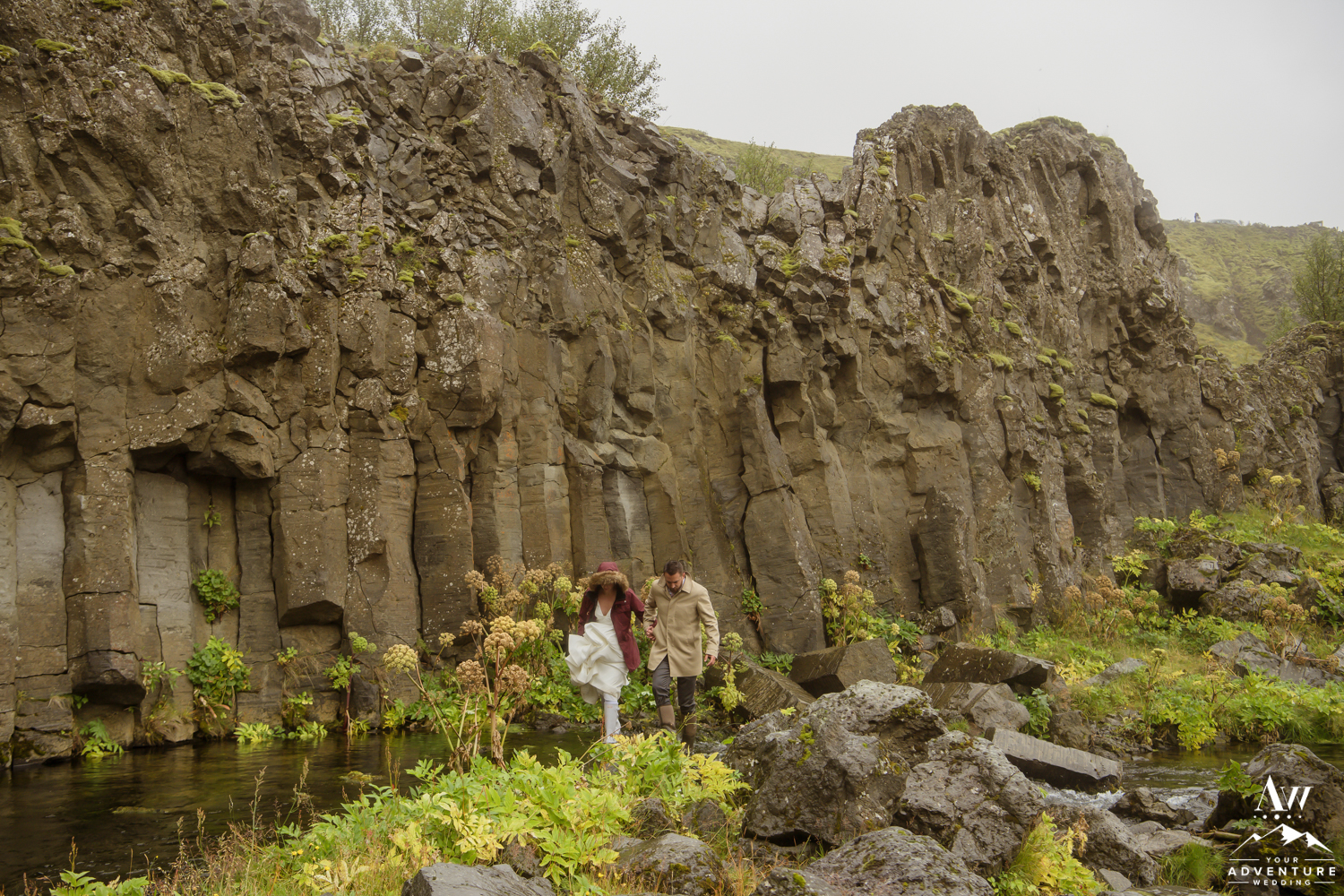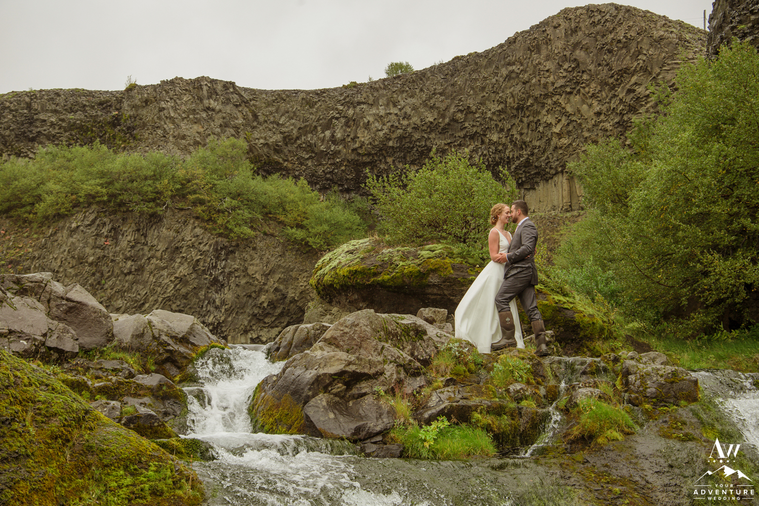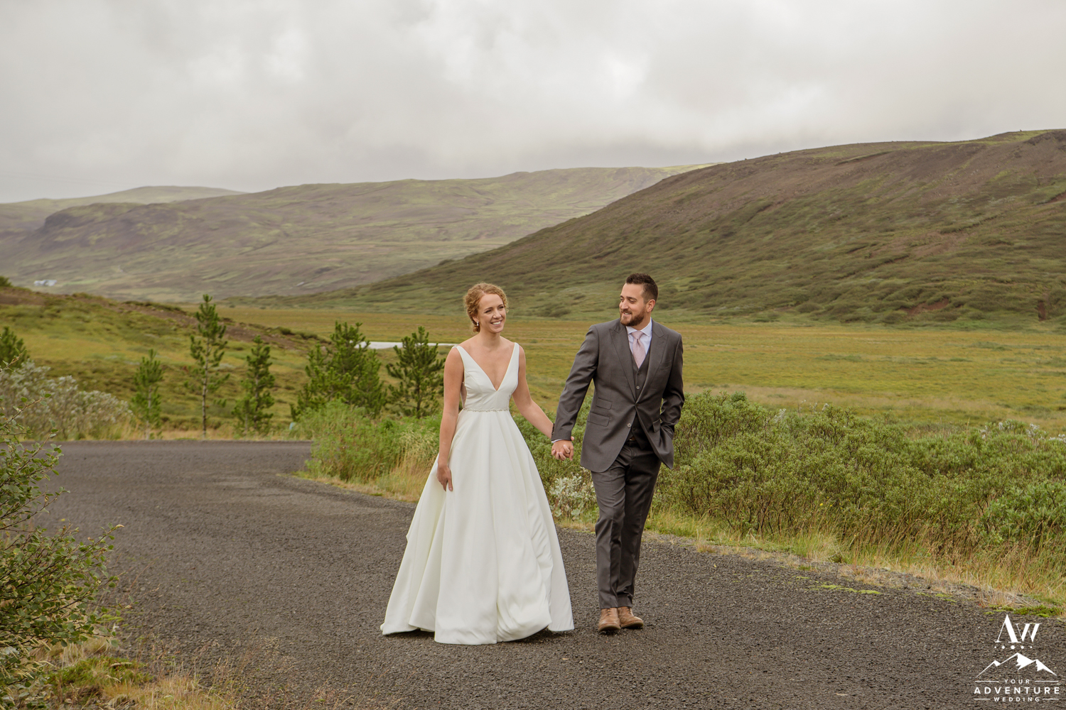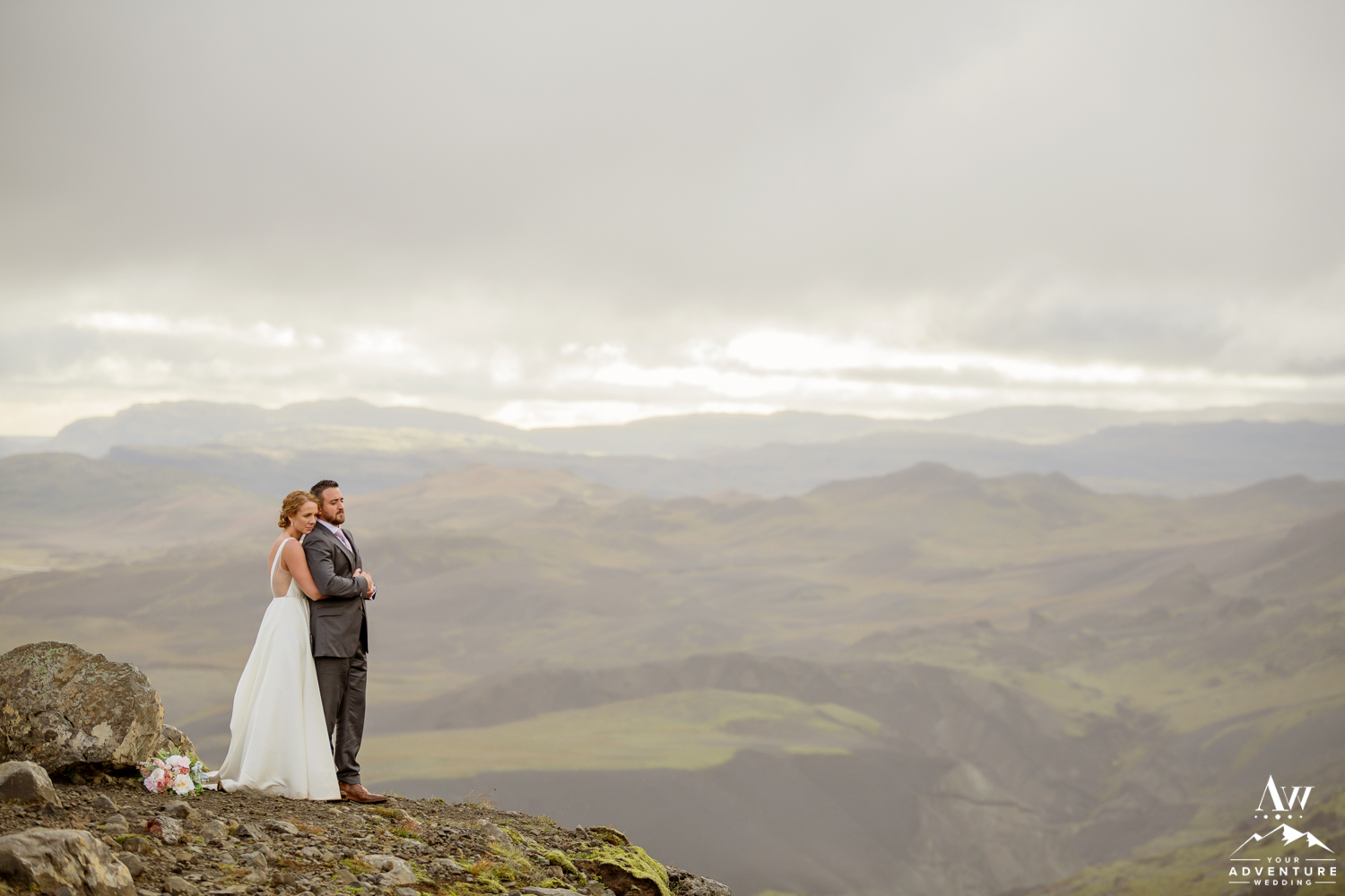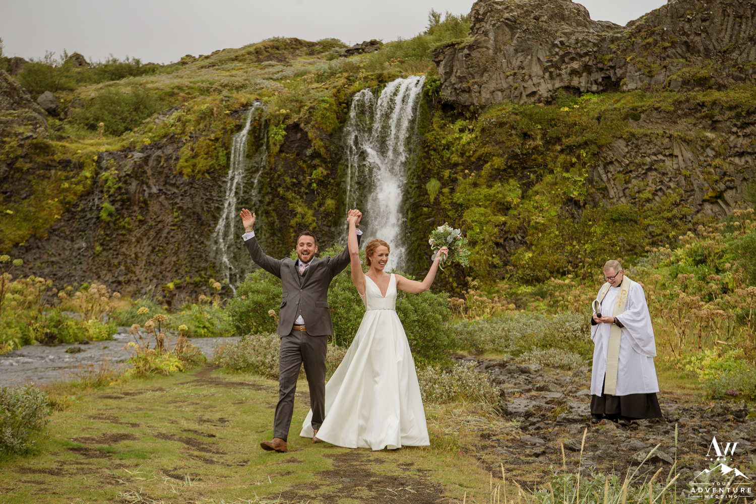 In our opinion champagne goes quite well with waterfalls, so a toast was in order before exploring the falls and the valley views! What is compelling about this Iceland adventure wedding location is that you get the best of all of the worlds… Gorgeous tall waterfalls, endless mountain views, and if you wanted to a challenging fun hike down into the valley! For time sake, we didn’t go on the full hike, but Erin and Jake had epic Iceland wedding photos to remember their adventure there!