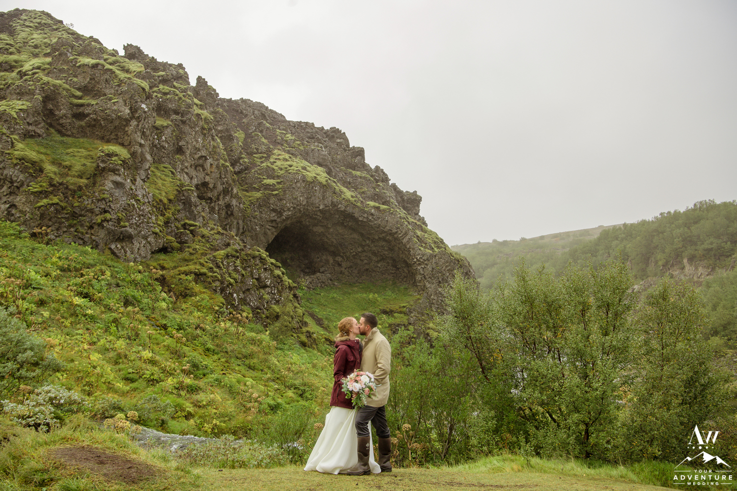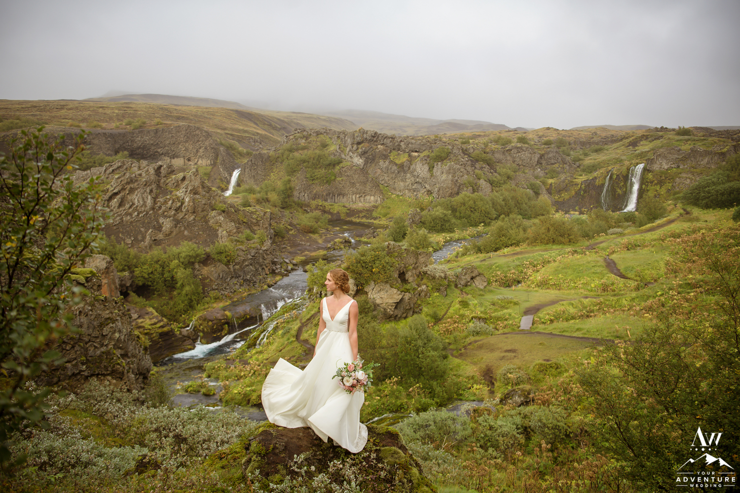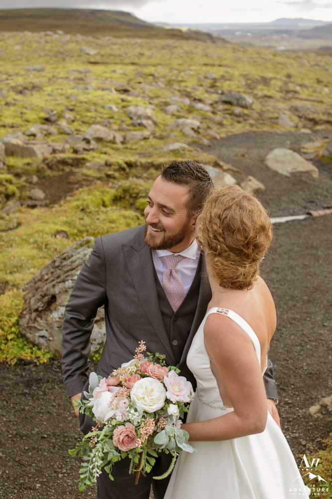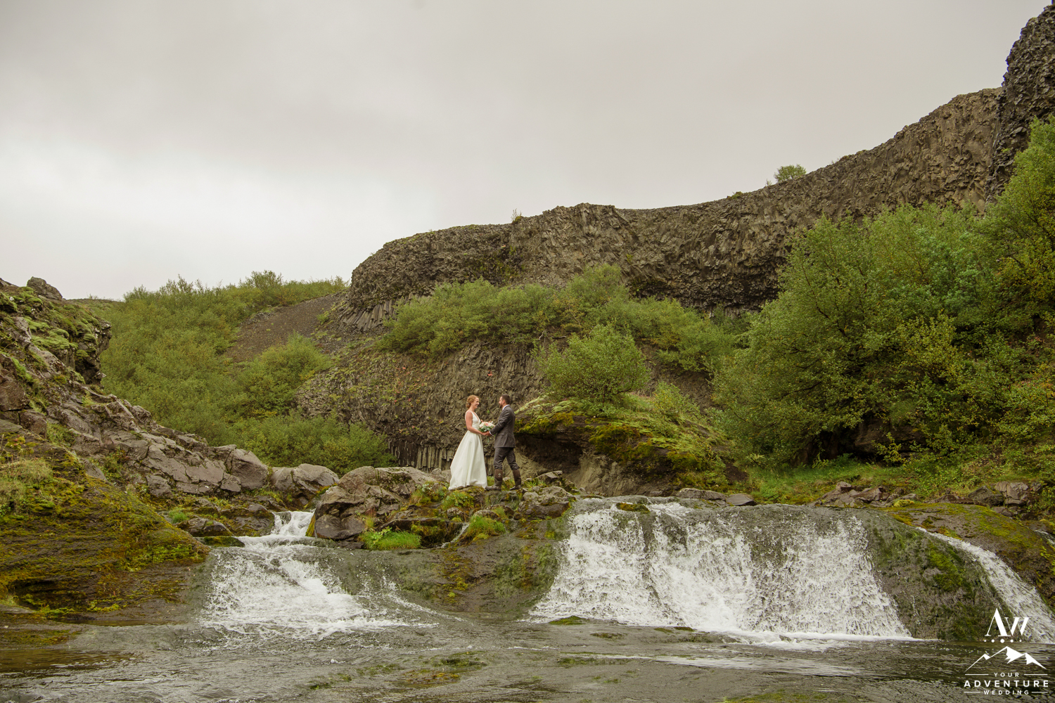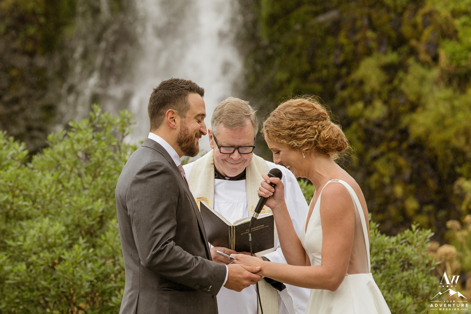 In our opinion champagne goes quite well with waterfalls, so a toast was in order before exploring the falls and the valley views! What is compelling about this Iceland adventure wedding location is that you get the best of all of the worlds… Gorgeous tall waterfalls, endless mountain views, and if you wanted to a challenging fun hike down into the valley! For time sake, we didn’t go on the full hike, but Erin and Jake had epic Iceland wedding photos to remember their adventure there!