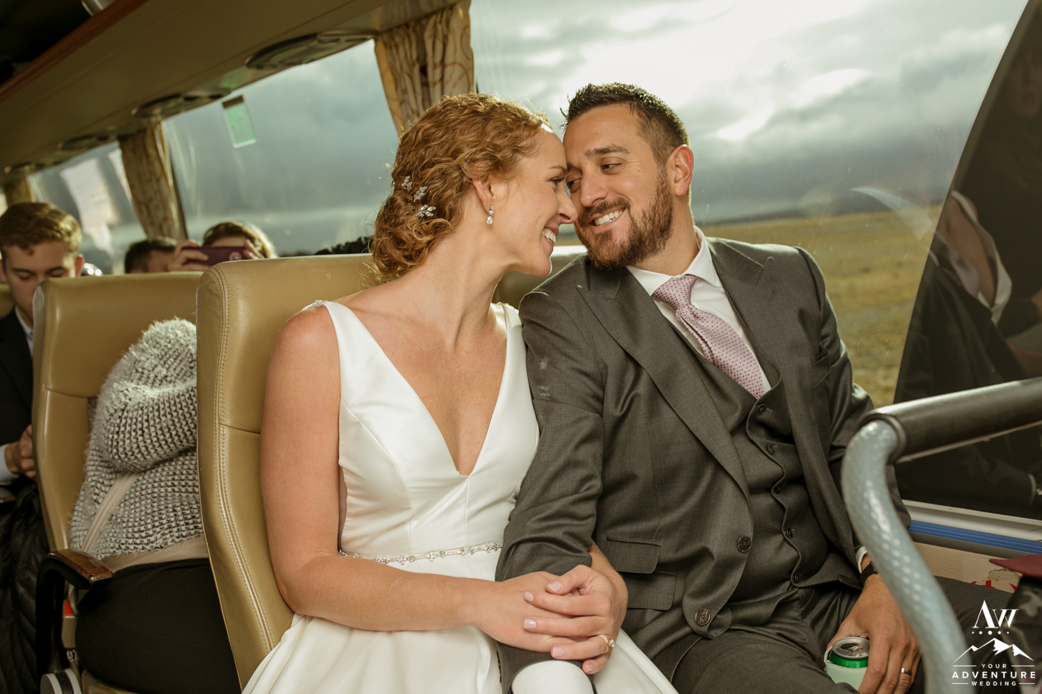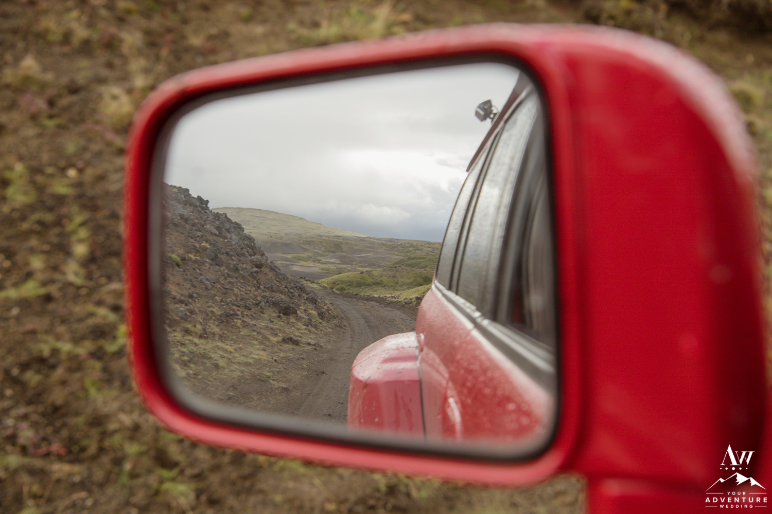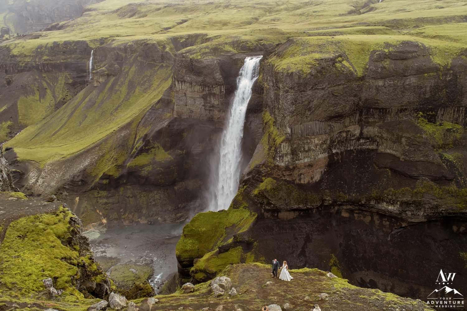 Everyone swoons over tall waterfalls found in the mountains. It’s something about the colors, textures, and the height I think. The last stop on Erin and Jake’s half day adventurous luxury lodge wedding day was a highland waterfall. What was super crazy about this stop is when our first Iceland wedding photographer arrived to setup the drone, it was filled with thick fog. Fast forward 20 minutes later when the group arrived the skies opened and the fog cleared just in time!