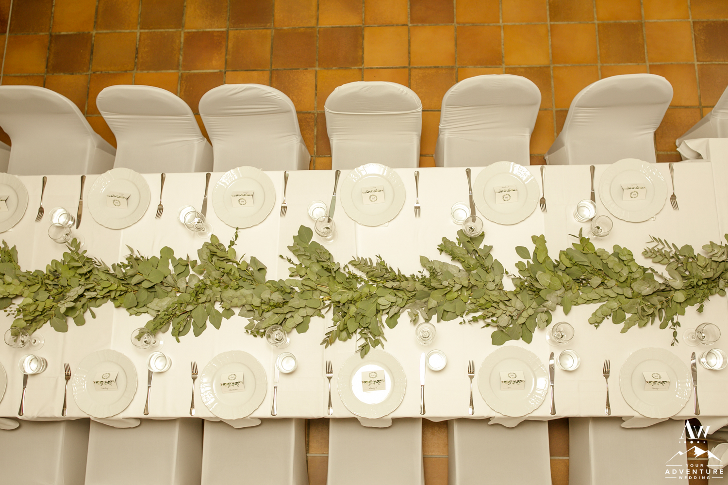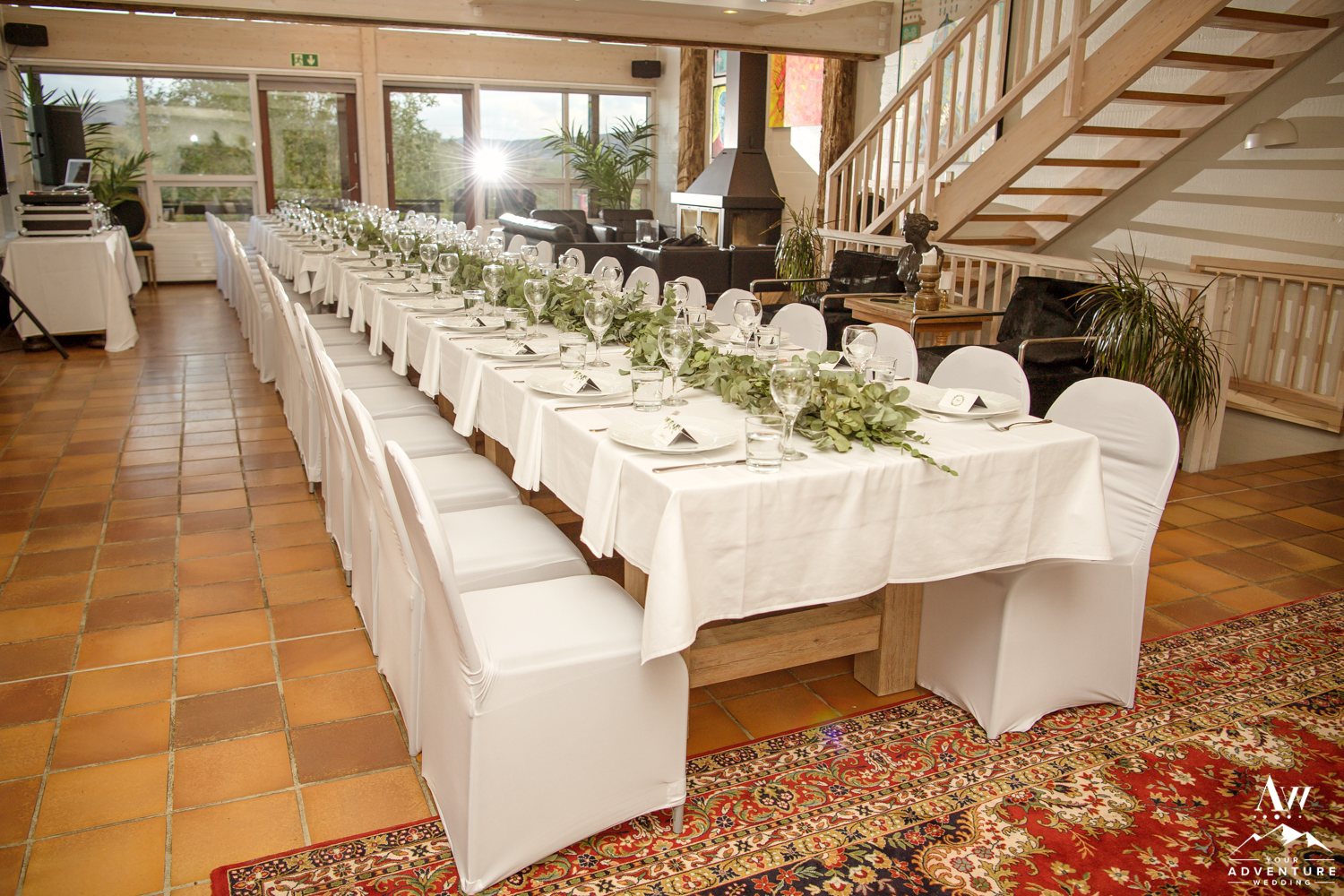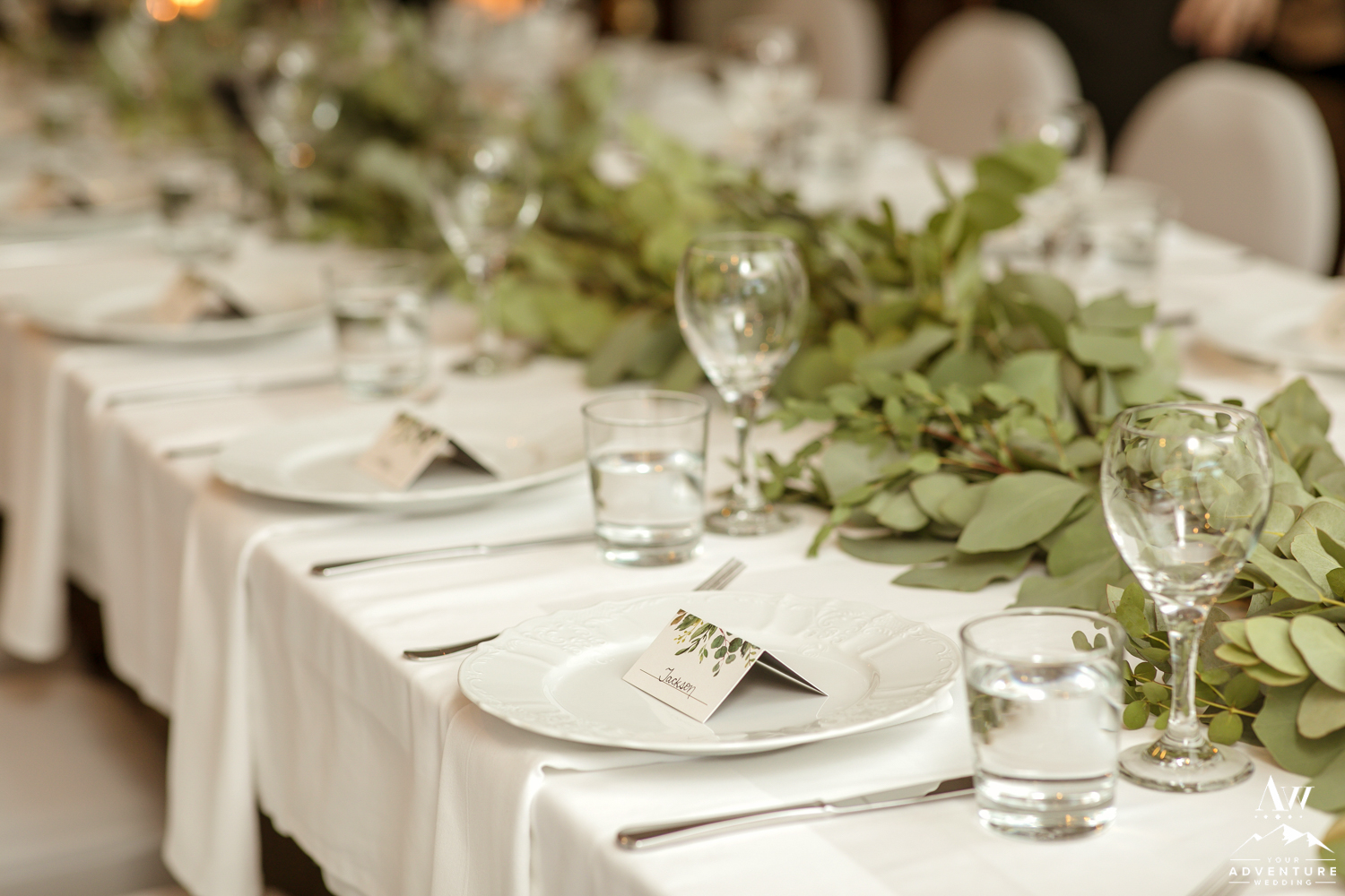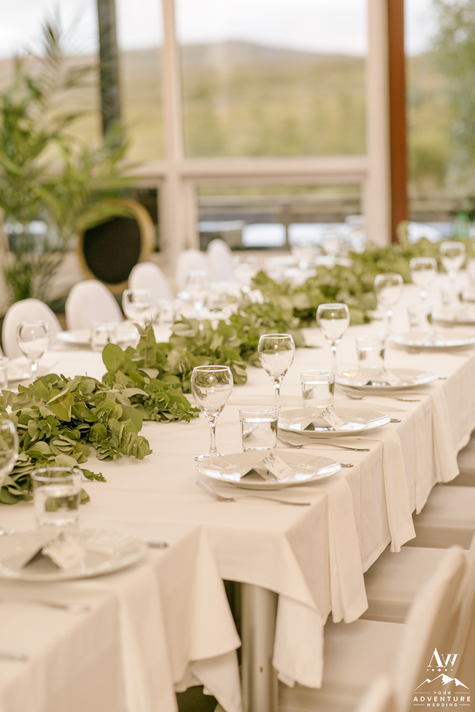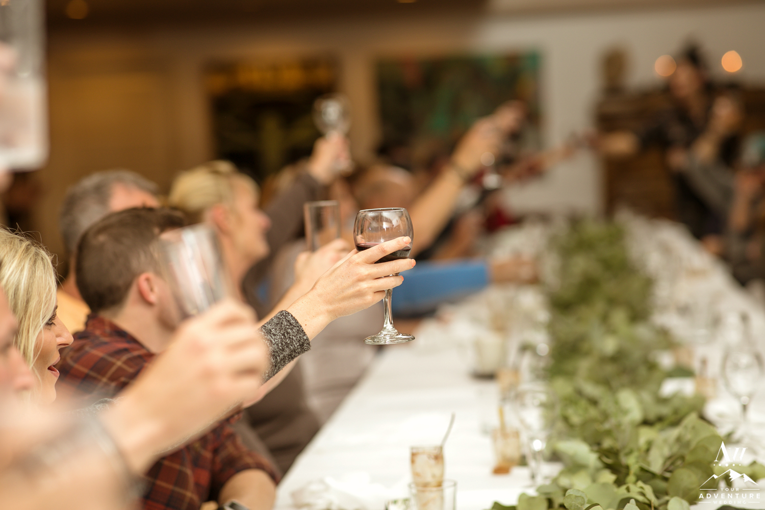 Returning to the lodge shortly after 6:30pm, the group arrived to rest and refresh for an hour. All while the living room, dinning room, and bar area had been transformed into a formal luxury lodge wedding reception space! Note: If having a larger group you will need to hire in additional tables, dishes, glasses, and flatware.