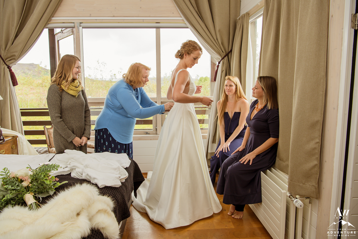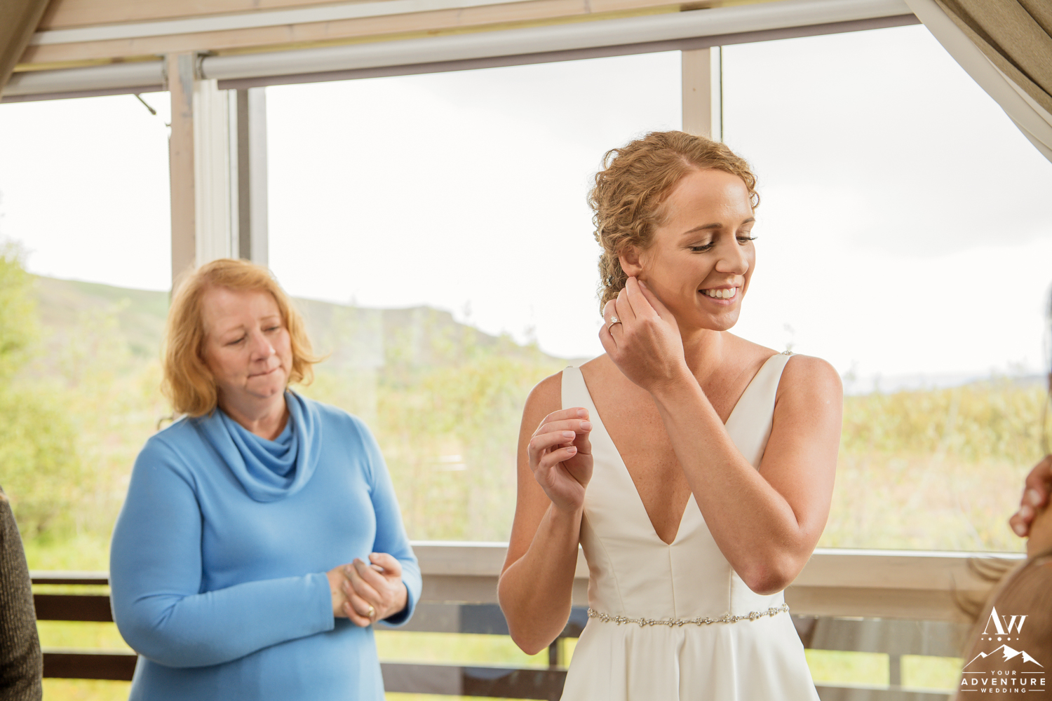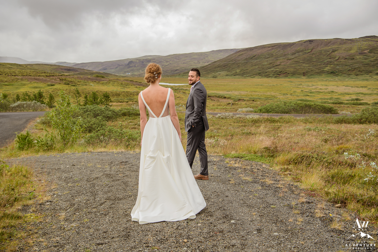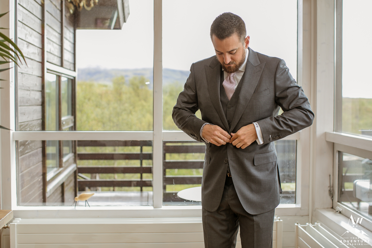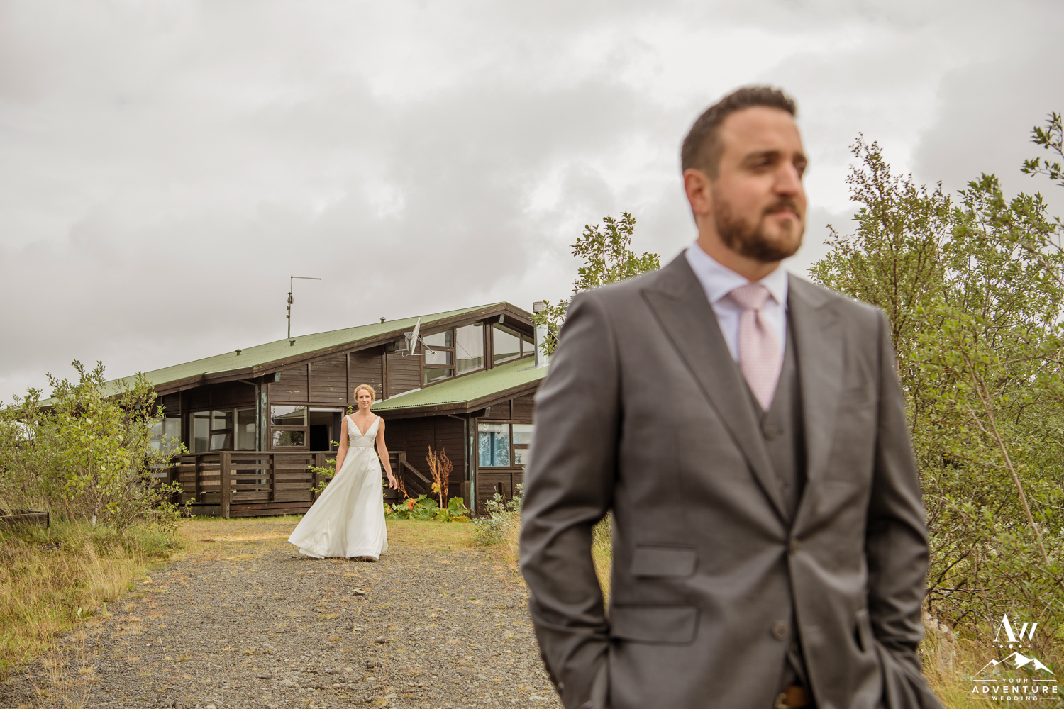 Our Iceland adventure wedding photographers Ann and Christy went right to work on capturing Erin’s fabulous Iceland wedding dress and Jake’s dapper groom details! Totally impressed that their details were totally adventure wedding geared and prepared for rain (hello muck boots!) or shine! High five Erin + Jake!! Right before the group embarked on the adventure Erin + Jake shared a sweet little first look outside of the house.