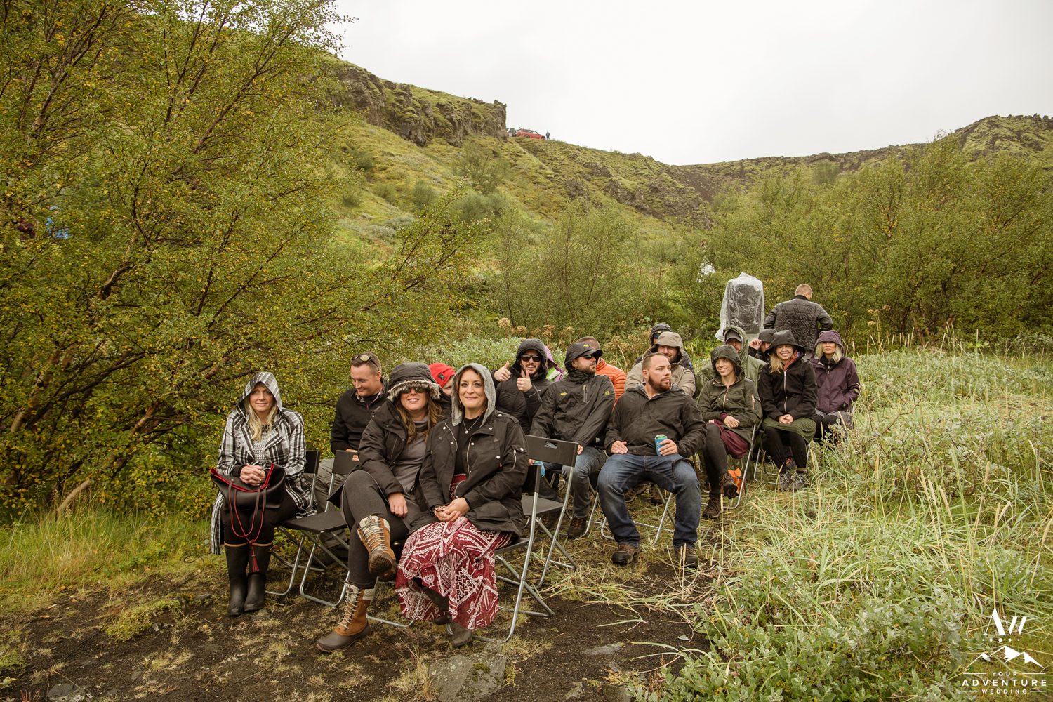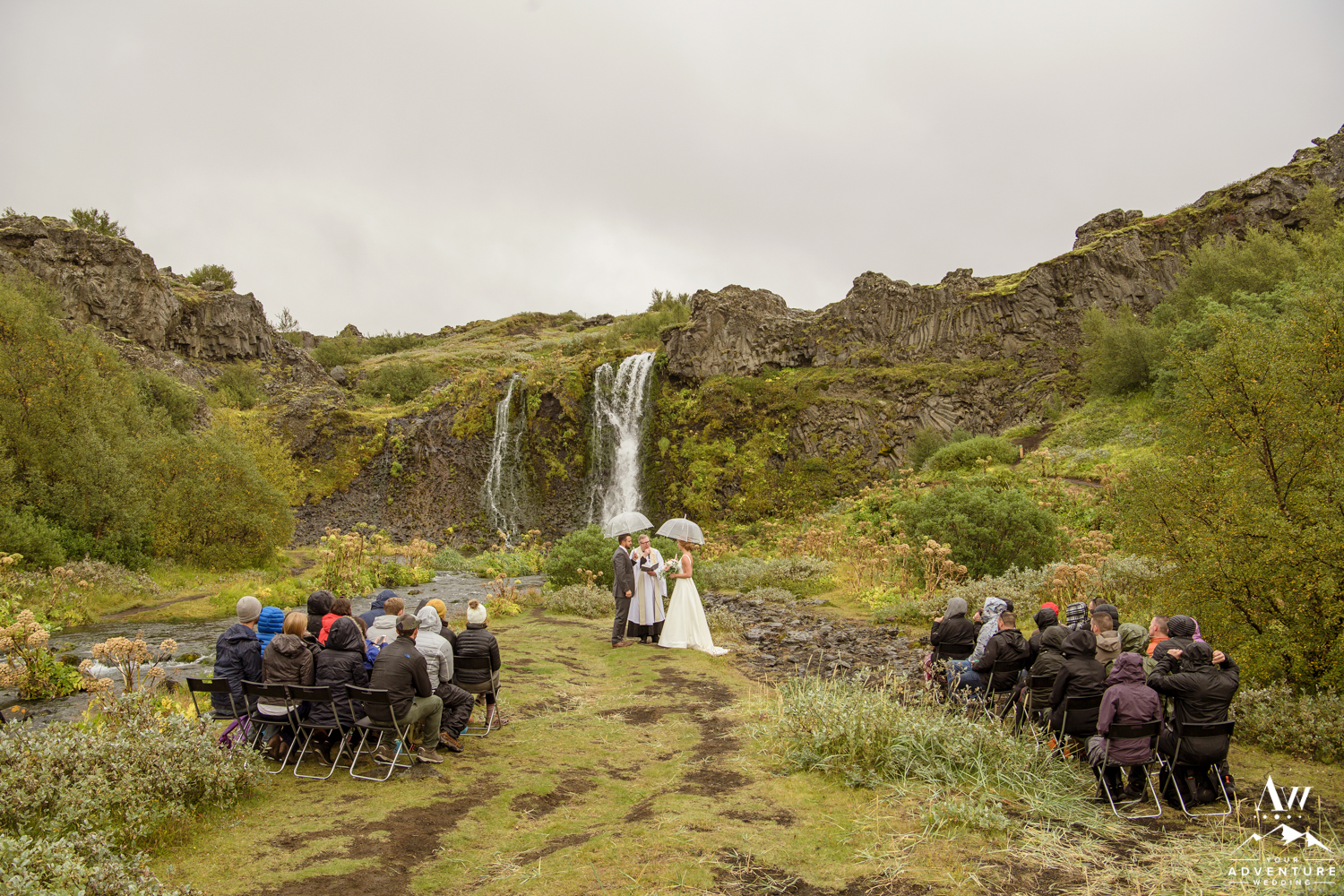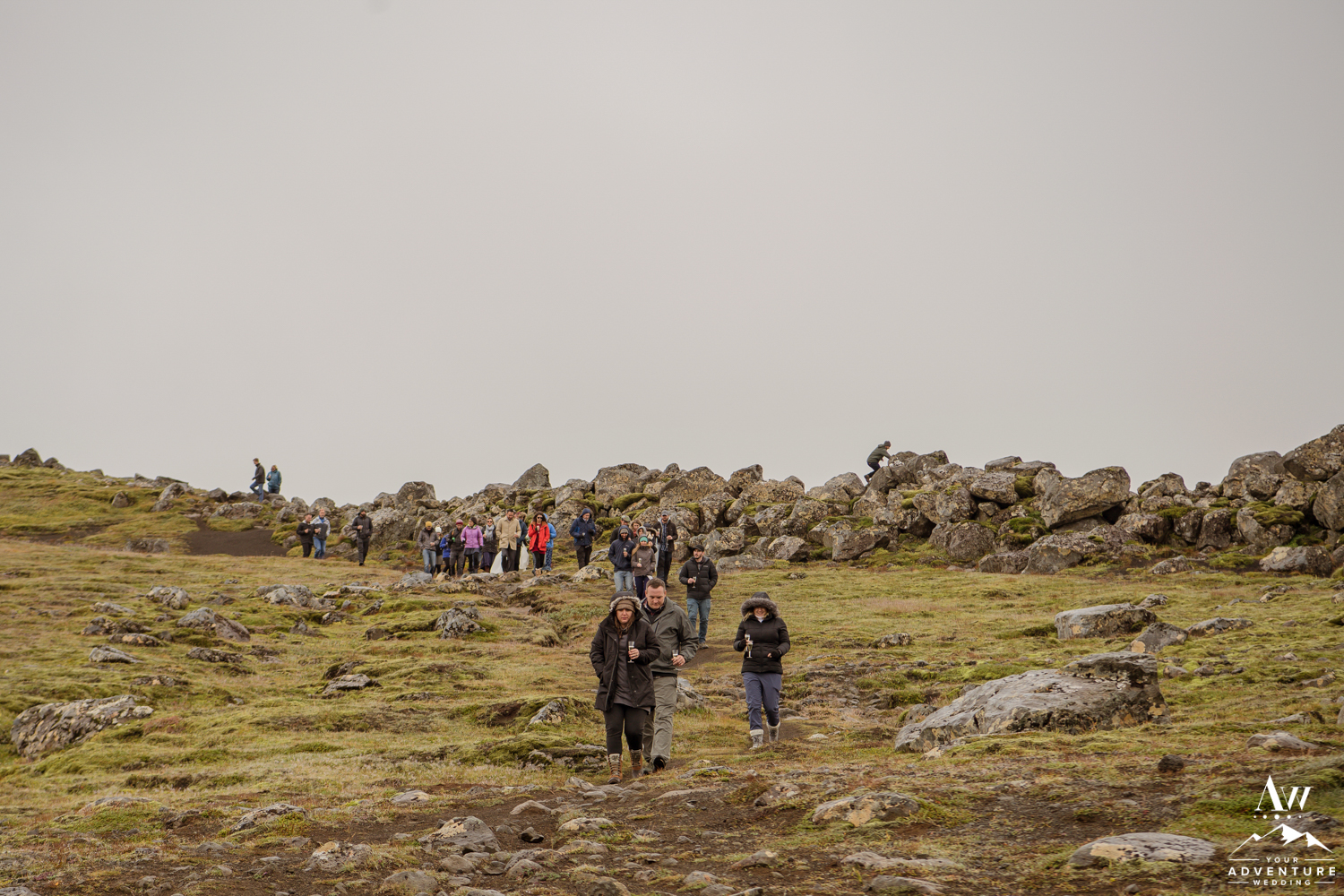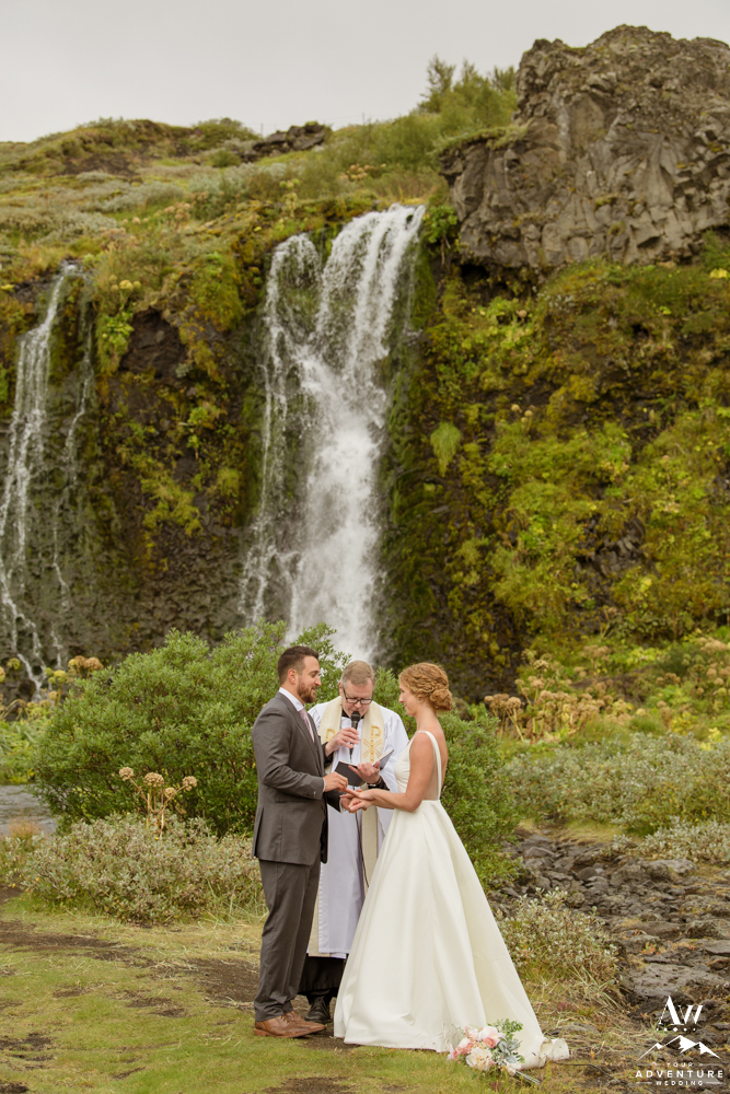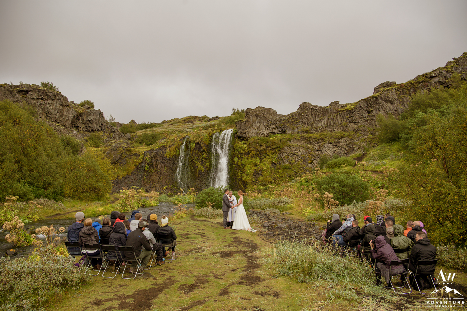 It was important to Erin and Jake to have a ceremony location which we could ensure exclusivity during the ceremony and our team did just that! This sweet offbeat waterfall area sits in a valley where countless waterfalls stream. It was an easy 10-15 minute walk for guests to get down into and the guests were greeted with a seated Iceland wedding ceremony. They held an inspiring wedding ceremony where they said their personal vows to each other as well. Following the ceremony, they had a big group photo op, family photos, and then Erin and Jake parted from their guests for a hike!