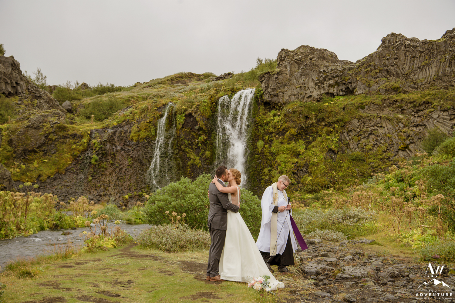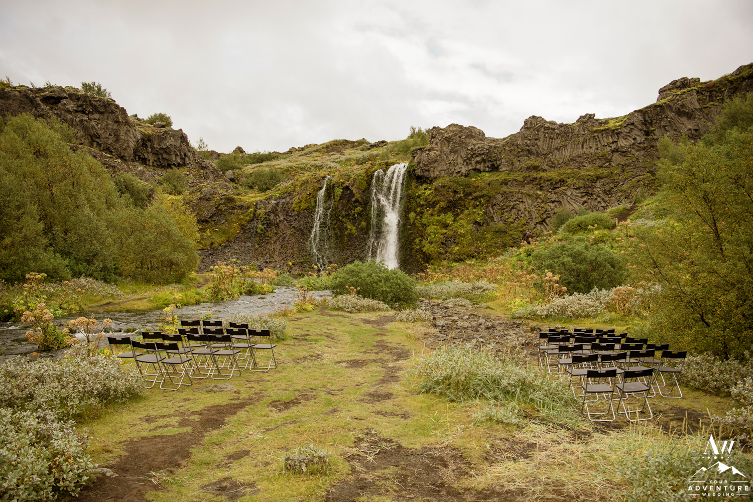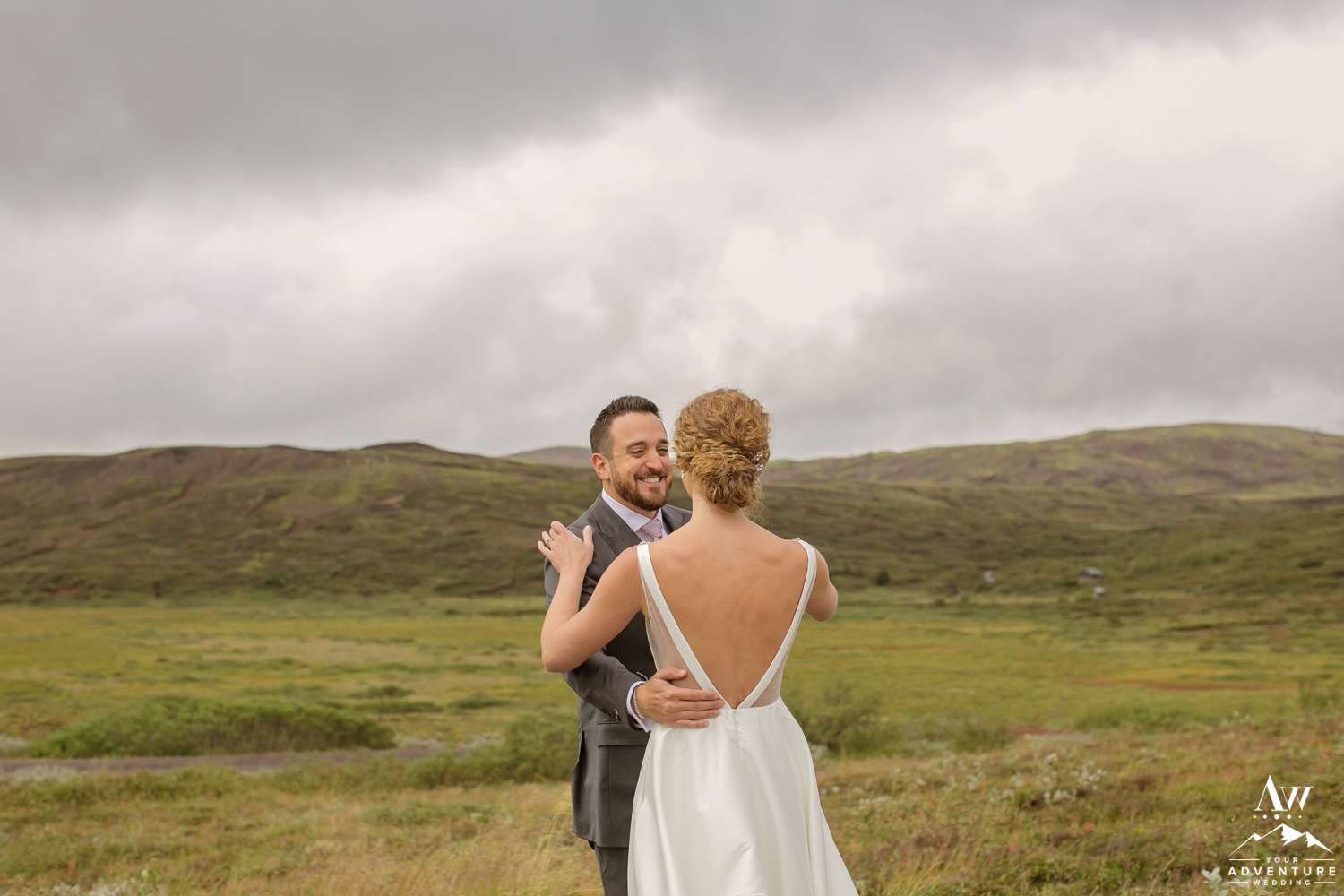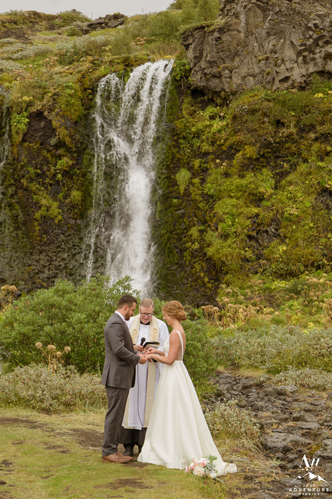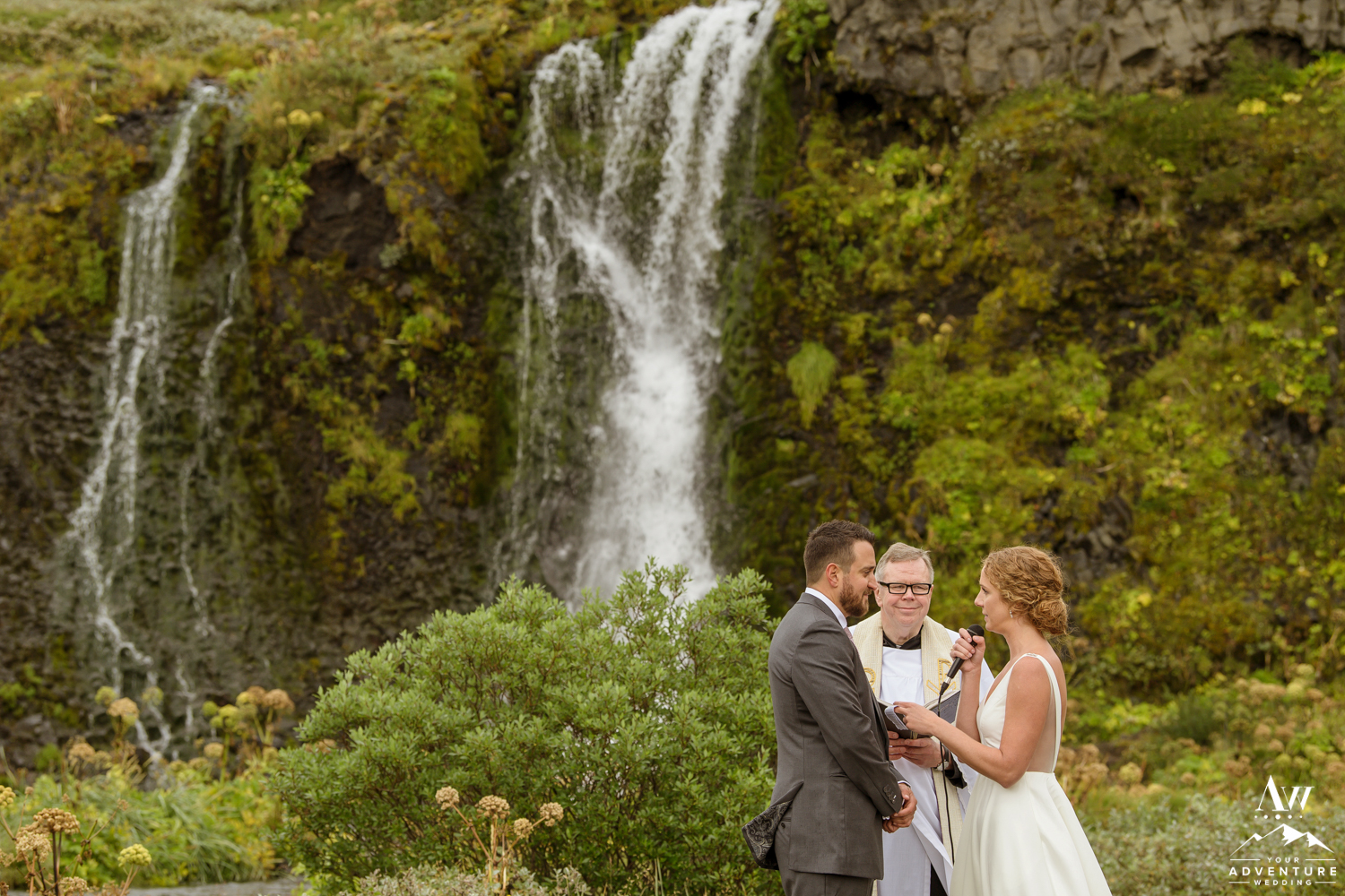 It was important to Erin and Jake to have a ceremony location which we could ensure exclusivity during the ceremony and our team did just that! This sweet offbeat waterfall area sits in a valley where countless waterfalls stream. It was an easy 10-15 minute walk for guests to get down into and the guests were greeted with a seated Iceland wedding ceremony. They held an inspiring wedding ceremony where they said their personal vows to each other as well. Following the ceremony, they had a big group photo op, family photos, and then Erin and Jake parted from their guests for a hike!