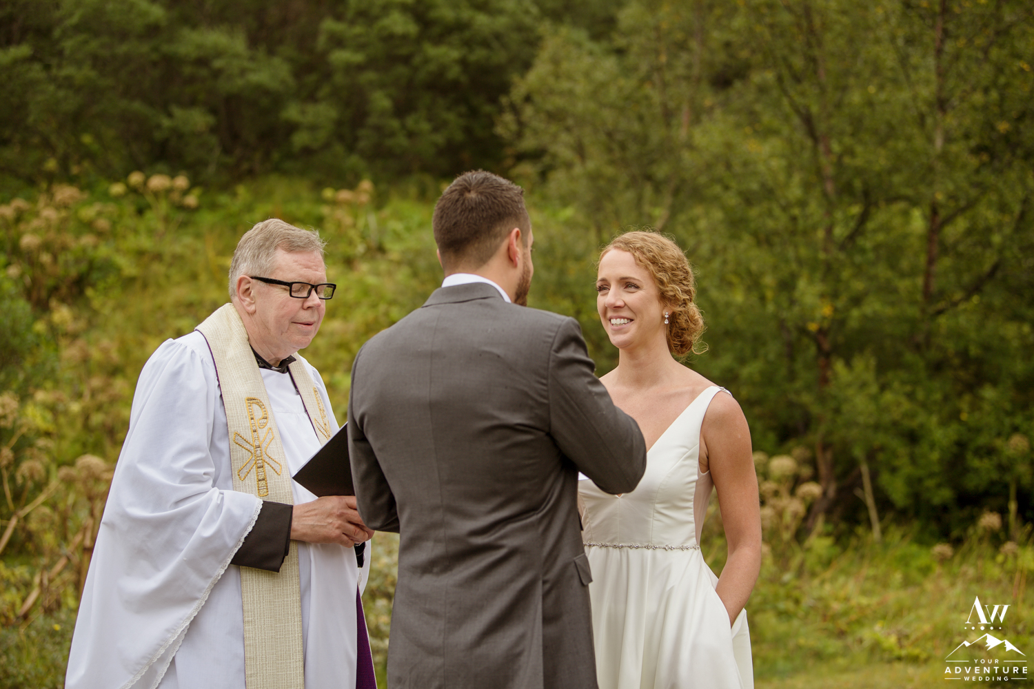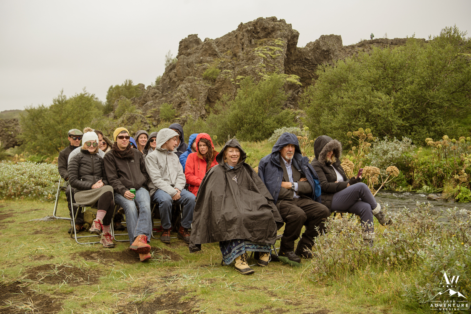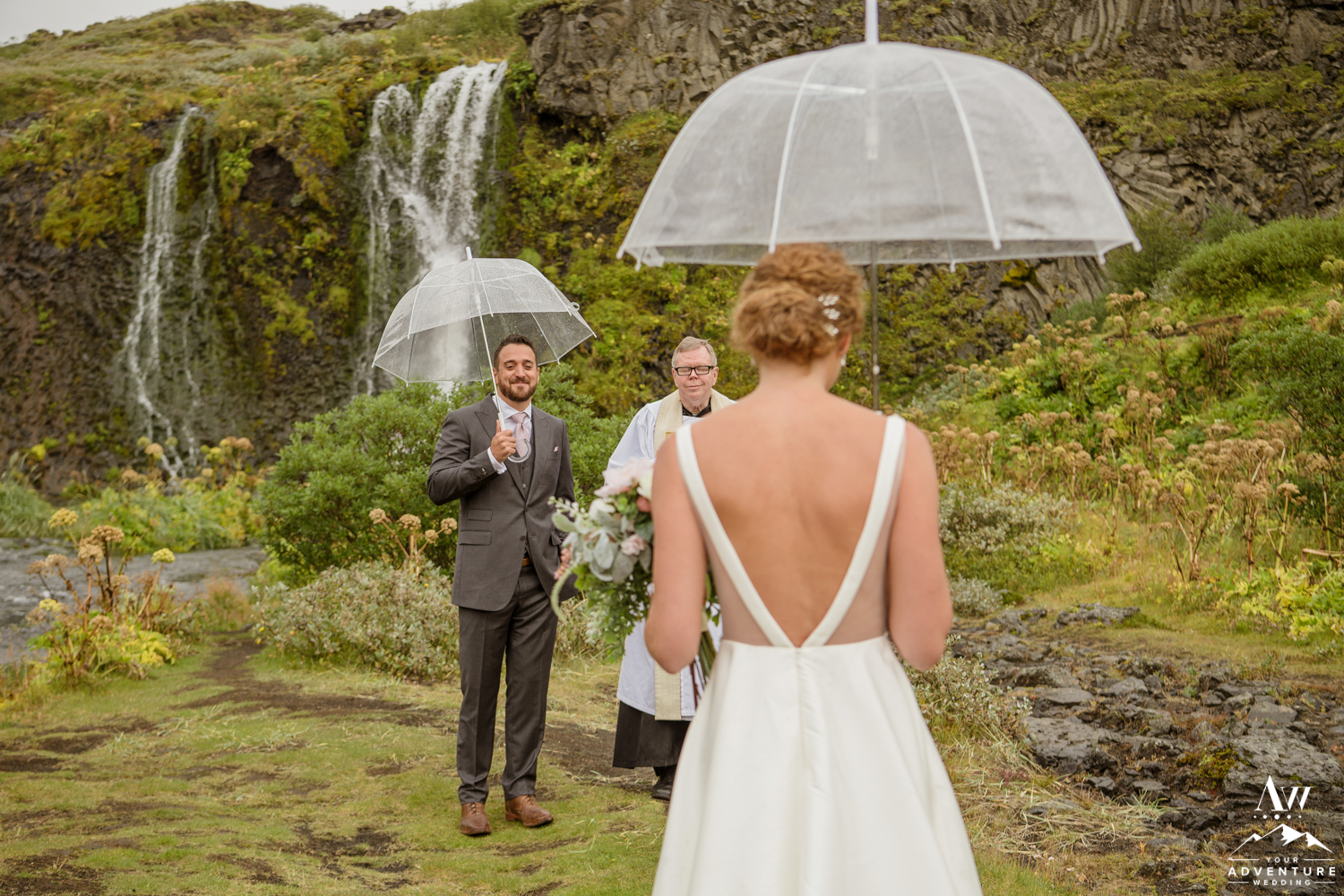 Have you heard that it’s good luck if it rains on your wedding day? They especially say this in Iceland. Many weddings in Iceland end with that, “I just survived my wedding day” kind of feeling. Because of the unruly and sometimes challenging weather conditions! Erin, Jake, and their guests were prepared and had “go bags” in hand just in case! Arriving to the Iceland ceremony location, it was raining but everyone embraced it as they enjoyed the waterfall views!