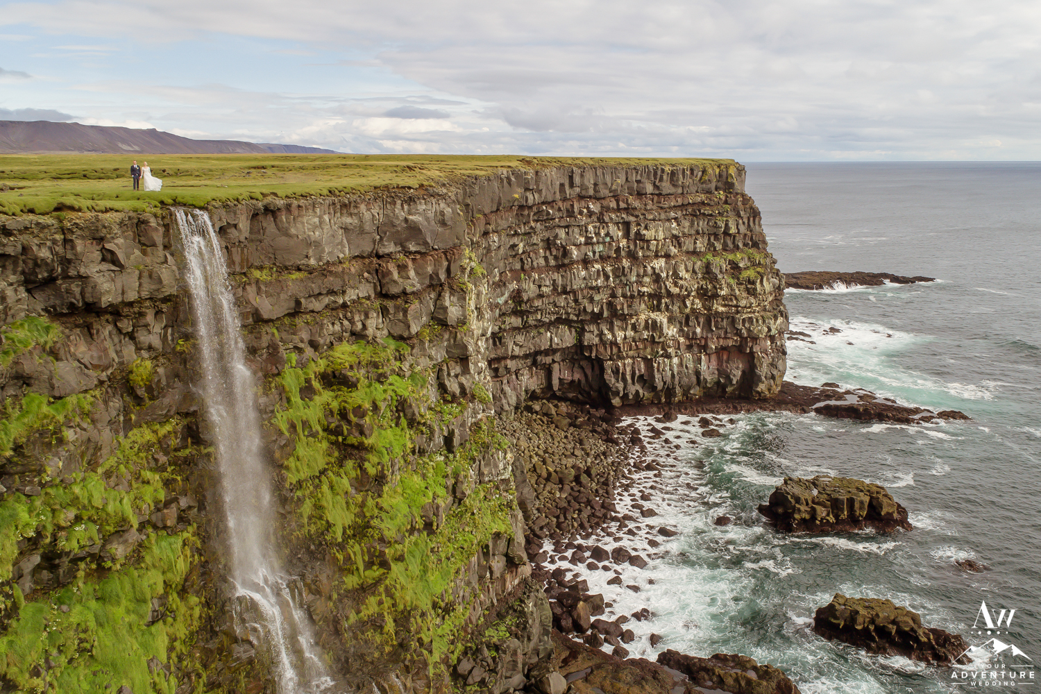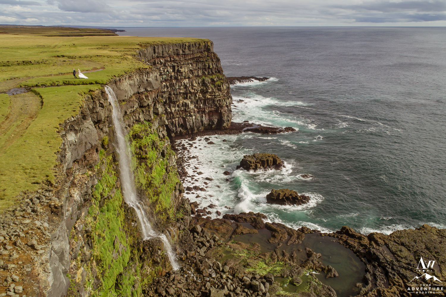Our Iceland wedding photography team love having the opportunity to fly their drone for epic wedding photos! Another set of textured sea cliffs and waterfall on private property was ideal for it! Conditions were amazing and Laura and Oli looked incredible up there exploring and bird watching without the Reykjanes Peninsula!