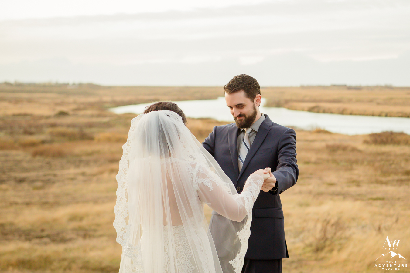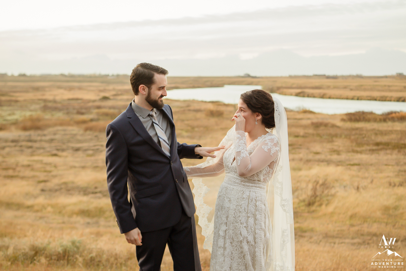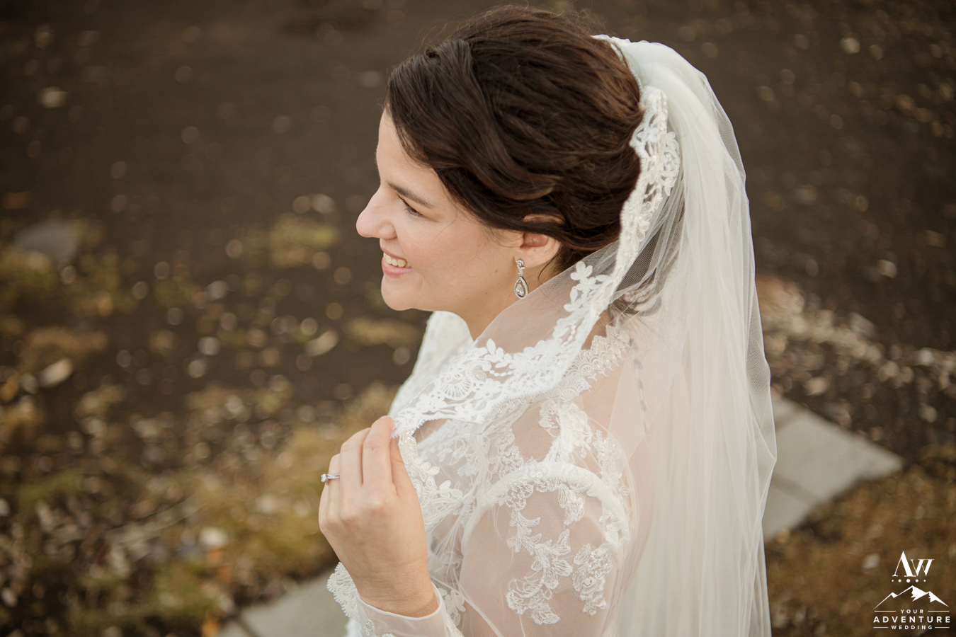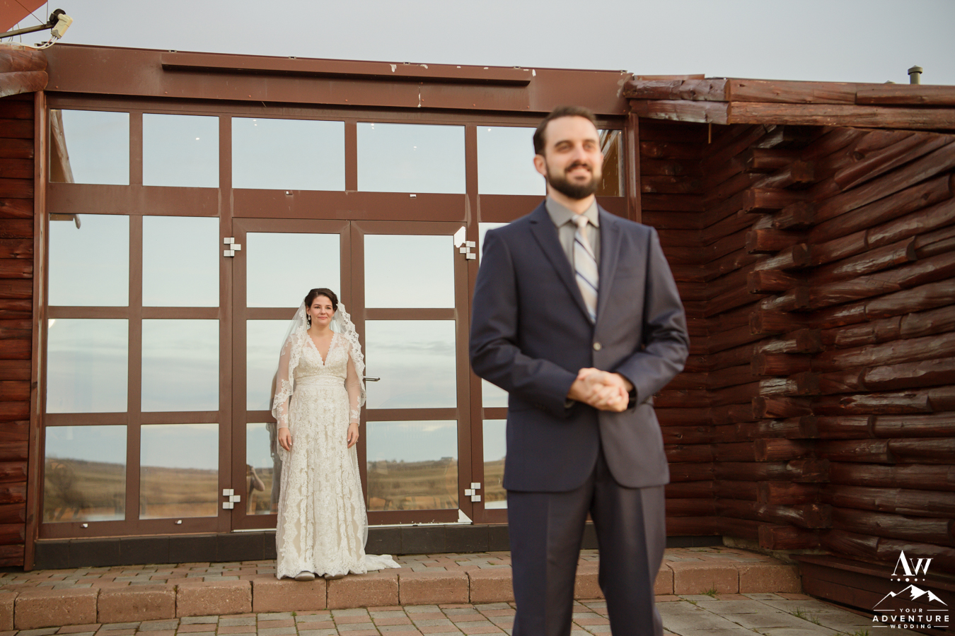 Casey’s Iceland wedding dress has intricate lace details and she paired it with Sorel snow boots and tall rain boots for different parts of the adventure day. Both Casey and Zach were fully prepared to hike through rivers all day and couldn’t wait for their mountain top wedding ceremony! Likewise, after packing their “go bags” they took the opportunity as the super jeep was arriving to have a quite “first look.”