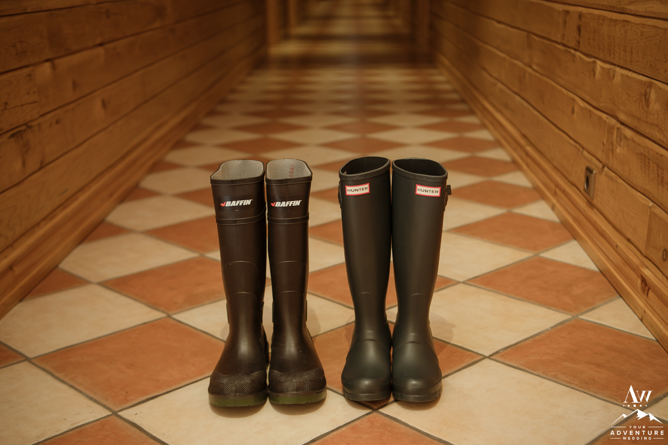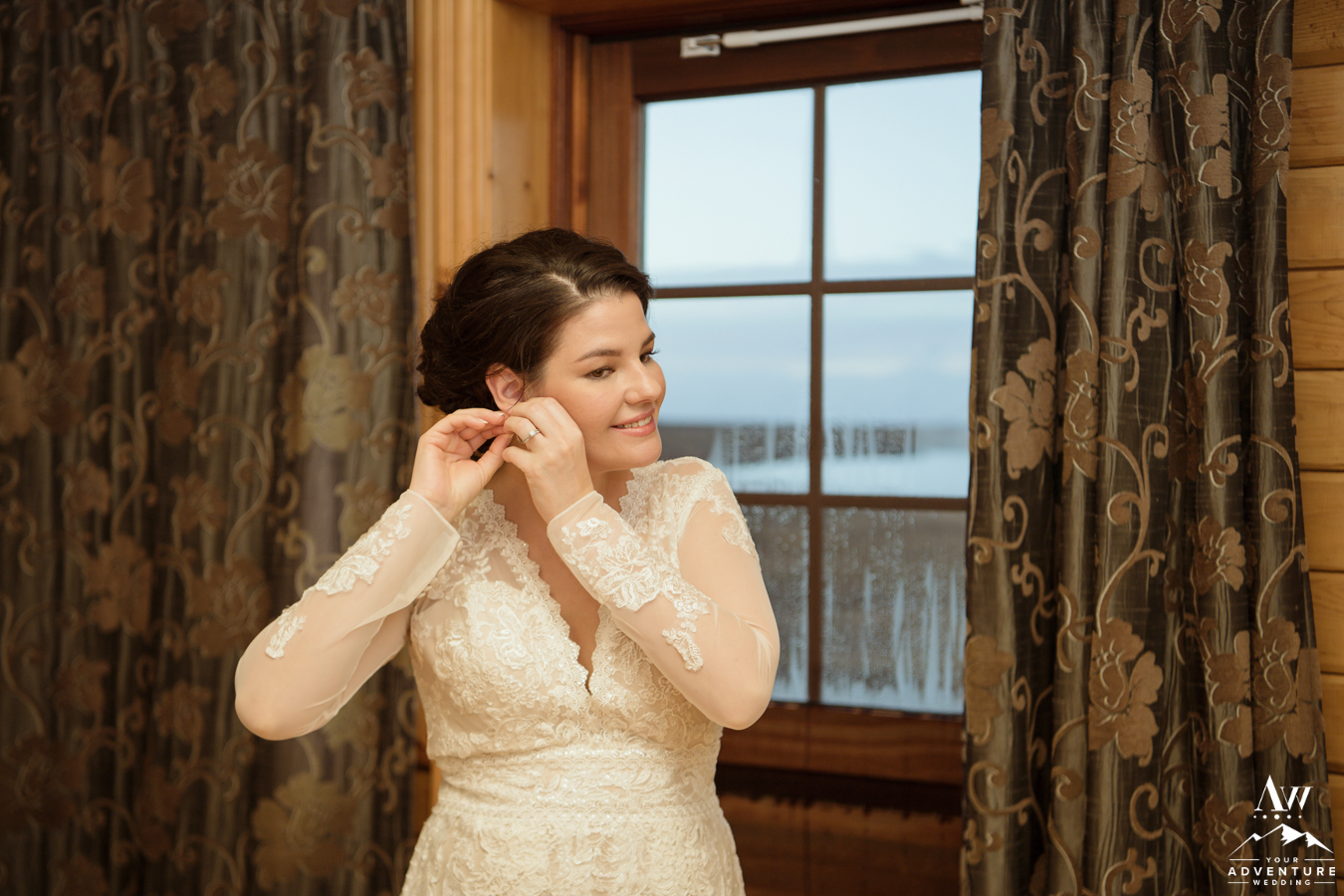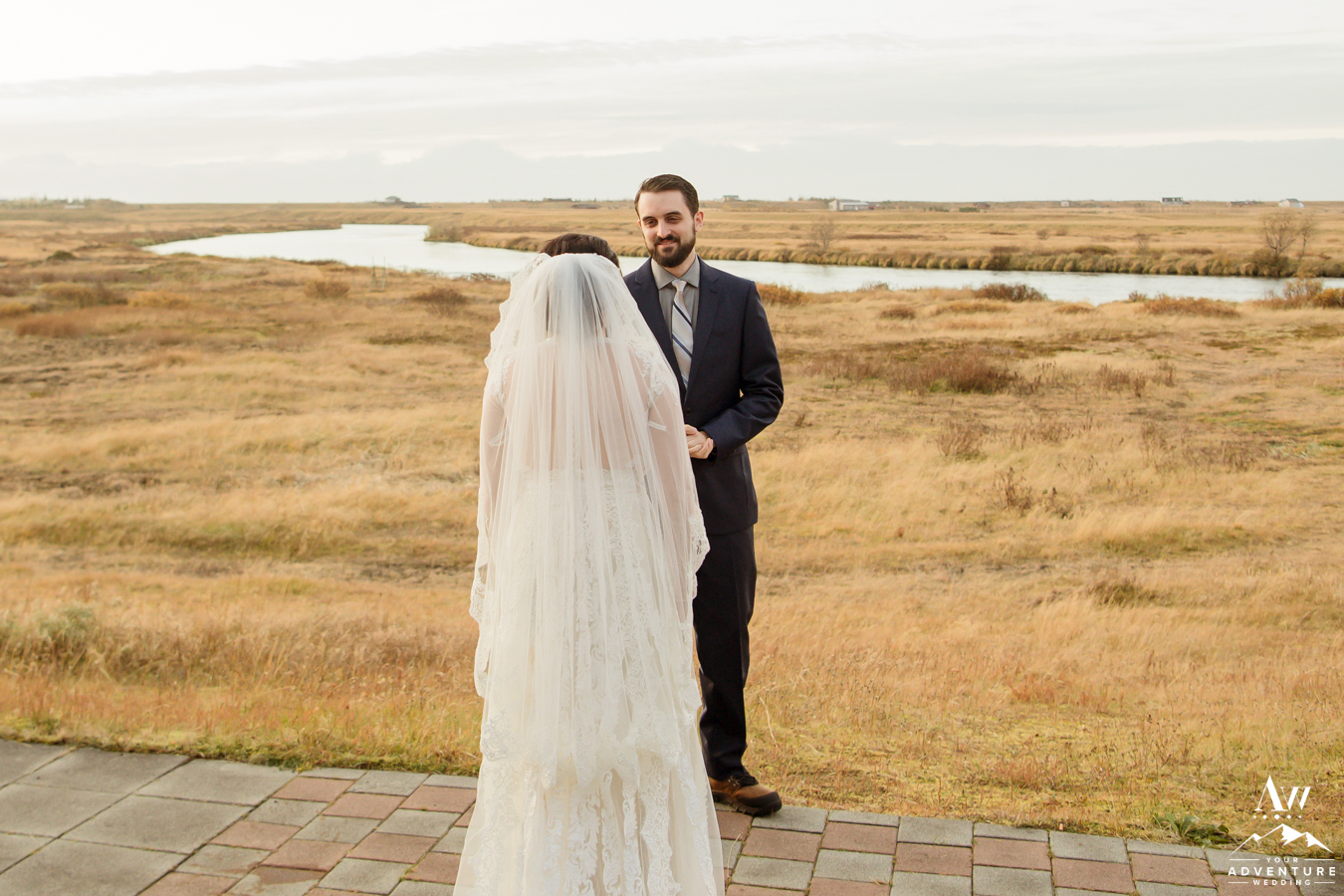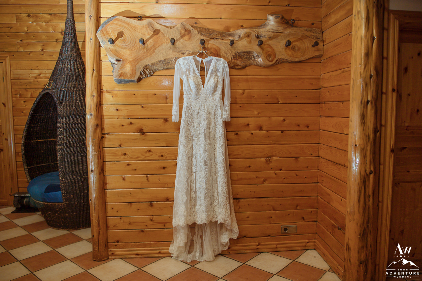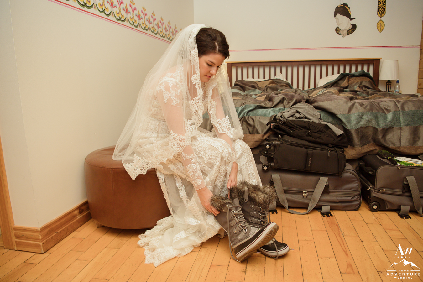 Casey’s Iceland wedding dress has intricate lace details and she paired it with Sorel snow boots and tall rain boots for different parts of the adventure day. Both Casey and Zach were fully prepared to hike through rivers all day and couldn’t wait for their mountain top wedding ceremony! Likewise, after packing their “go bags” they took the opportunity as the super jeep was arriving to have a quite “first look.”