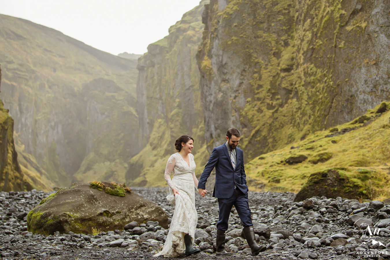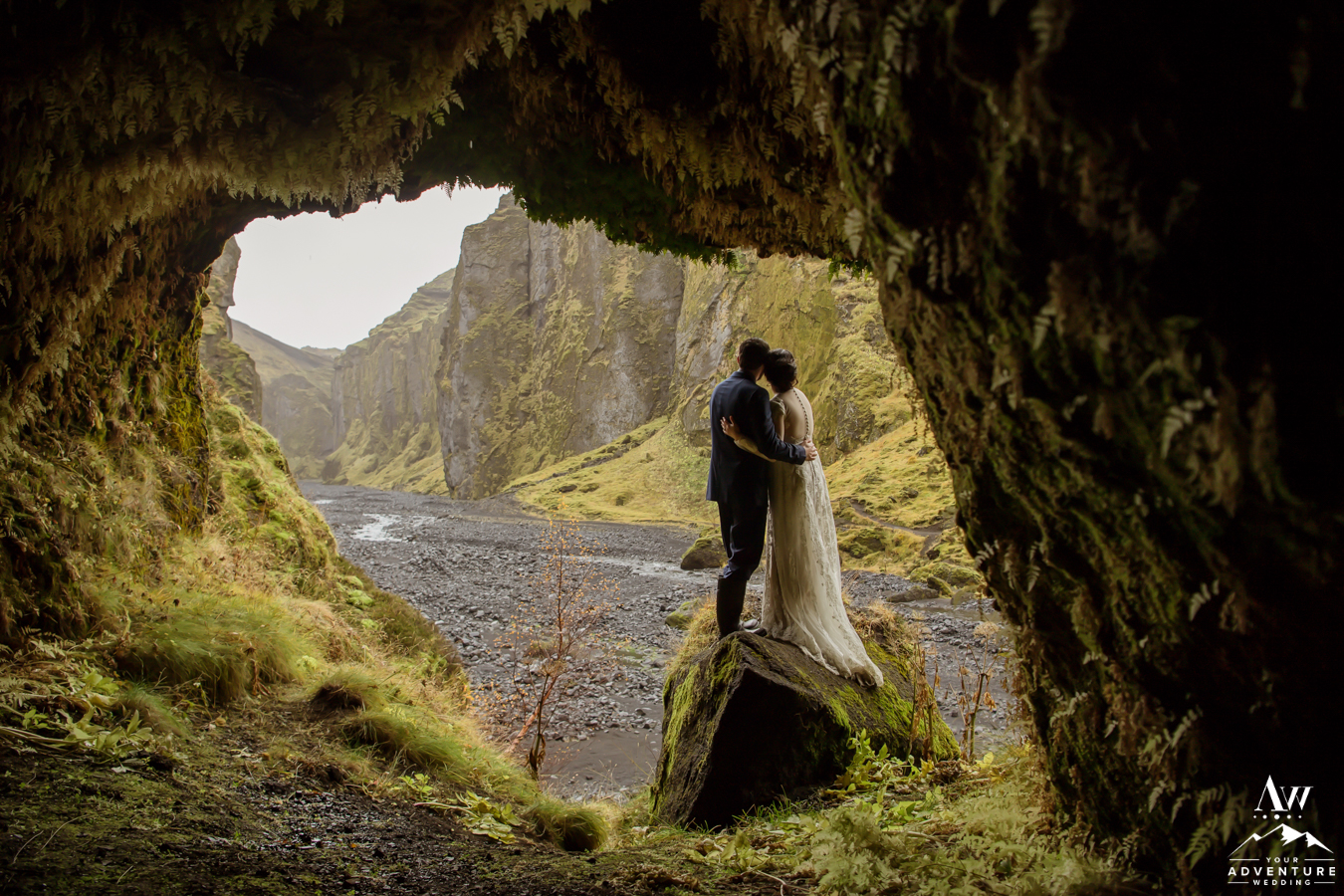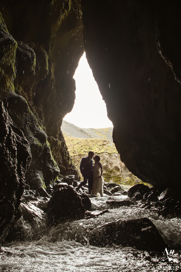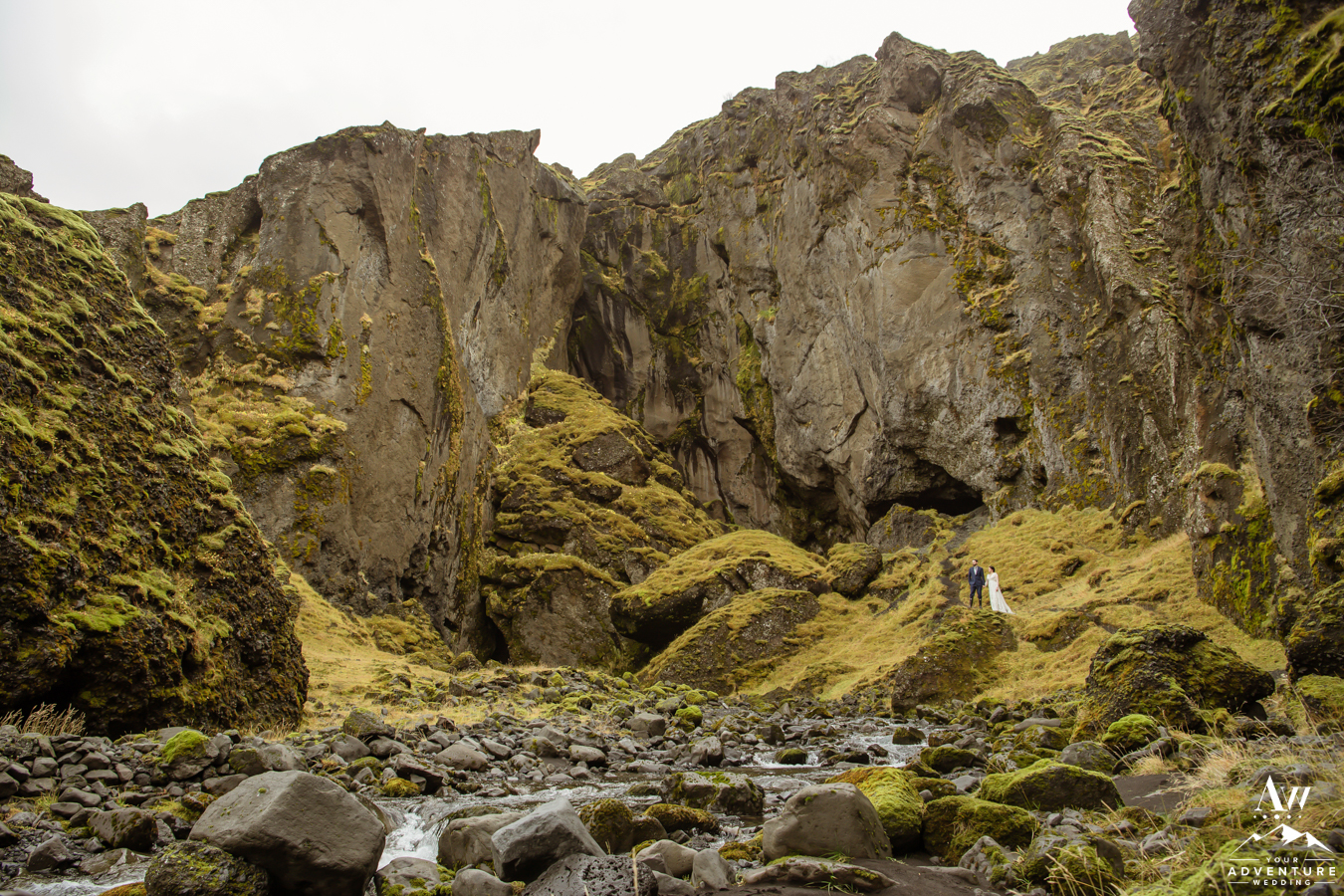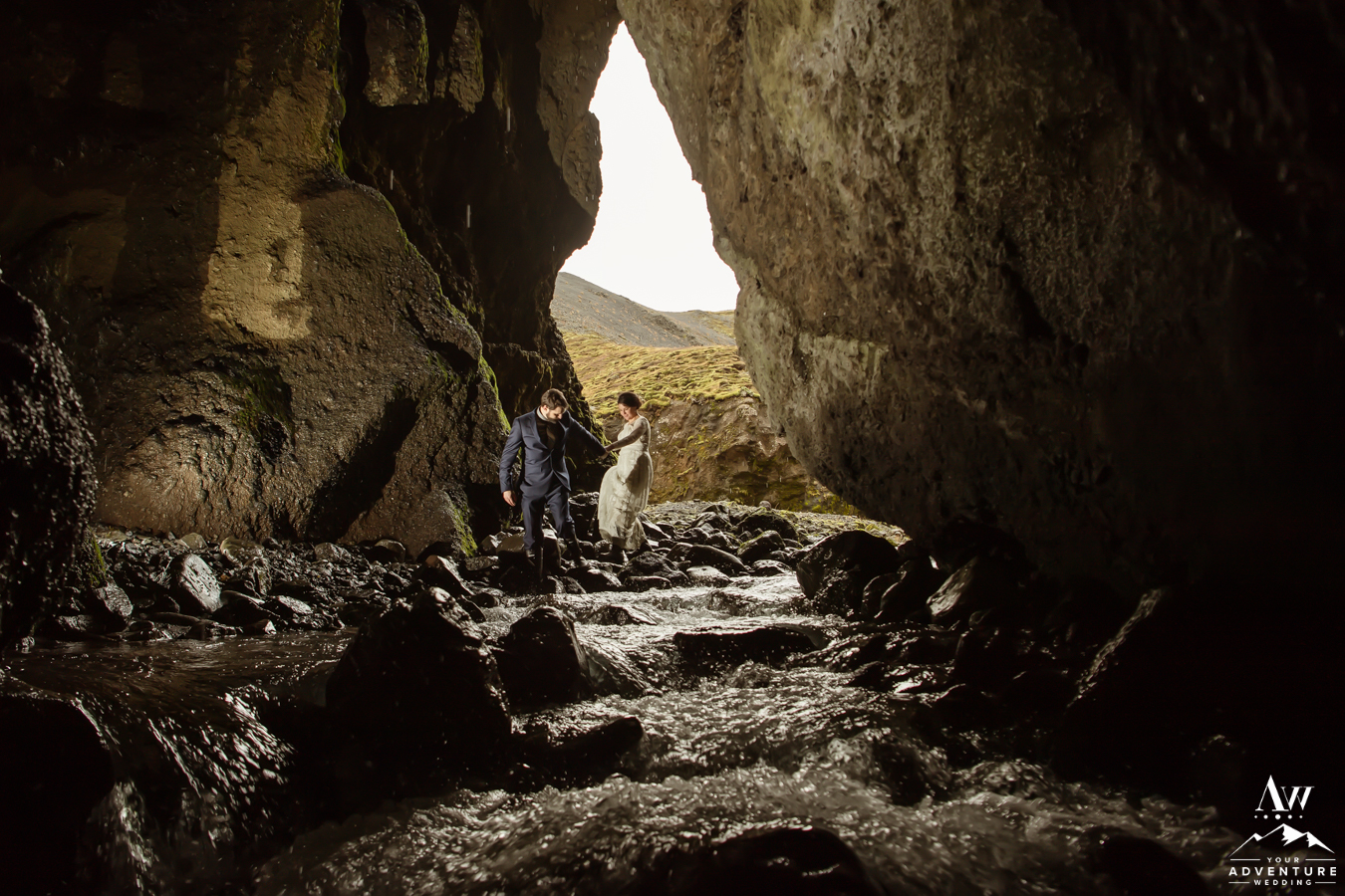 During their hiking elopement adventure they slide on their rubber boots on to cross several rivers! They freaking loved exploring the cave and canyon!! This fabulous Iceland wedding location also gave our adventurous elopement photographer the opportunity do some drone wedding photos! Such epic memories for Casey and Zach to cherish!!