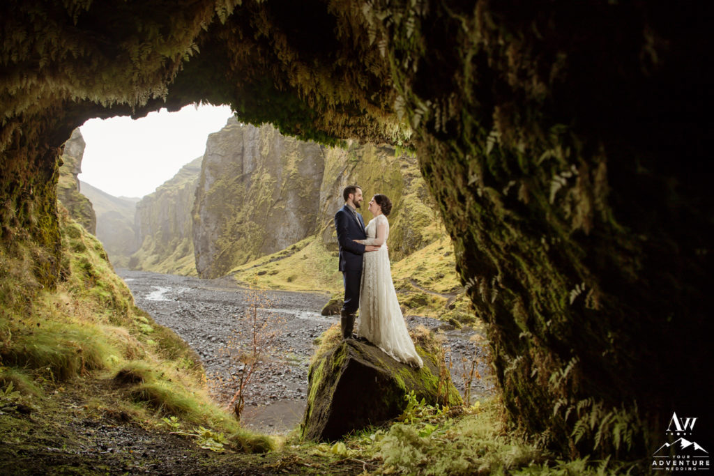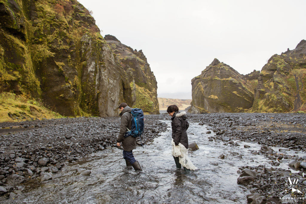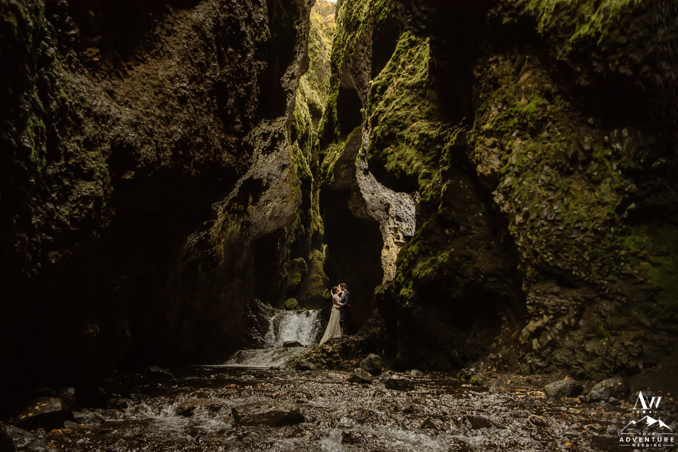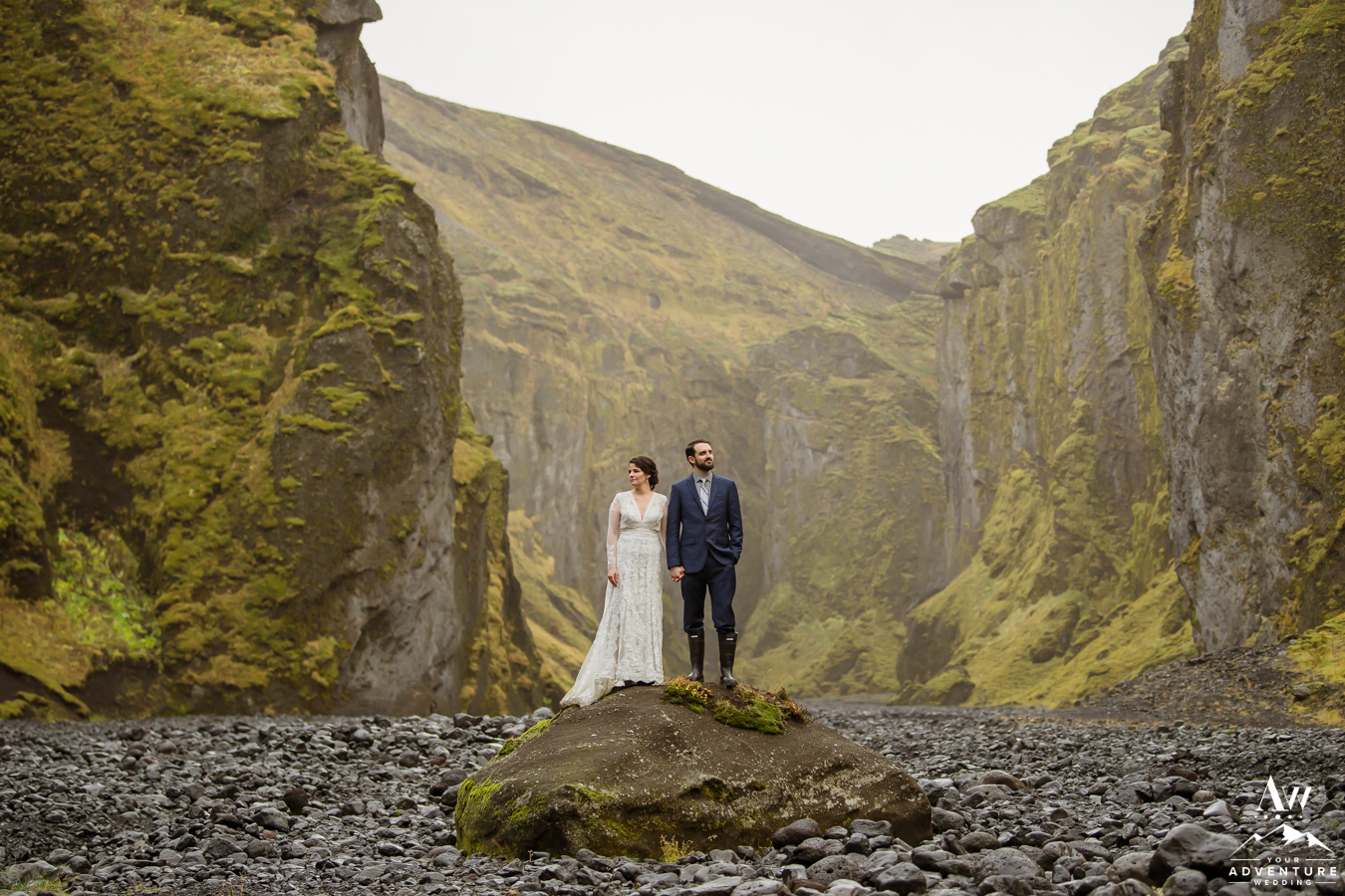 During their hiking elopement adventure they slide on their rubber boots on to cross several rivers! They freaking loved exploring the cave and canyon!! This fabulous Iceland wedding location also gave our adventurous elopement photographer the opportunity do some drone wedding photos! Such epic memories for Casey and Zach to cherish!!