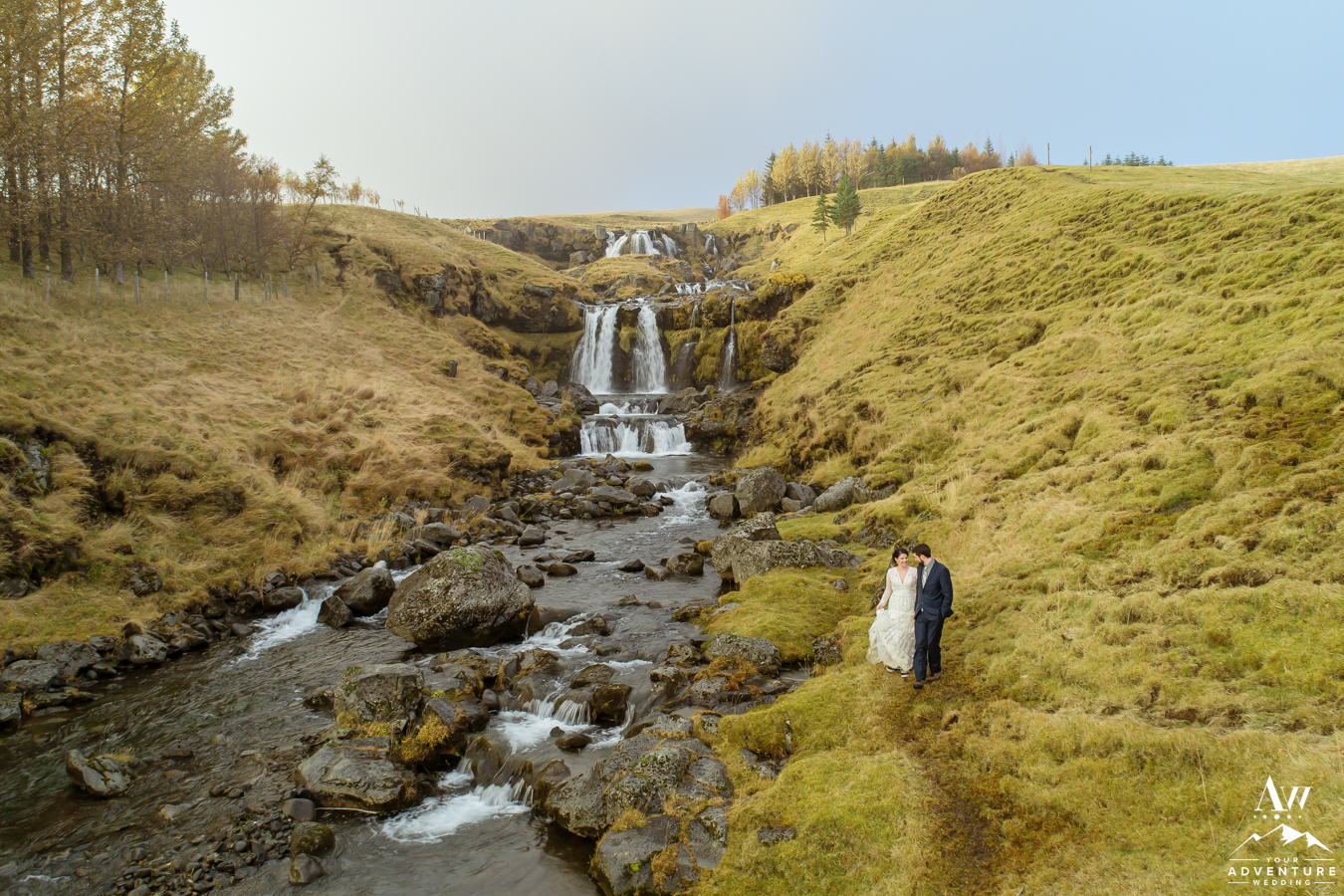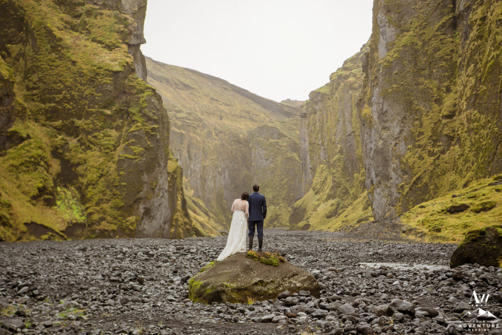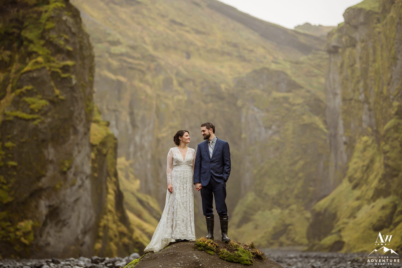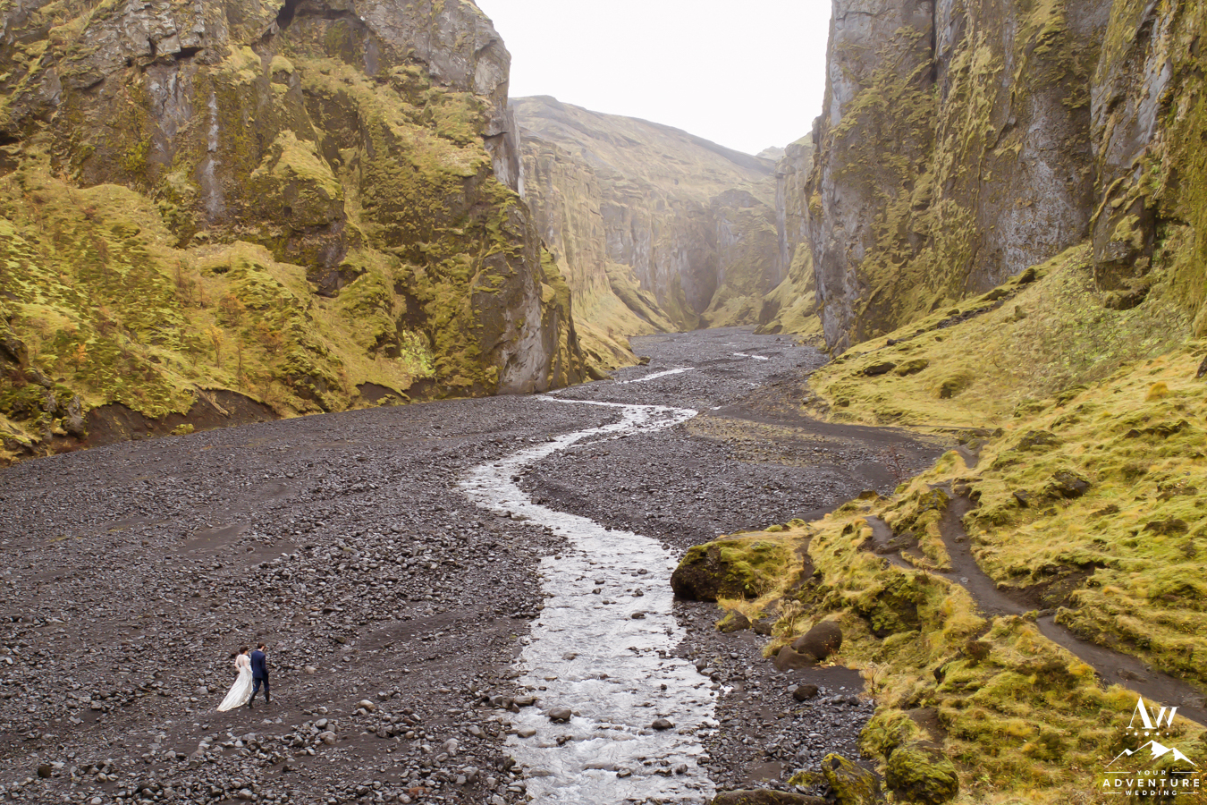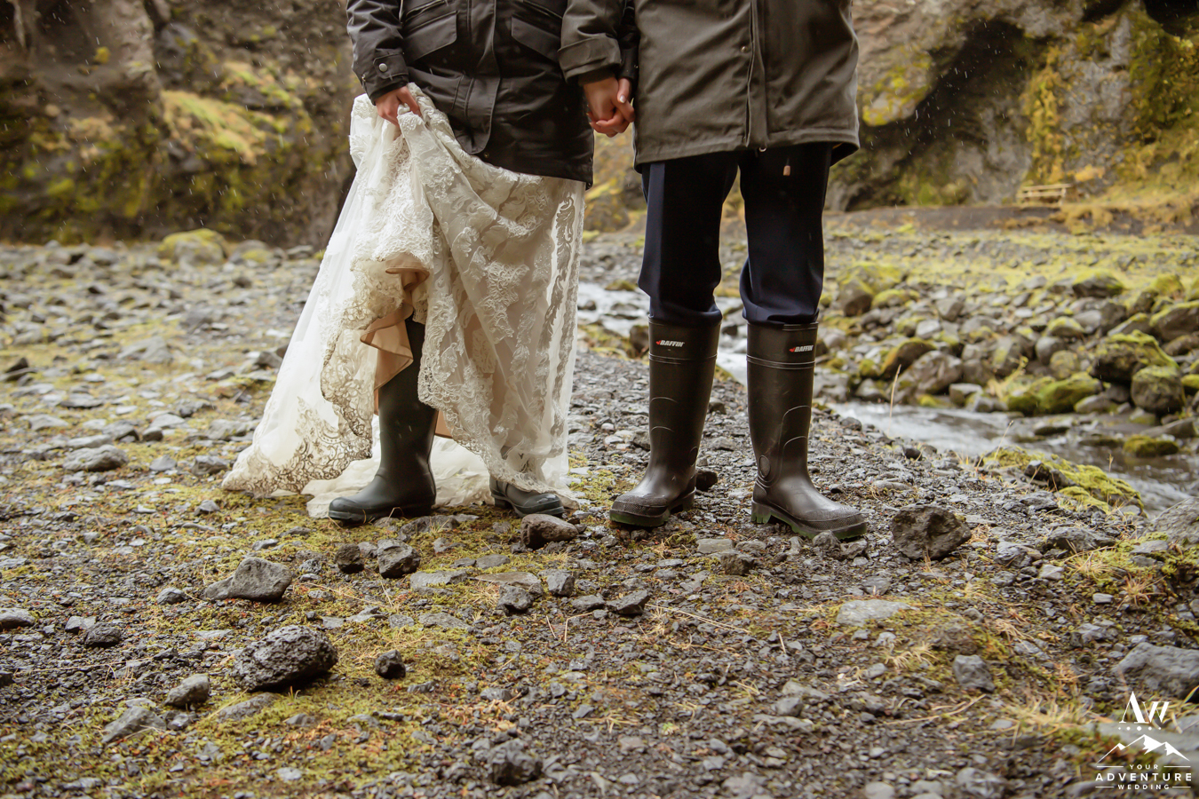 During their hiking elopement adventure they slide on their rubber boots on to cross several rivers! They freaking loved exploring the cave and canyon!! This fabulous Iceland wedding location also gave our adventurous elopement photographer the opportunity do some drone wedding photos! Such epic memories for Casey and Zach to cherish!!