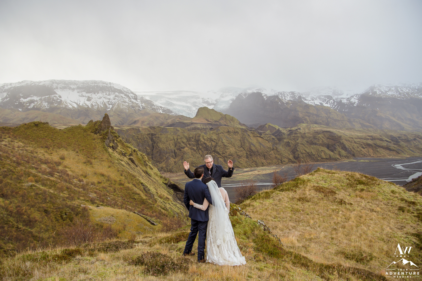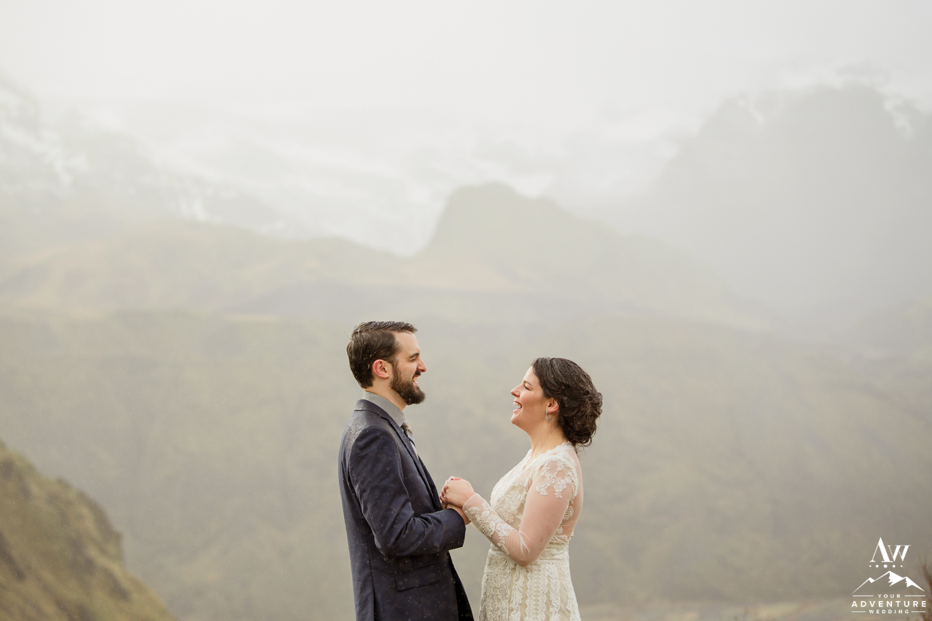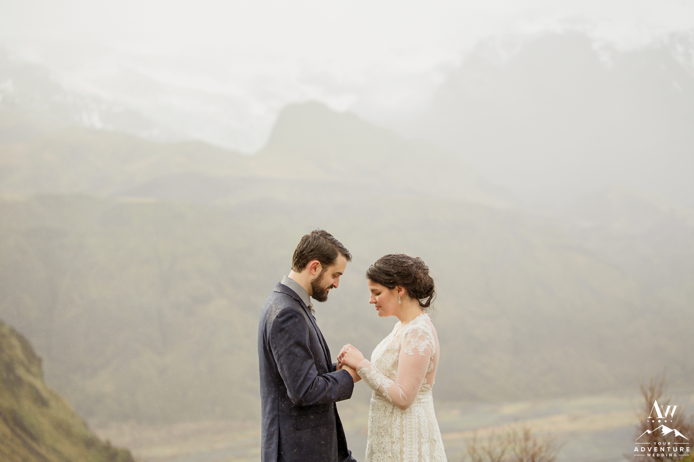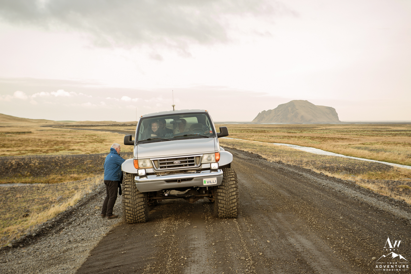 Previously, as we alluded to before, many of the mountains in Iceland are easy hiked in 30-60 minutes. For Zach and Casey’s elopement in Iceland we were on our way to one that offers a stunning view and excellent adventure on the way… Hello super jeep deep river crossings! Unlike other celebrants that perform wedding ceremonies in Iceland. Our favorite Pastor is willing to hike up mountains, seriously he totally rocks! Also he is willing to craft amazing mountain top wedding ceremonies in the rain!