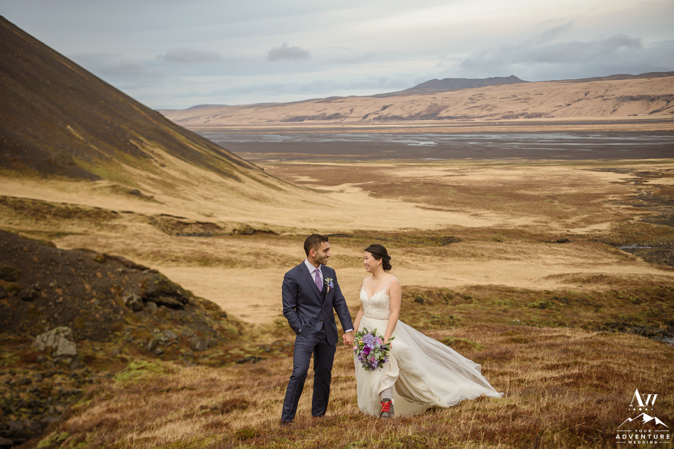 By using up every inch of daylight, we begin and end the day in darkness on the main road once we exit the highlands. In addition to that though, out Iceland elopement photographers, always keep the door open for random stops though in case of a beautifully lit mountain for adventurous wedding photos! A lovely way to end their trekking elopement hand in hand discovering a new mountain together!