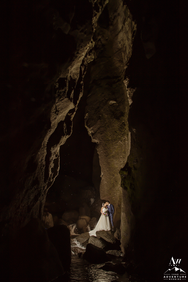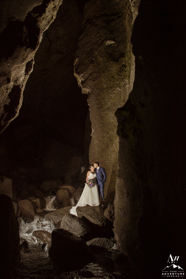 Second to waterfalls, caves are our next favorite type of Iceland wedding location to adventure to. Keeping with the theme of embarking on a trekking elopement in Iceland, Asad and Josephine were stoked for the next location! For sure they would get that token “I earned this” feeling at the end of spot! Woot, and this place did not disappoint! River crossings, wide canyon, caves, glacier views, canyon cave waterfall, ugh so many amazing landscape features!
