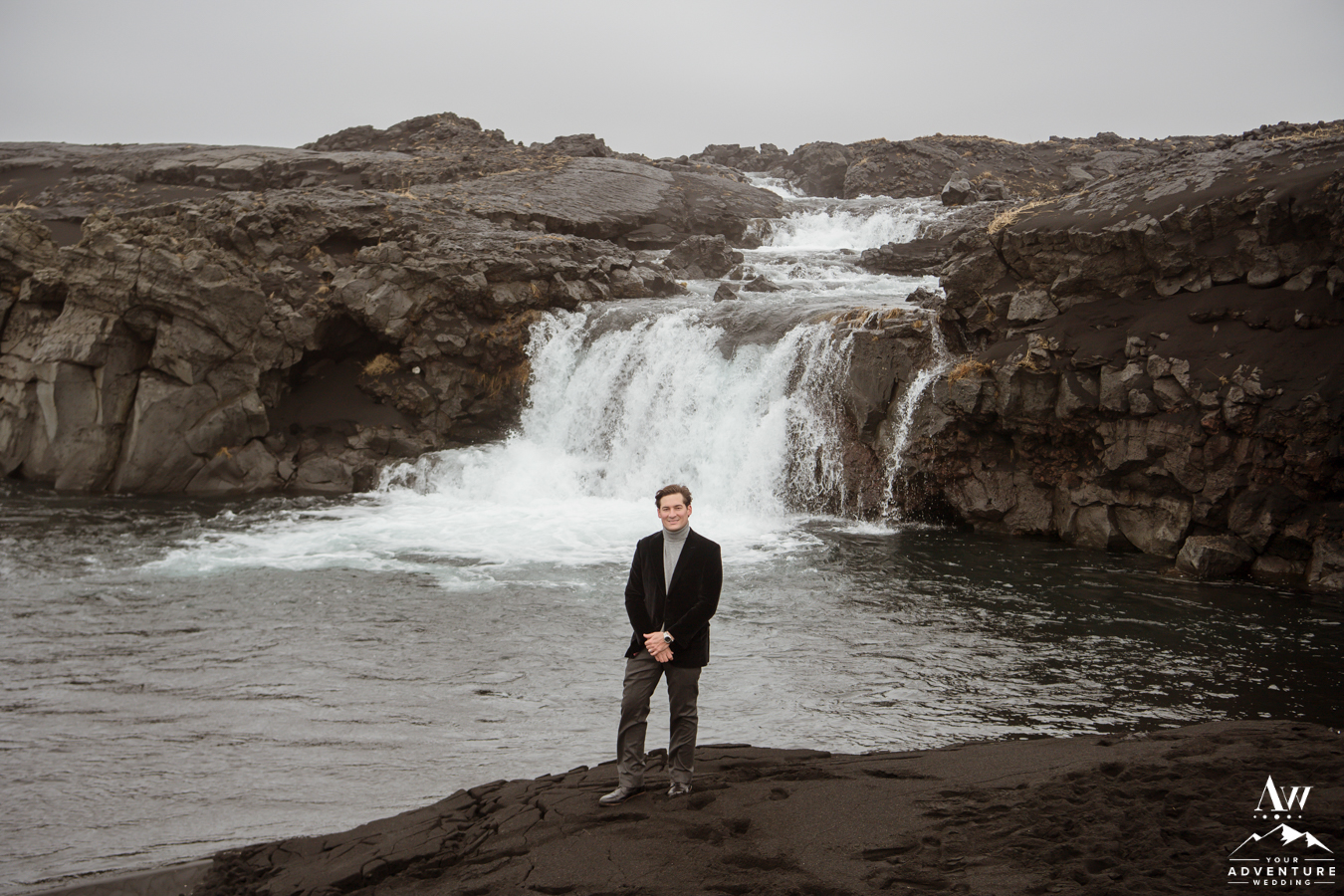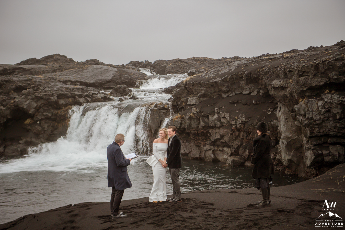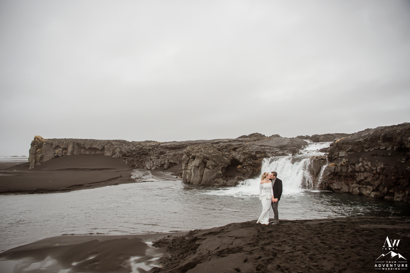 By hiring our team, you get both wedding planning and an Iceland elopement photographer. Our adventure wedding photographers are super experienced with all of our Iceland wedding locations. Totally a must because weather, light and water levels can change dramatically and they know the best spots if that happens. Always thinking plan A, B, C, and D regardless to ensure the very best Iceland wedding photos and exploration! In short, once the ceremony concluded, the newlyweds explored around the Iceland private black beach wedding waterfall area. Cherishing every second of it!