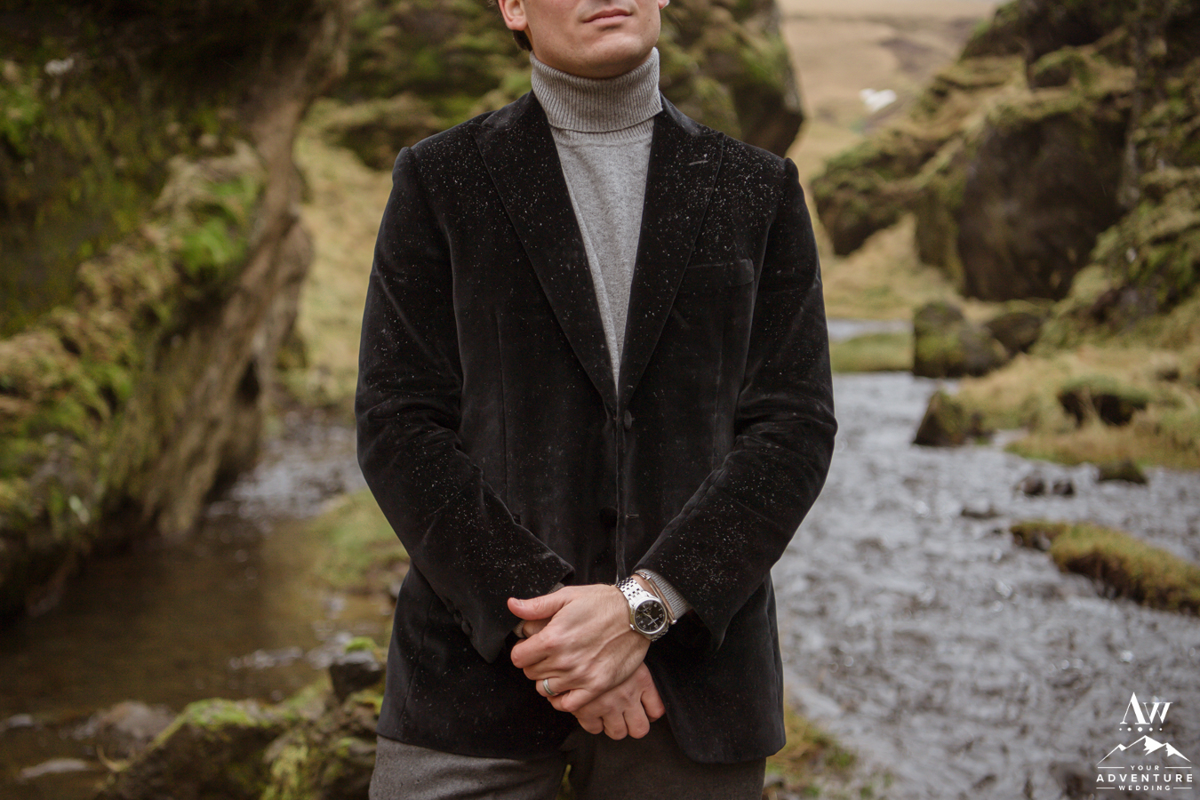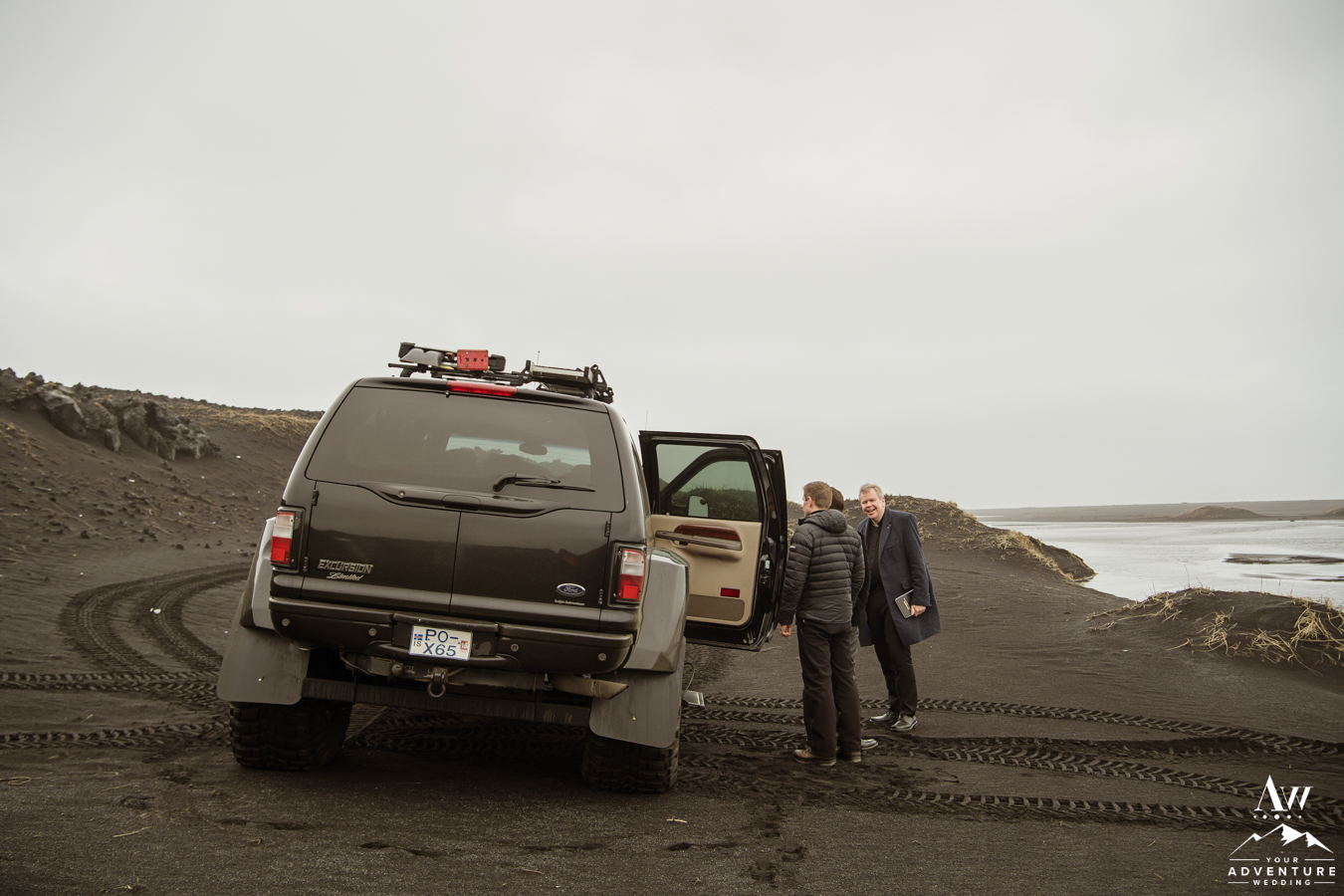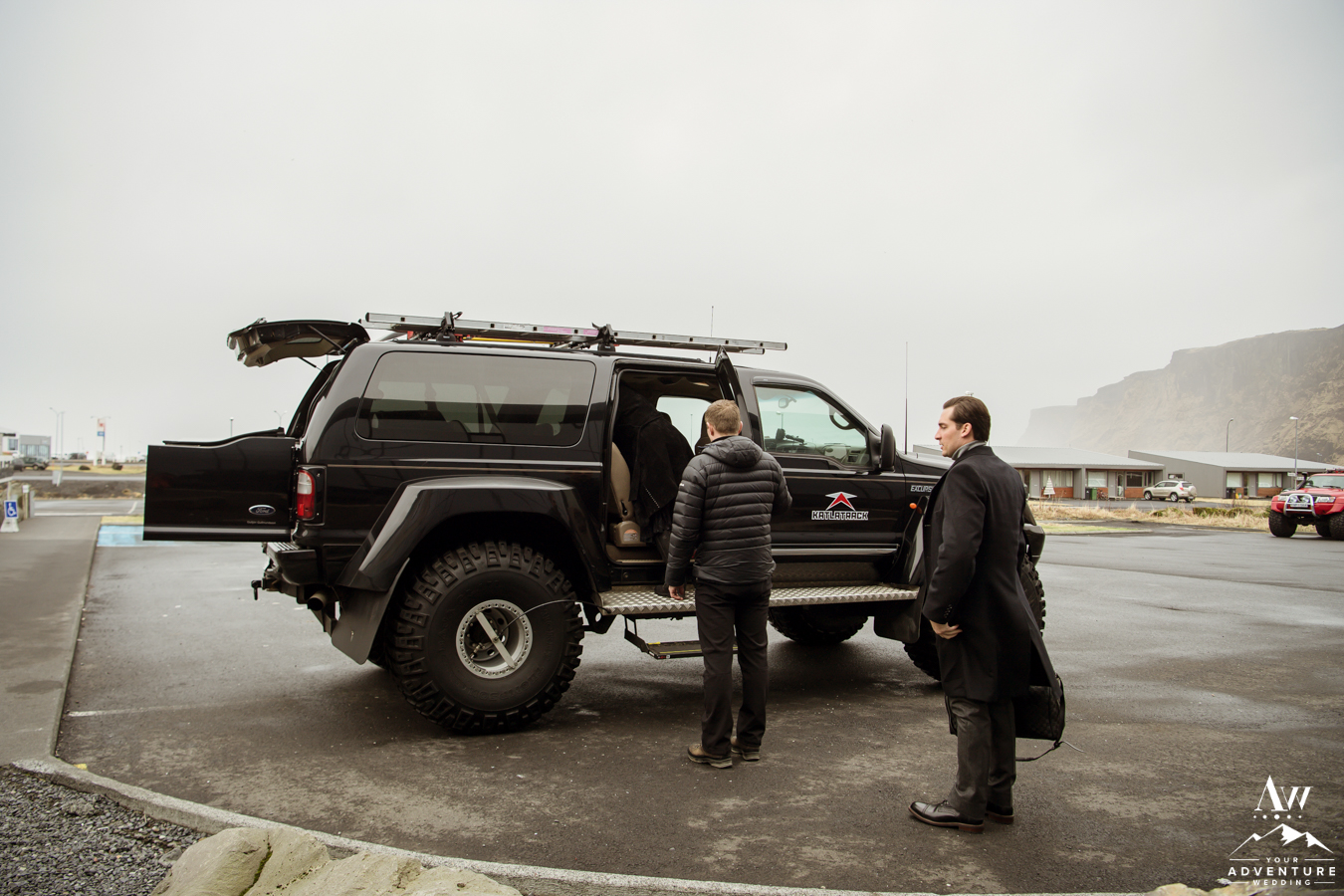 Our Iceland elopement photographer loved loved loved Amanda’s Iceland wedding dress! Such a classy unique non-traditional choice. Similarly staying away from the typical grooms attire, Spencer opted in for grey turtle neck and sports coat. Shortly after 12pm Spencer and his mum loaded into the super jeep. Since Amanda and Spencer chose to not see each other before the Iceland private black beach wedding ceremony, he needed to be blindfolded in the jeep! Good thing it was super foggy morning in Vik so he didn’t miss any landscape views!