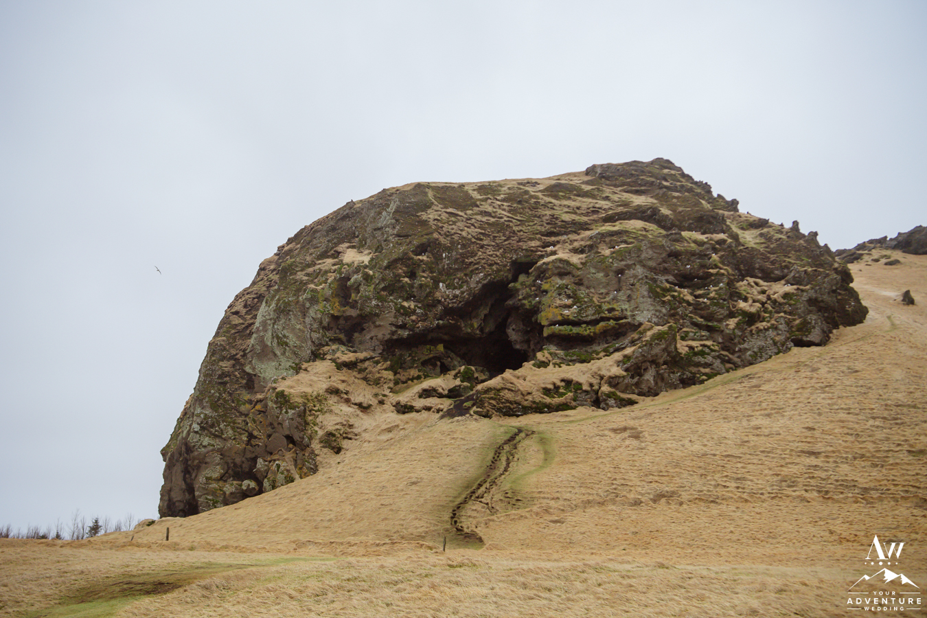 Concluding their half day adventure wedding in Iceland was a hike up to an offbeat cave near Dyrhólaey. A cave named Loftsalahellir (totally should have had it on our 55 unique things to do in Iceland post!). It is a short 5-10 minute hike depending on pace straight up the mountain. When inside you see a stunning view of the island of Dyrhólaey. Loftsalahellir wedding photos are so dreamy as you’ll see below.