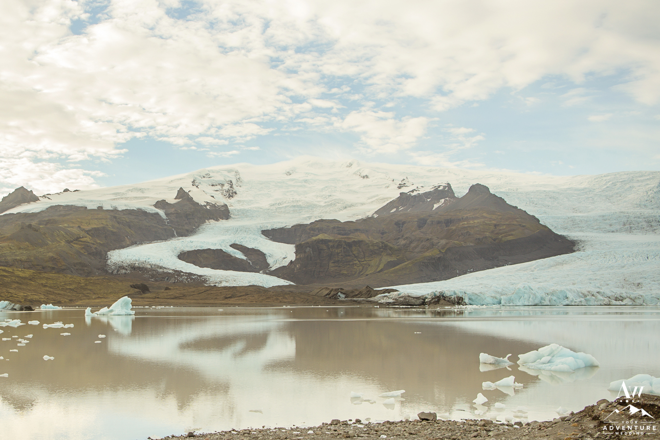 Many people are intrigued by glacier lagoons. To illustrate, imagine strolling down an offbeat path and seeing two glacier tongues meet in the water. So many tones and textures! Fjallsárlón Glacier Lagoon is a less touristy location compared to Jökulsárlón. As we previously mentioned, back when we did bus wedding adventures Fjallsárlón Glacier Lagoon was a location we pitched to our clients who were more budget minded. Worth a visit and for sure makes our list for best locations to propose in Iceland!