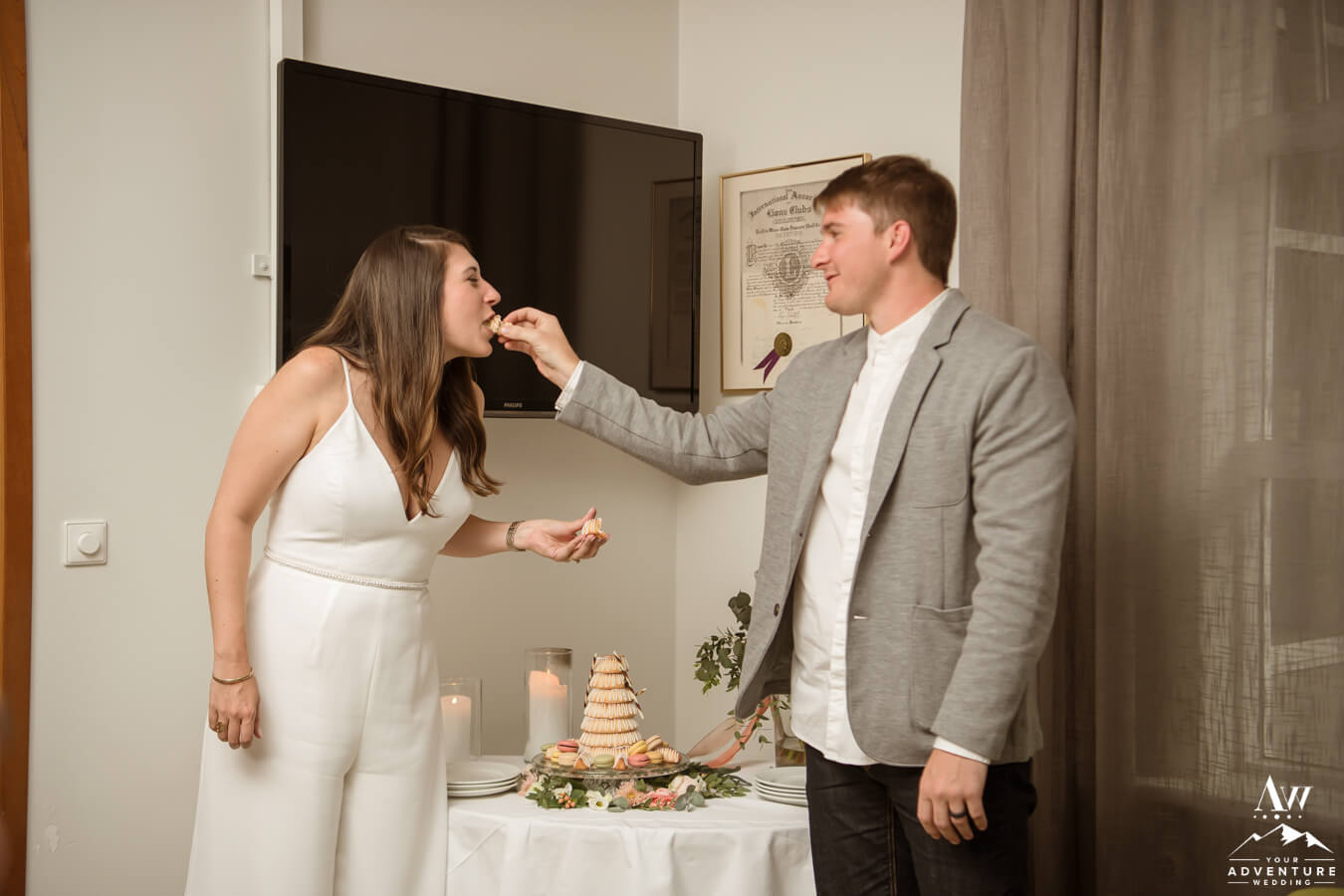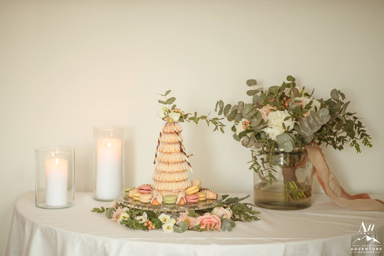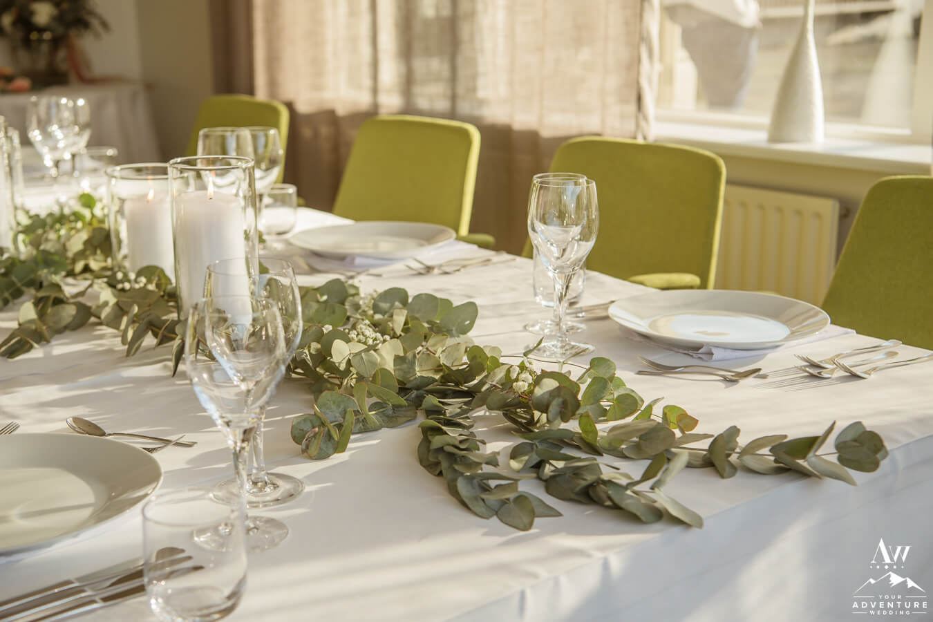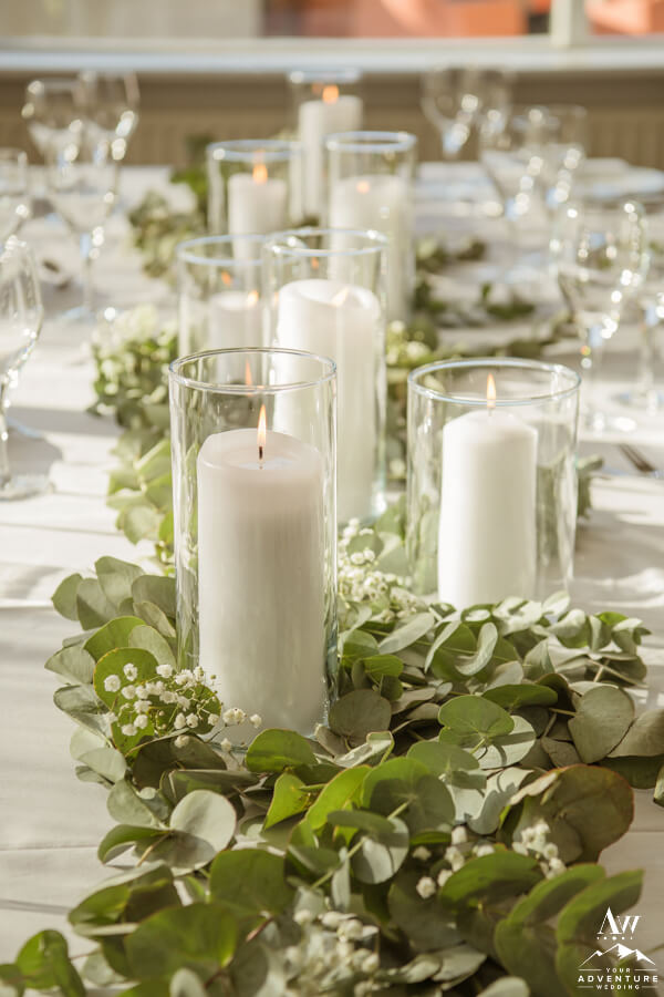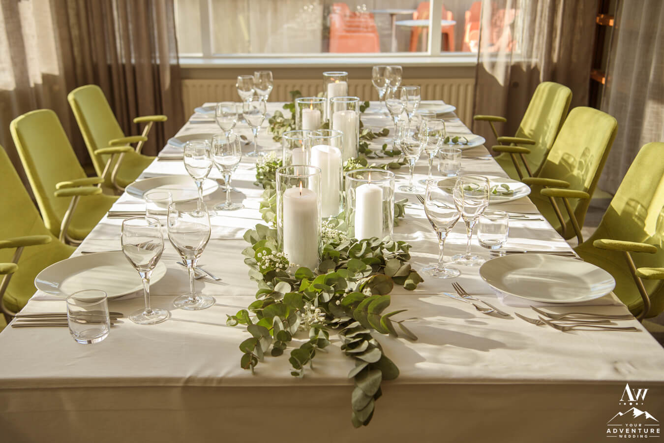 Ten hours of adventure went by crazy fast!  The group had a bit to rest and refresh before joining again together in the Klaustur Restaurant.  Desiring to have a more organic feeling reception felt more “them” to Drew and Kathleen.  On that same note, the reception space was donned with romantic candles, mint colored fresh garland and the most beautiful Iceland wedding cake (Kransakaka – “Ring cake”) than we’ve seen!