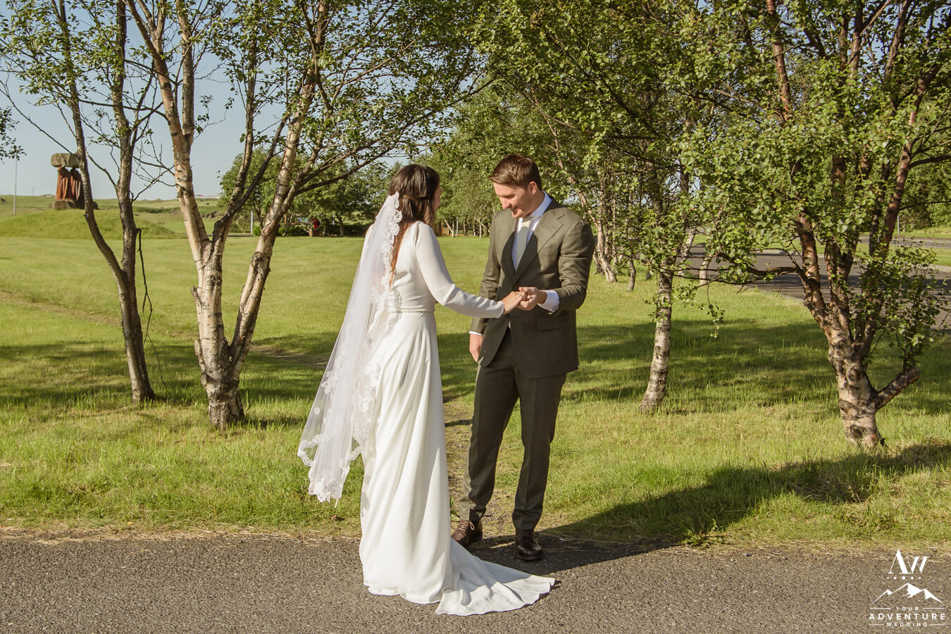 Shortly before grabbing their adventure wedding “go bags,” these two took a quite moment partake in a first look before joining their guests.  It was filled with lots of giggles, smiles, and kisses!  After, they met their 6 guests in the Hotel Klaustur lobby and everyone was crazy excited as they loaded into the super jeep to begin their luxe Iceland wedding adventure!
