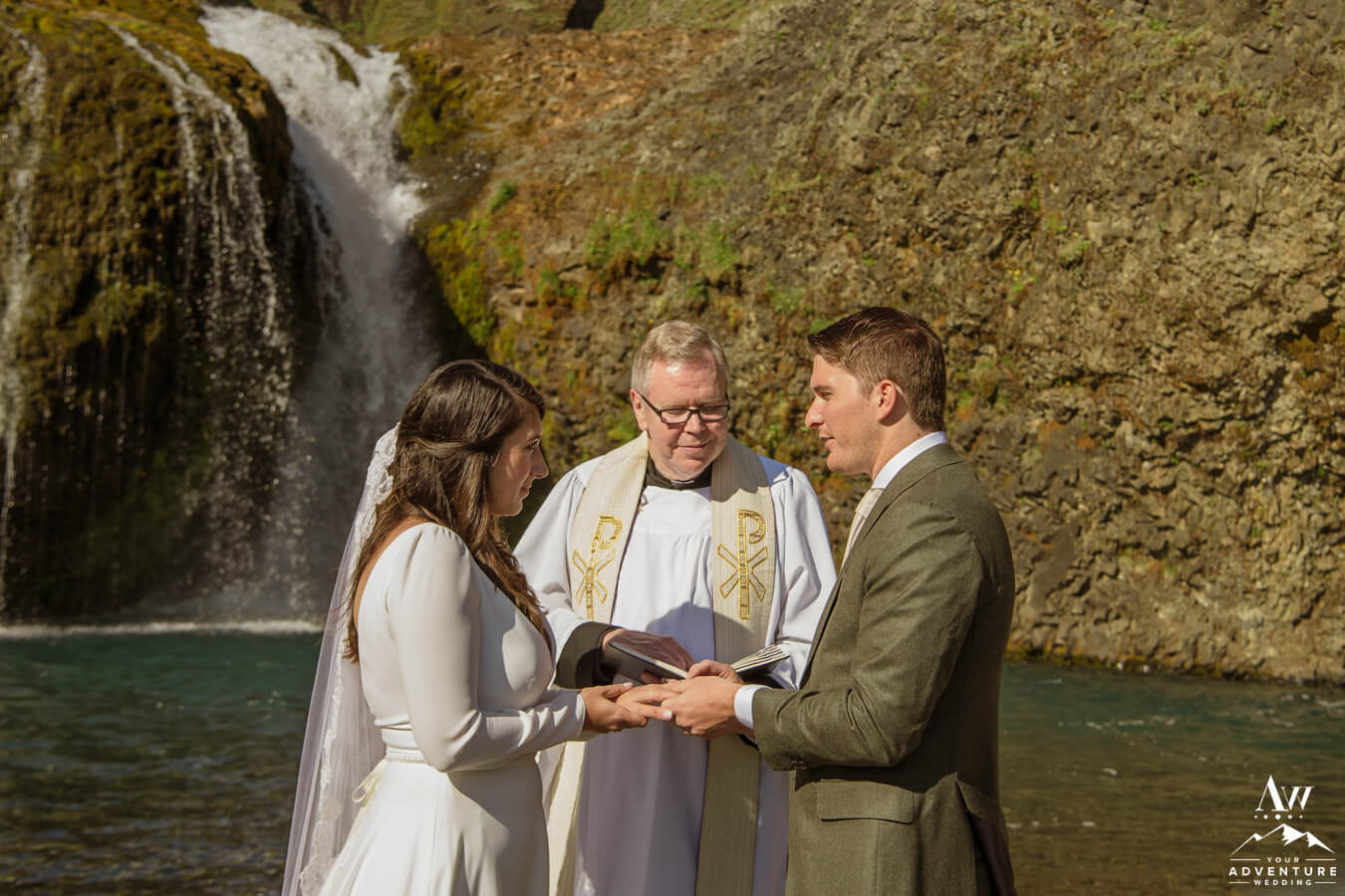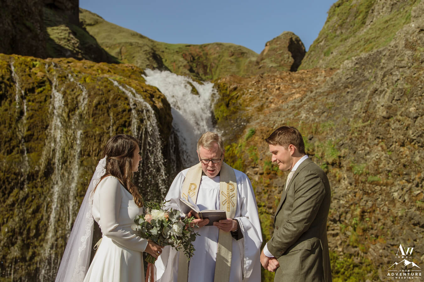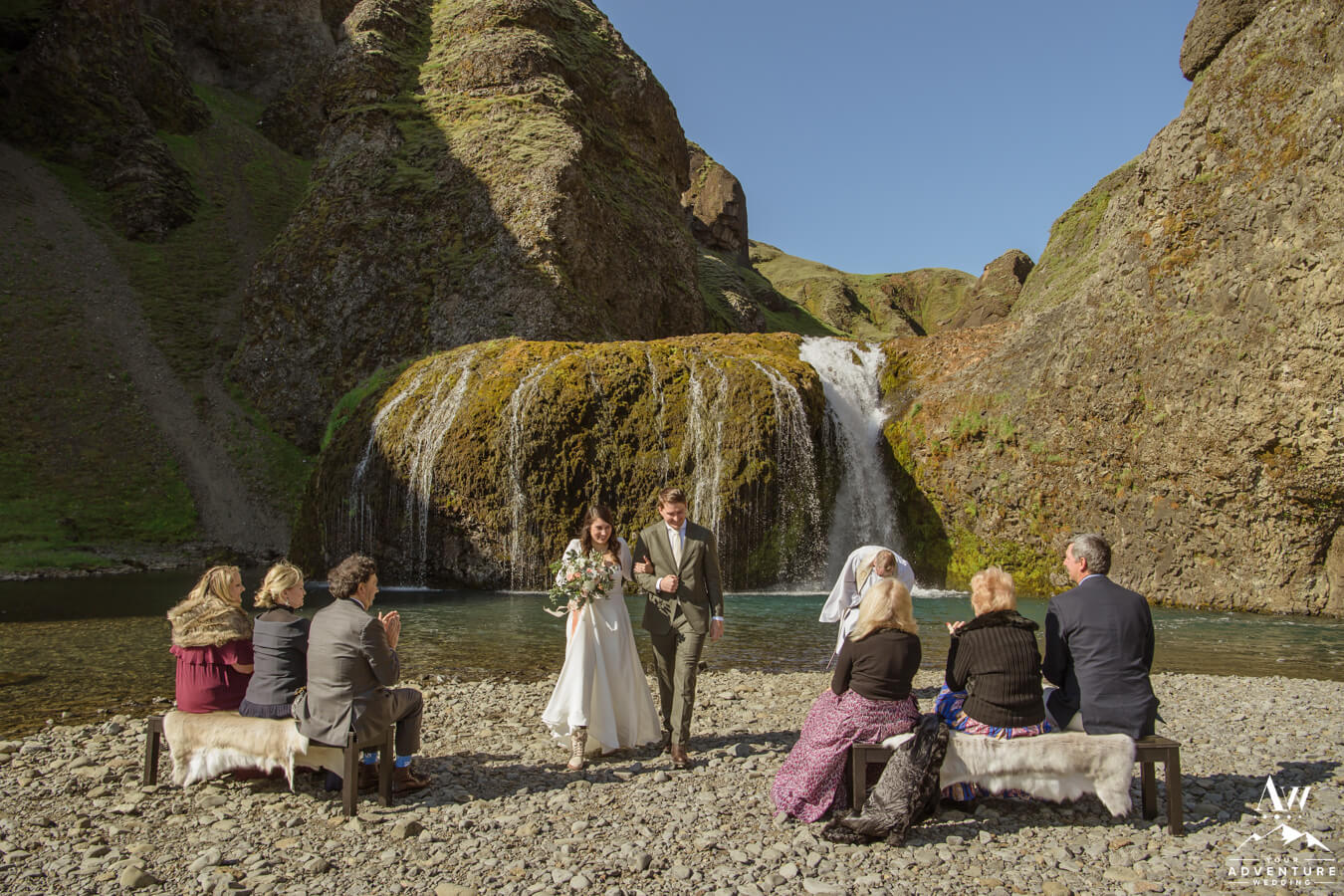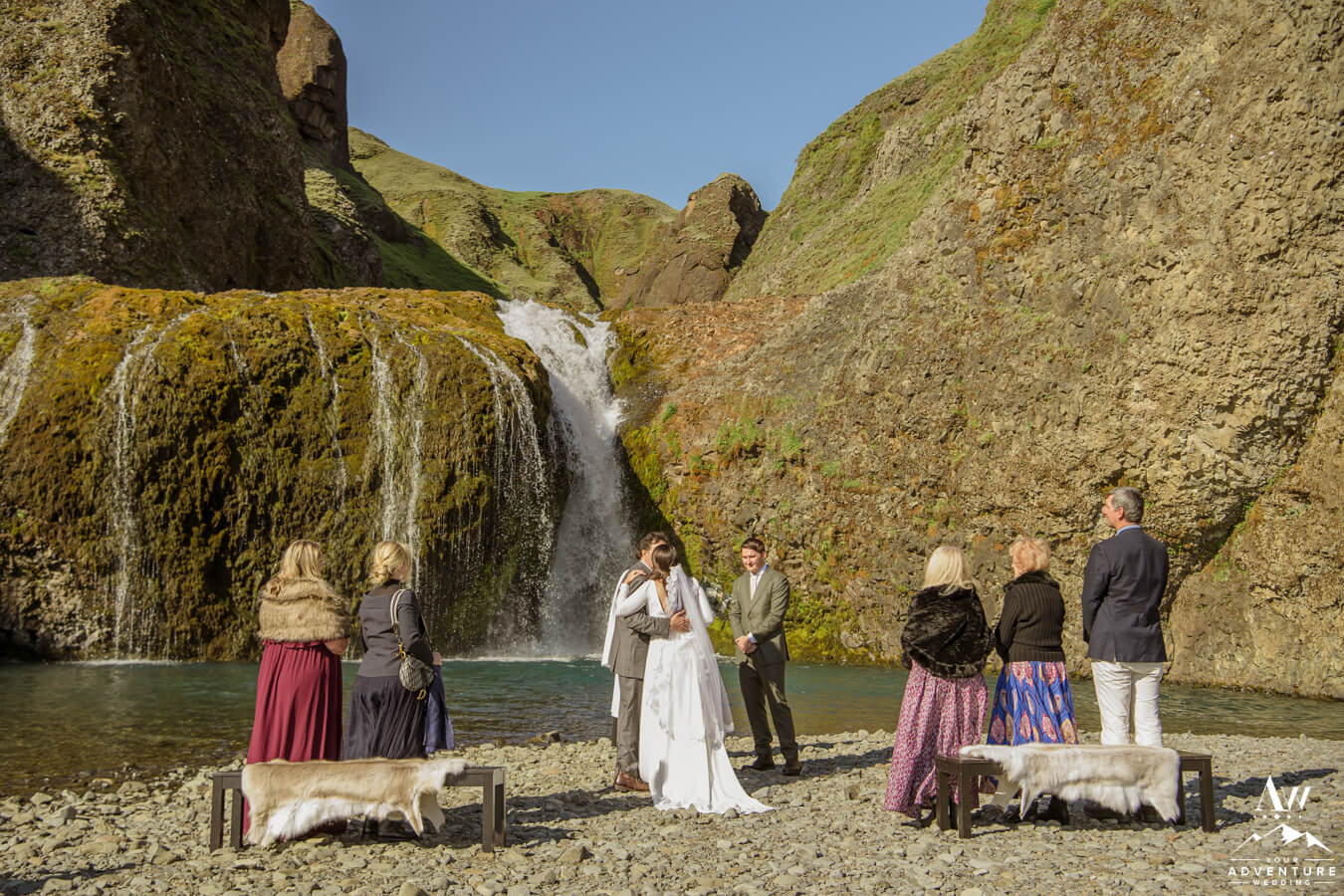 Arriving to the private property waterfall, the group was all smiles as they hiked to the ceremony location.  Providing their guests with black benches topped with reindeer furs was their choice for Iceland wedding ceremony seating.  Our exclusive pastor led an inspiring and emotional luxe Iceland wedding ceremony.  The soon to be newlyweds, even said their own personal vows to each other which barely left a dry eye!