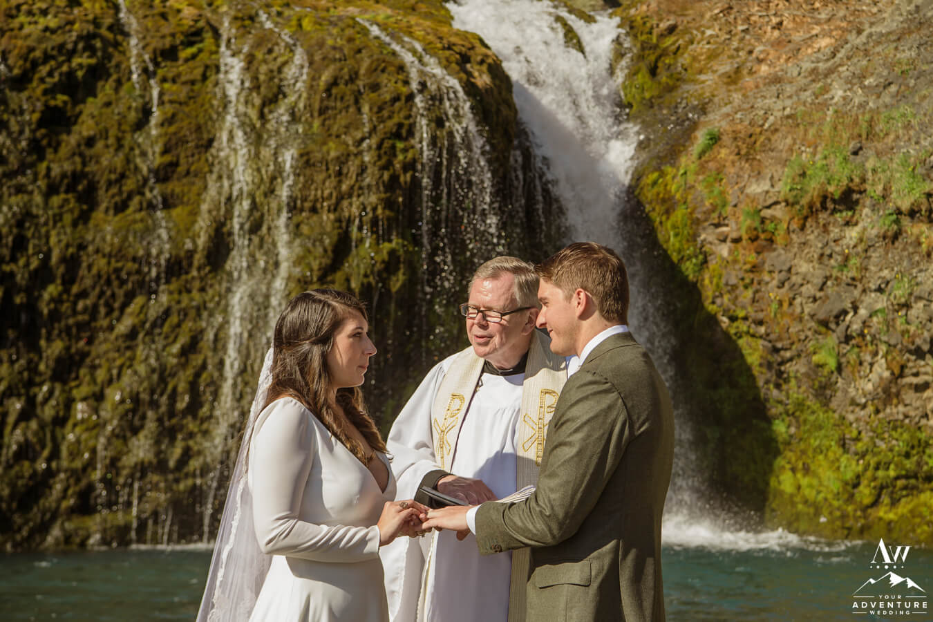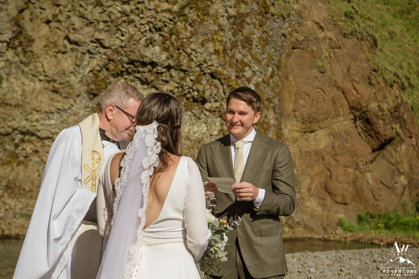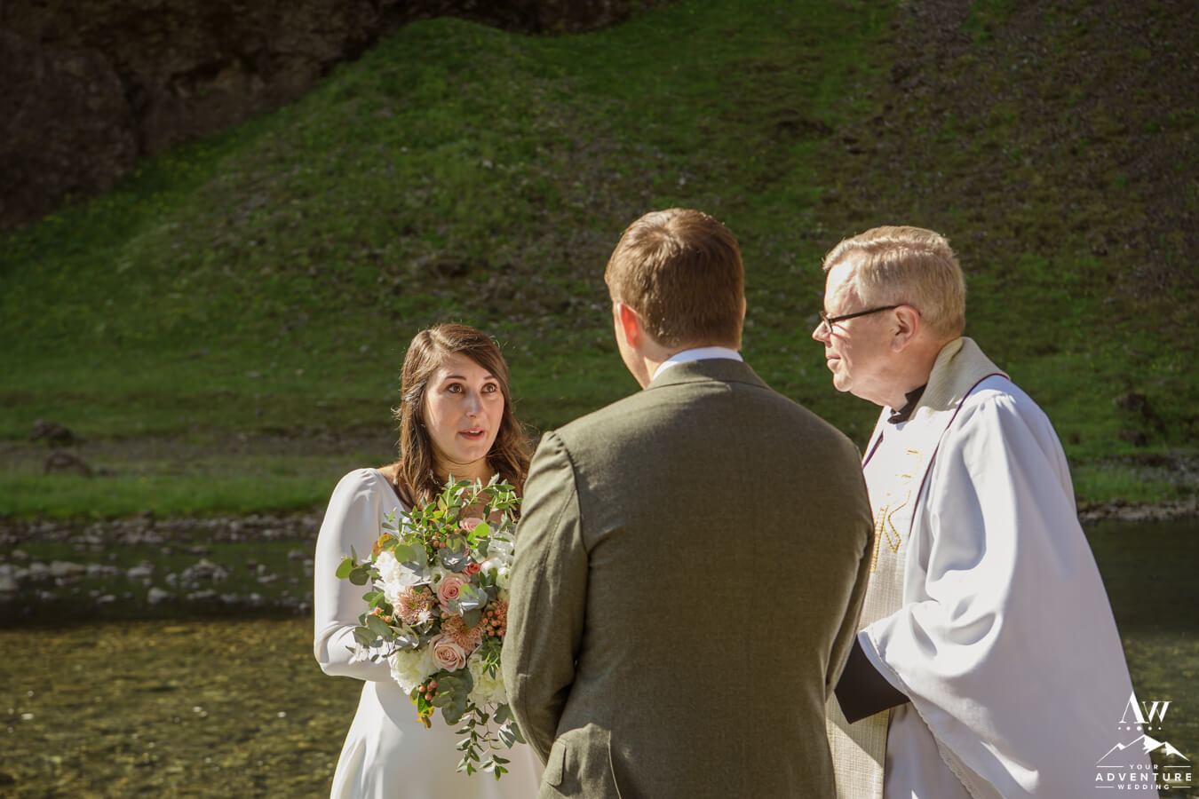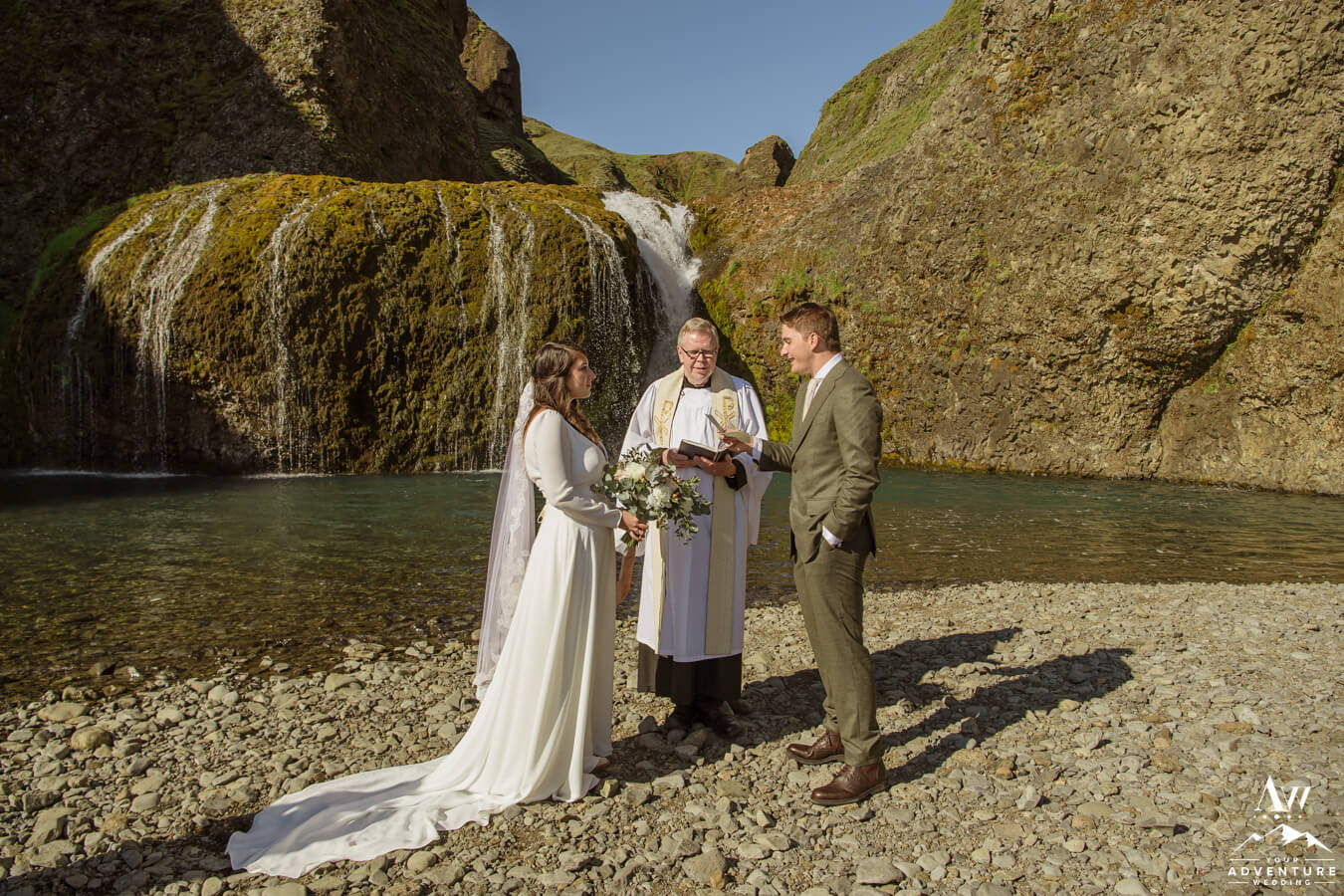 Arriving to the private property waterfall, the group was all smiles as they hiked to the ceremony location.  Providing their guests with black benches topped with reindeer furs was their choice for Iceland wedding ceremony seating.  Our exclusive pastor led an inspiring and emotional luxe Iceland wedding ceremony.  The soon to be newlyweds, even said their own personal vows to each other which barely left a dry eye!