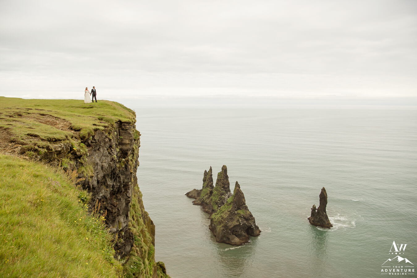 As if exploring 10 different out of this world wedding locations in Iceland, wasn’t enough there was more to see and do for these two!  Seeing Iceland from literally a birds eye view was an incredible way to end their adventurous wedding turned elopement in Iceland.  They adored the 360 views, textured cliffs, basalt sea stacks, and Dyrhólaey sea arch in the distance.  They were even lucky enough to see a puffin while they were venturing around the cliffs!