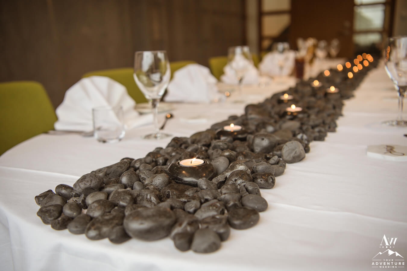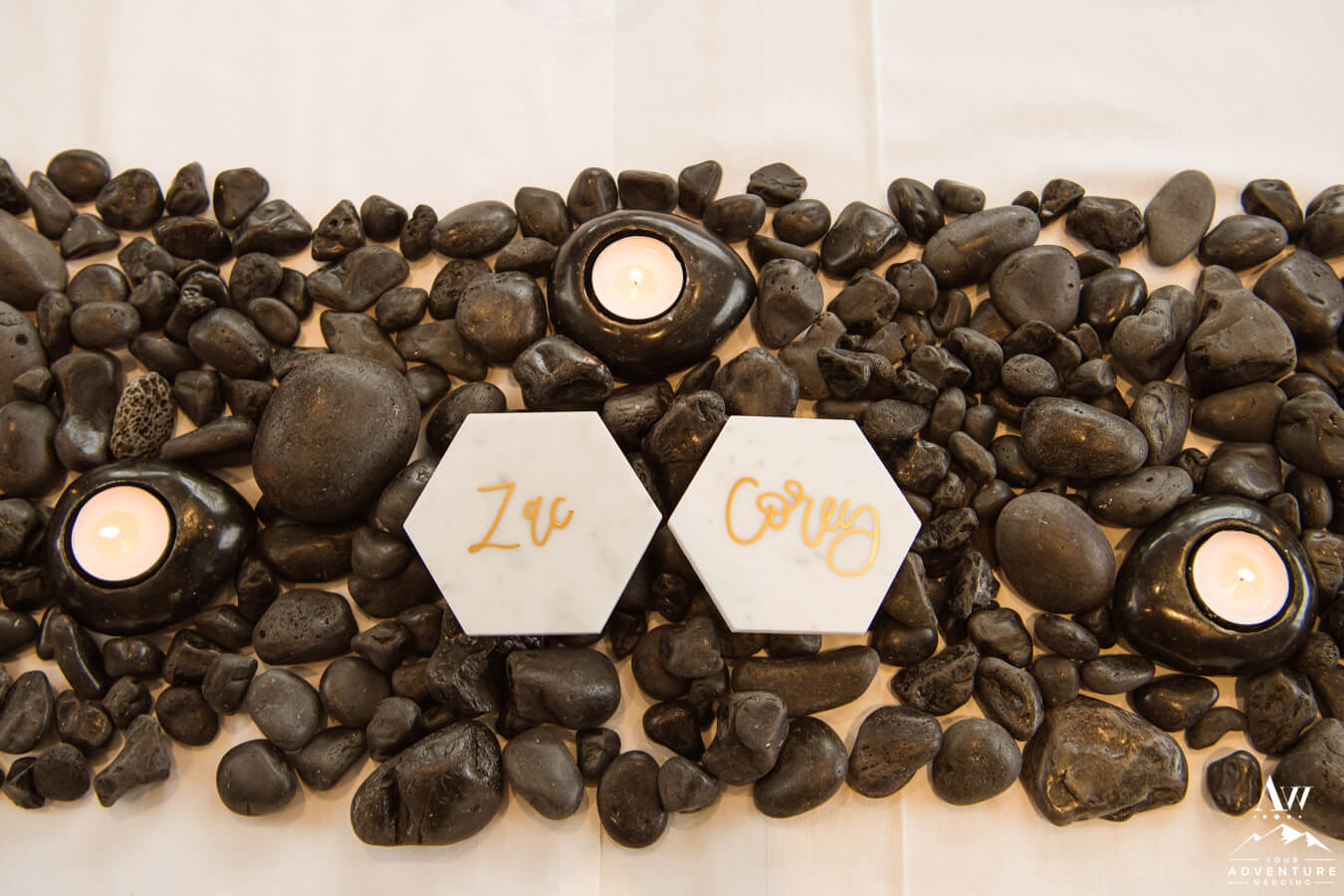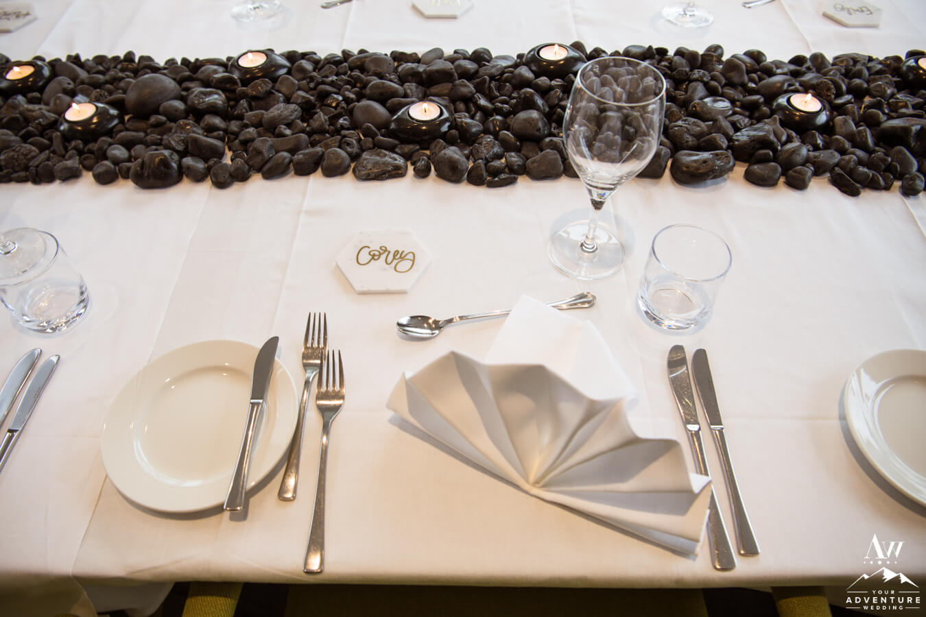 Concluding their amazing July wedding in Iceland, Corey and Zac met their immediate family again for a cozy dinner together.  The table decor, was rented from our Iceland wedding rental collection.  A basalt rock table runner lined the table with tealights intermingled and marble place cards as the crowning jewel!  Most of our Iceland wedding receptions, are focused on food, drinks, and conversation.  Corey and Zac had a blast recanting the stories and experiences they had to their guests!  Fair to say the guests were hanging on every word too!