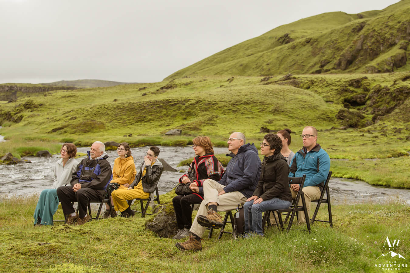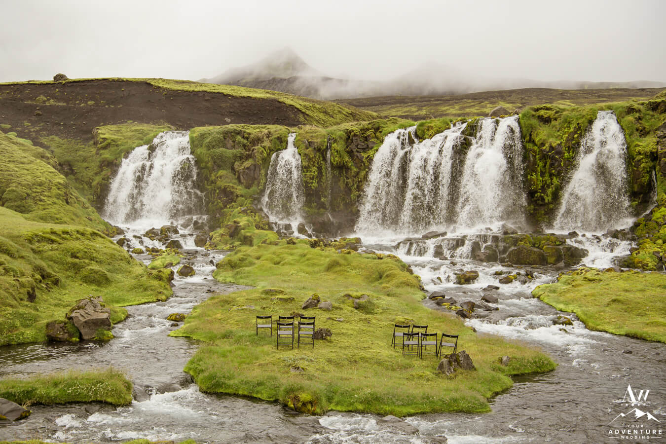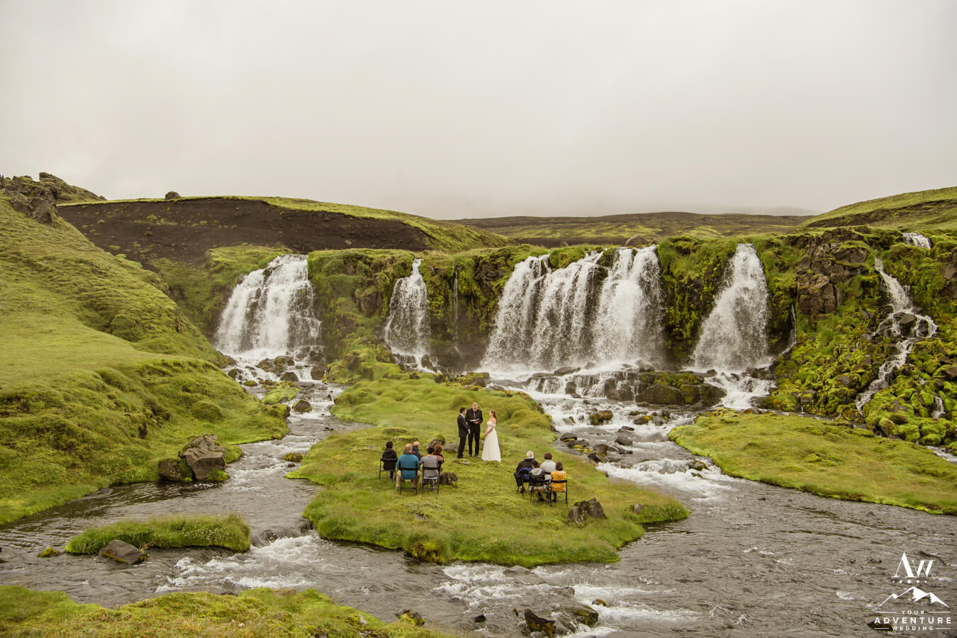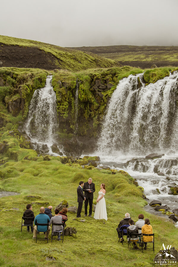 Travelling to the ceremony location you could feel the excitement on both sides of the family!  They could hardly believe the day was finally here and they had no idea where in Iceland they were going!!  The terrain they passed was rugged and raw as the jeeps entered into the Icelandic Highlands.  Arriving to the private waterfall for their Iceland wedding ceremony, the guests jawed dropped.  Likely because they spotted our team setting up chairs on an island in front of the waterfall.