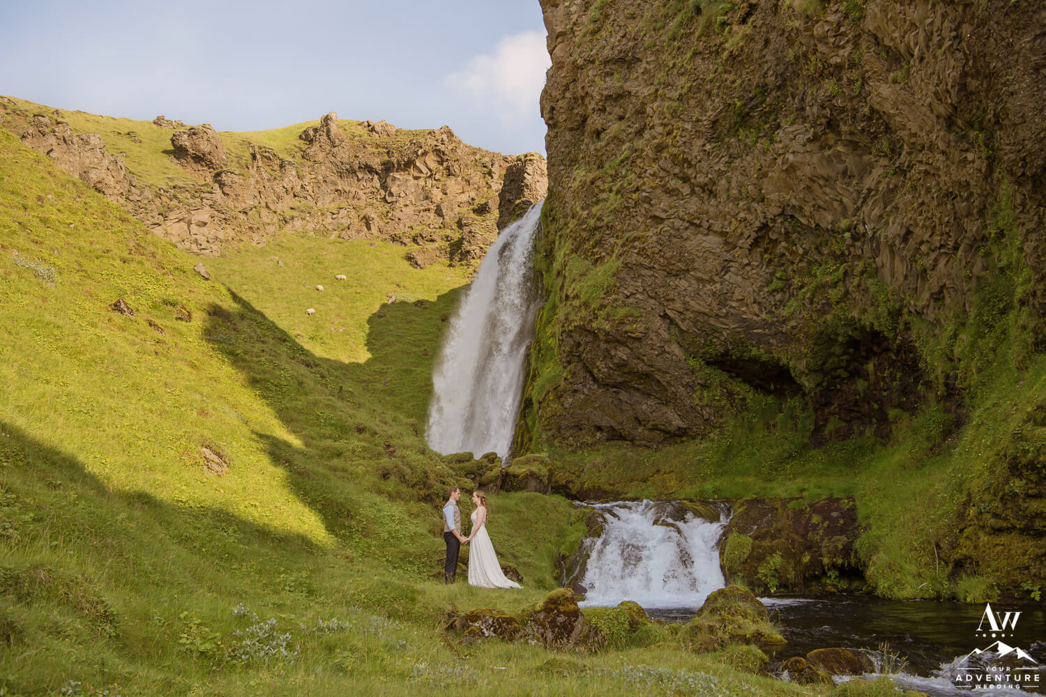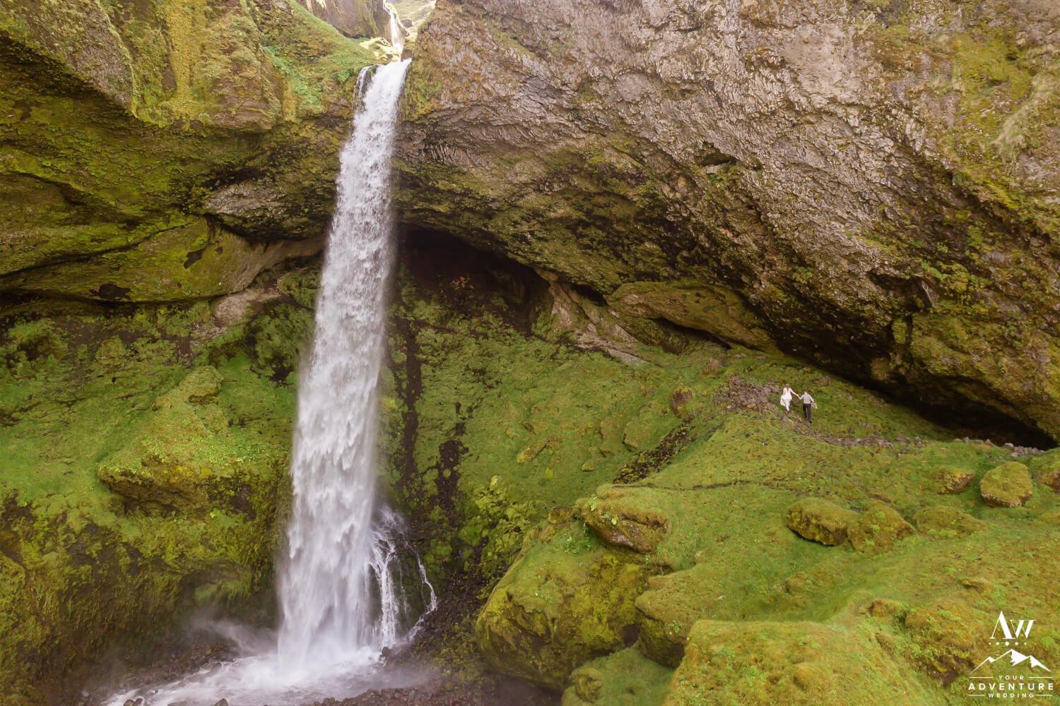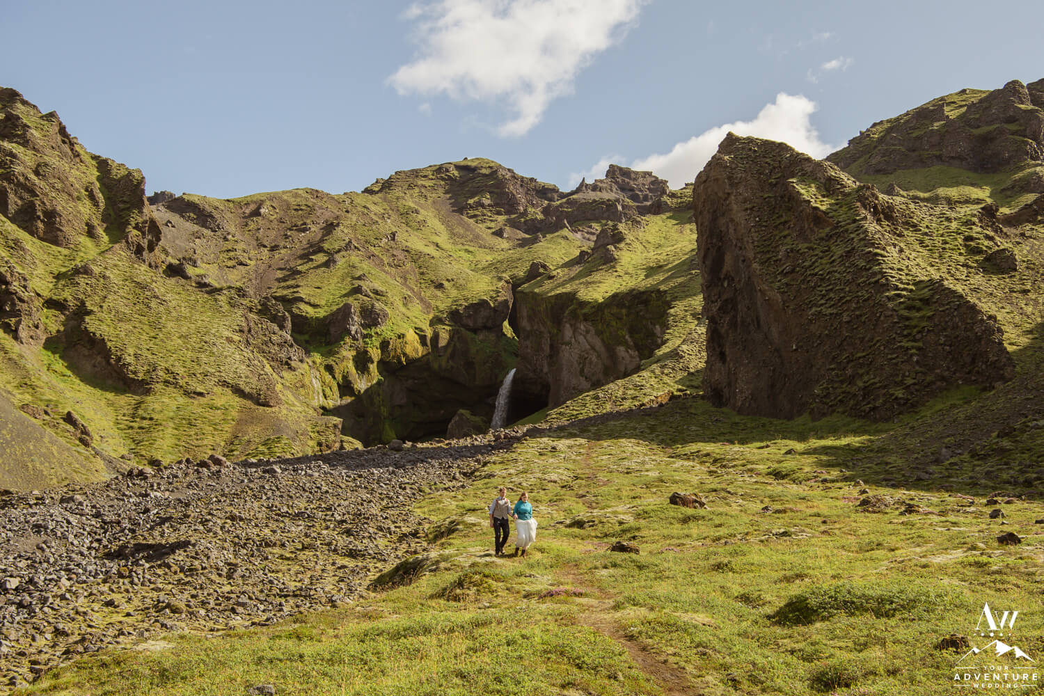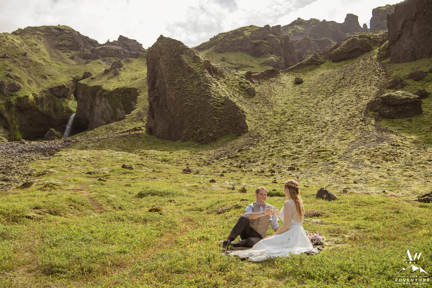 Woohoo it’s lunch time! Can you believe they explored three amazing areas already before lunch?! Chilling for 30 minutes during your Iceland adventure elopement enjoying a glass of bubbles and yummy food is a must do! Once they were full, they hiked into the secret waterfall area explore it. So many beautiful Iceland wedding photo opportunities.