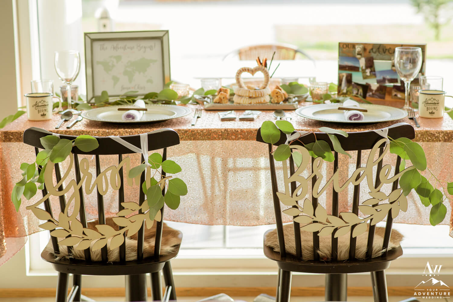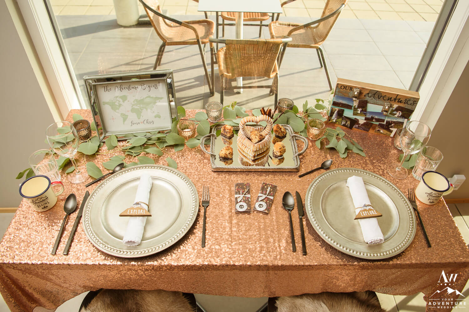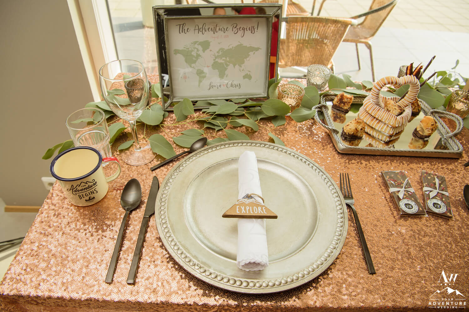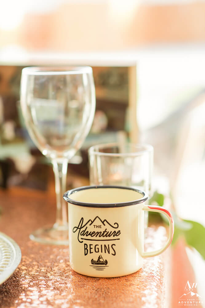 Including a romantically styled table for two during your luxury adventure elopement just makes sense! Really it adds another level of extraordinary to the experience. Walking into not just a bistro dinner table, but a perfectly styled just for you table is an incredible memory to keep but the items get to be taken home too! Needless to say, Laura and Chris really enjoyed their “Adventure Begins” themed adventurous wedding reception table!