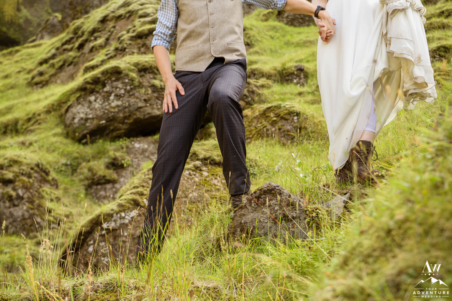Next, things that were important to Laura and Chris during their adventure elopement was that they have an unforgettable EXPERIENCE together ALONE. Not just playing dress up and getting pretty photos. They wanted to hike, climb, and push their limits a bit. Therefore, they also liked the idea of shaping their experience around the Icelandic mountains with moments of slower pace so they could savor it. Also, having a picnic by a waterfall and a styled reception table for two was ideal as well! Oh la la, their wish was our pleasure to put together!