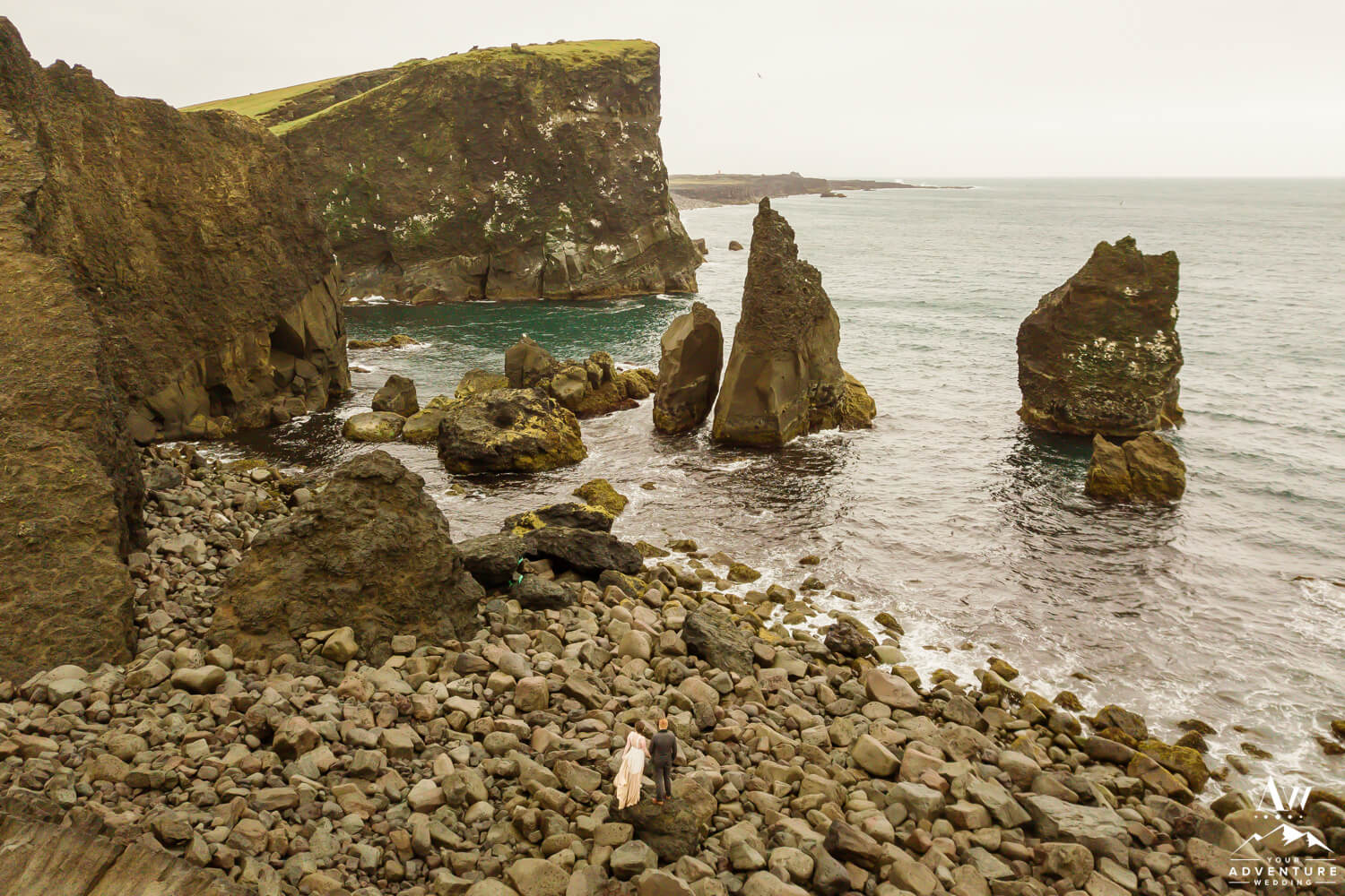 The actual sea stacks are named Valahnúkamöl within the Reykjanesviti area. It can be a bit offbeat and during summer can be a prime spot for bird watchers. The road to get here is often rutted so take your time heading down it or have a higher clearance SUV. Although the wind was still running high, the rain had let up a bit. Jenna and Chris were game to hike down closer to the sea stacks to get a prime view and unforgettable Iceland wedding photos!