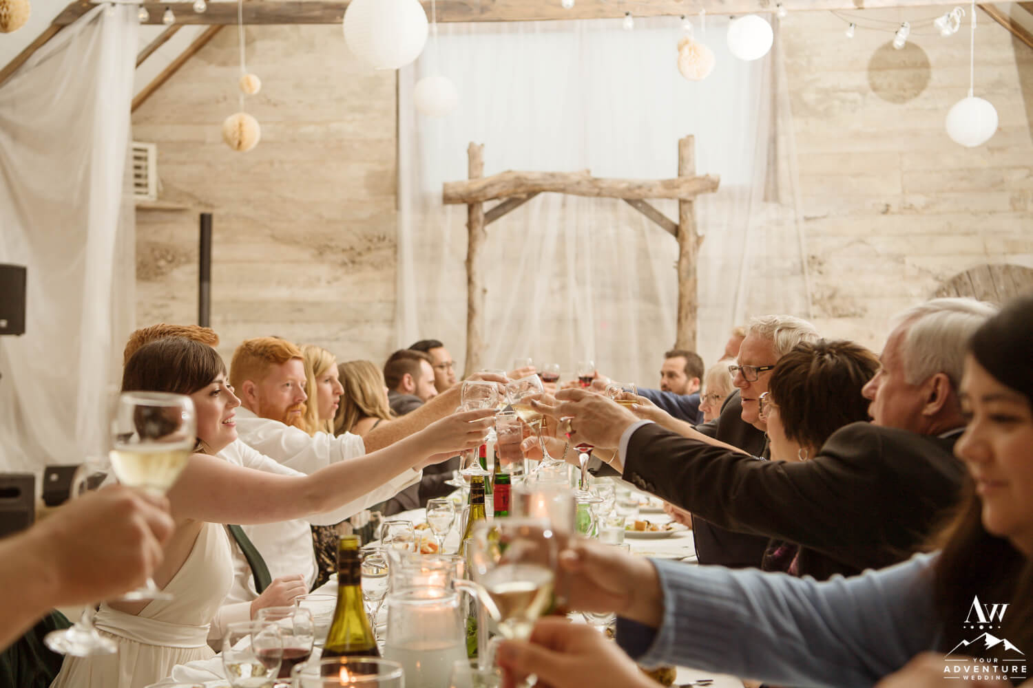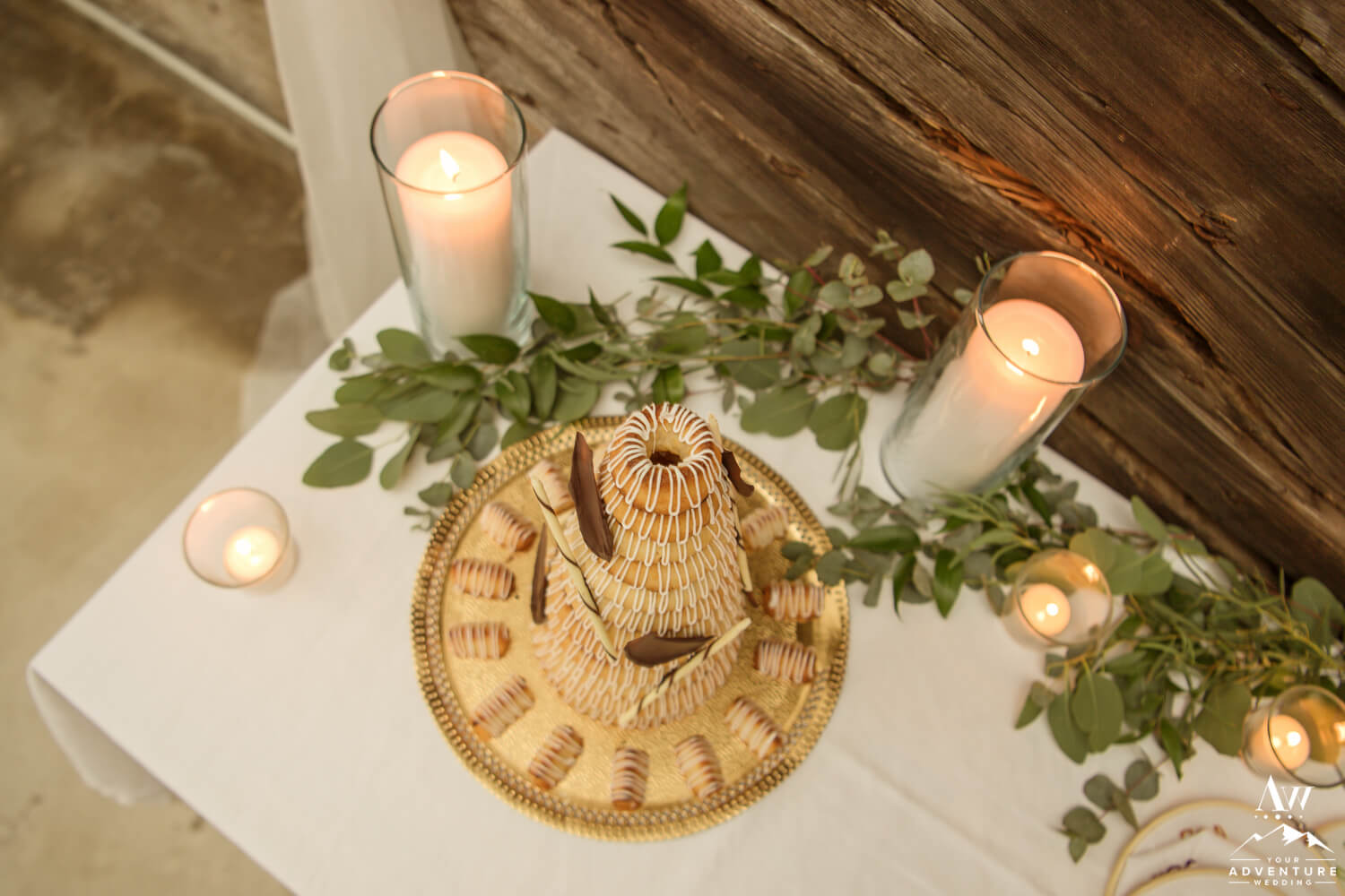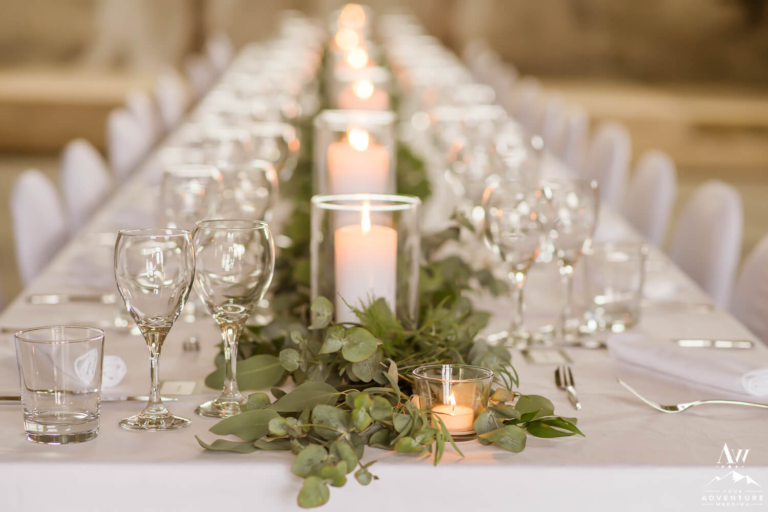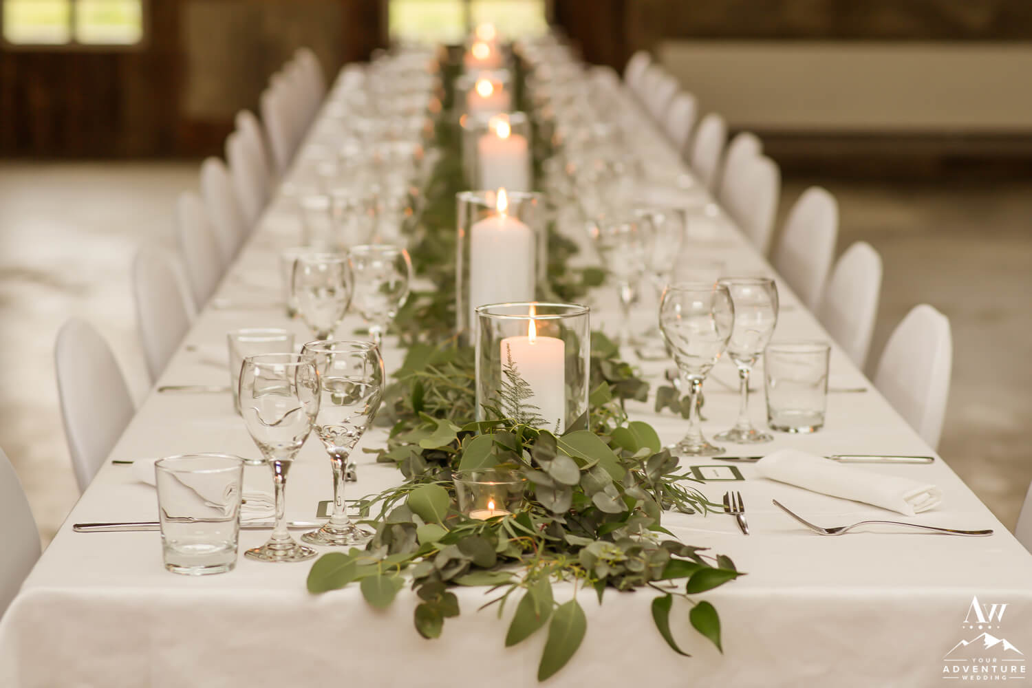 Keeping with the theme of enchanting, Jenna and Chris opted to have a rustic yet classic reception. Combining the two meant that the space and ambiance itself was rustic being inside of a barn with charming bits of elegance intermingled. Candles and greenery lined both the table and Iceland wedding cake table. Totally ideal for a July Iceland wedding reception to create a warm ambiance!