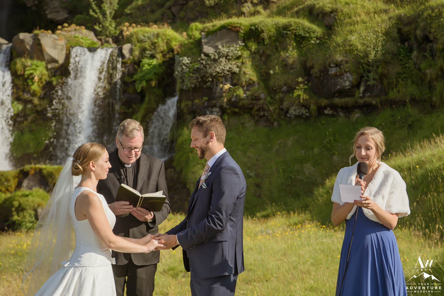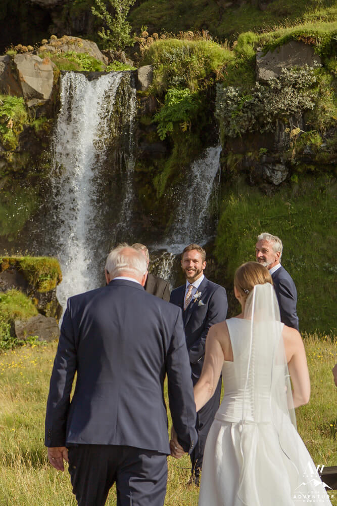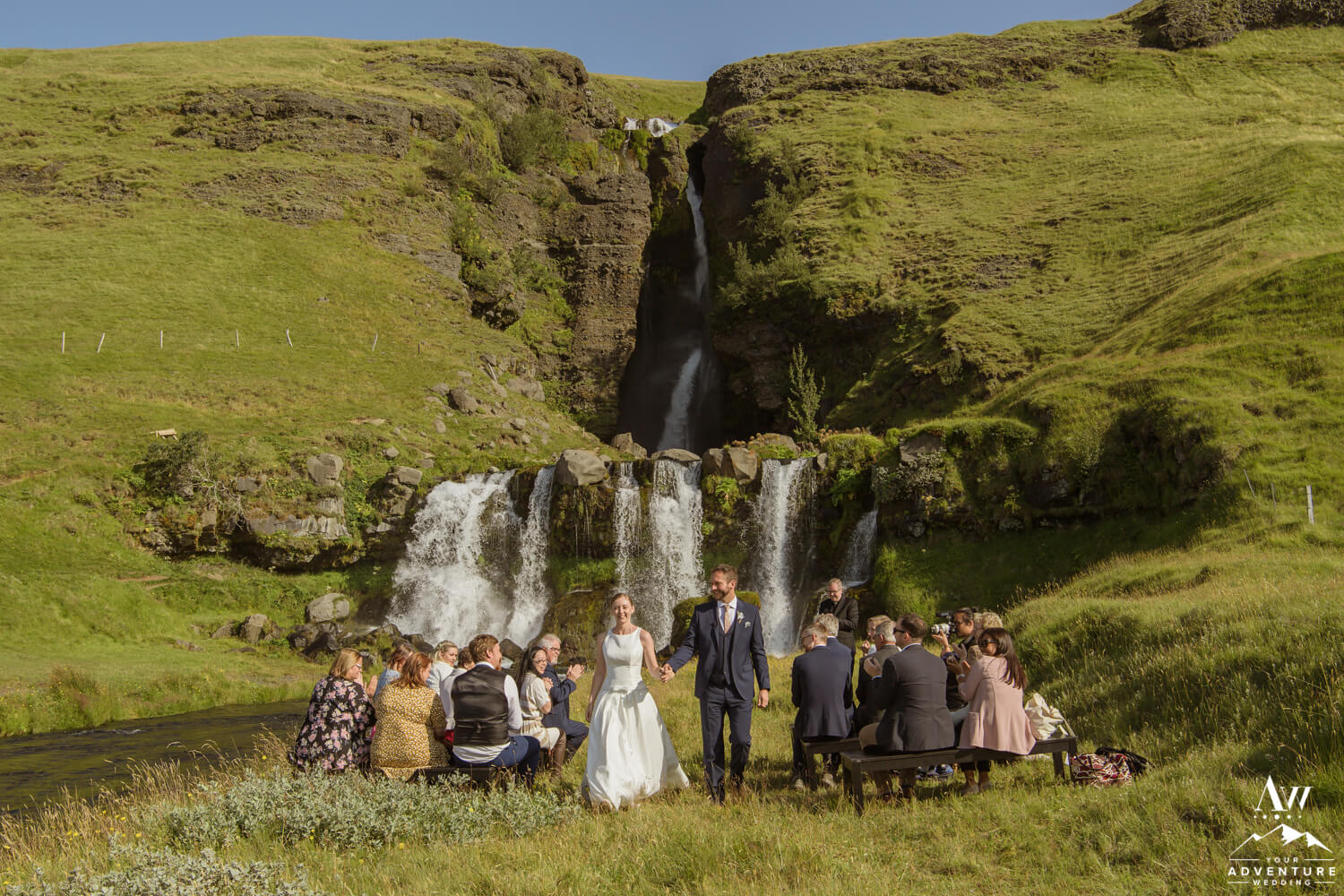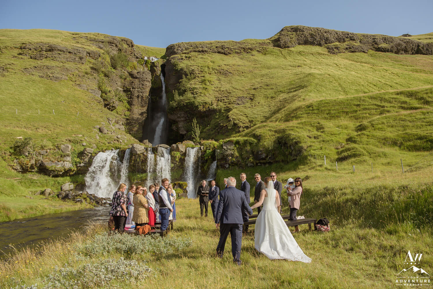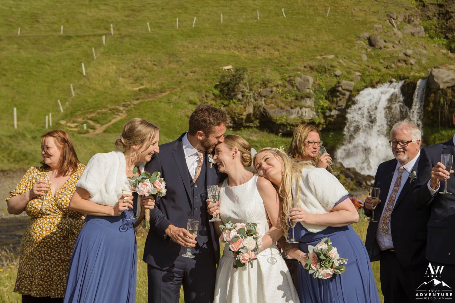 Upon arriving to the private property waterfall, our Day of Planner went to work setting up the ceremony seating, the champagne toast, and organizing the guests and bridal party. Lucy and her father shared a beautiful walk across a bridge and down the aisle to Dave. Our favorite Pastor, performed a custom ceremony complete with the couple reciting their own Iceland wedding vows. Immediately following the ceremony the group were given glasses of cava in celebration of the newlyweds! Truly a delightful end to their summer Iceland nuptials and ceremony!