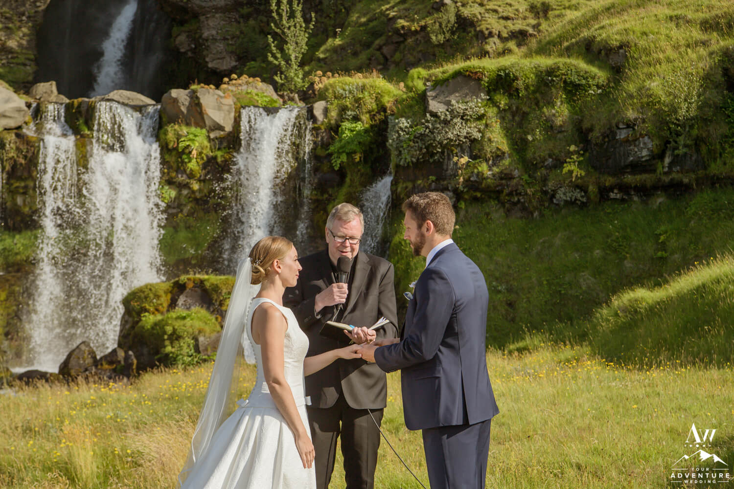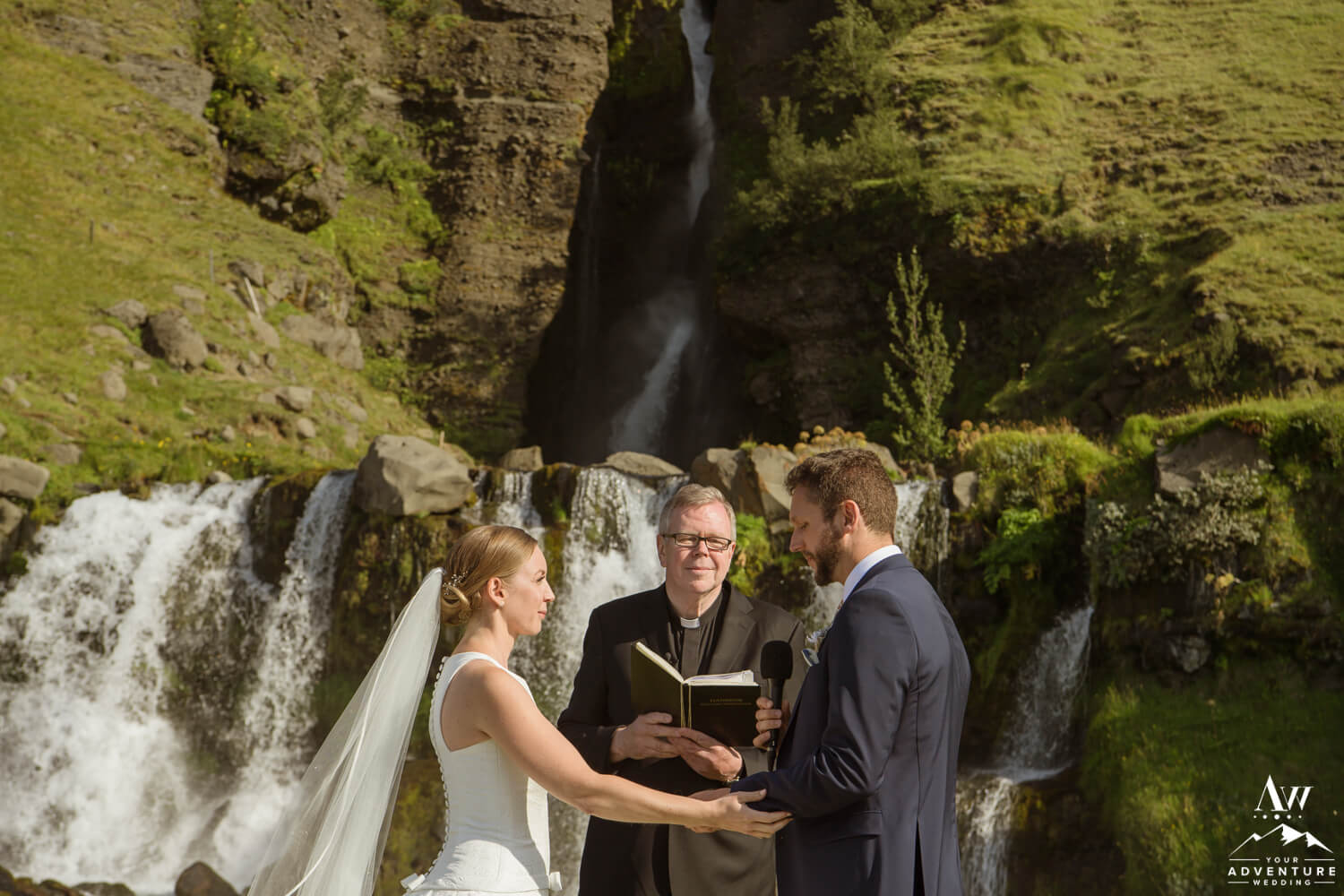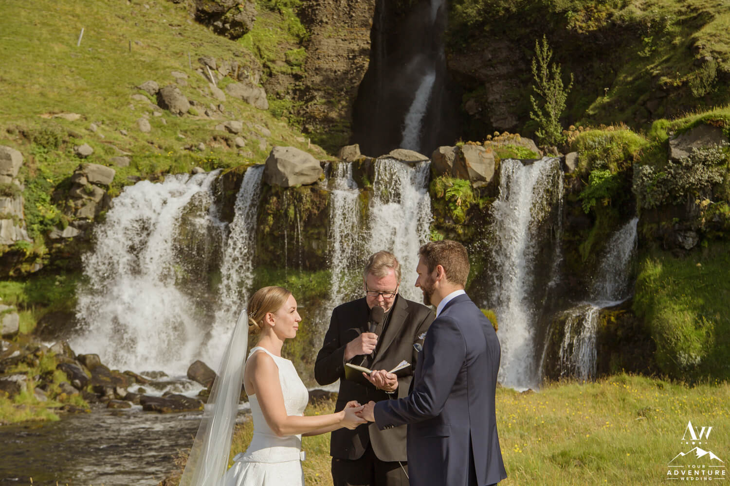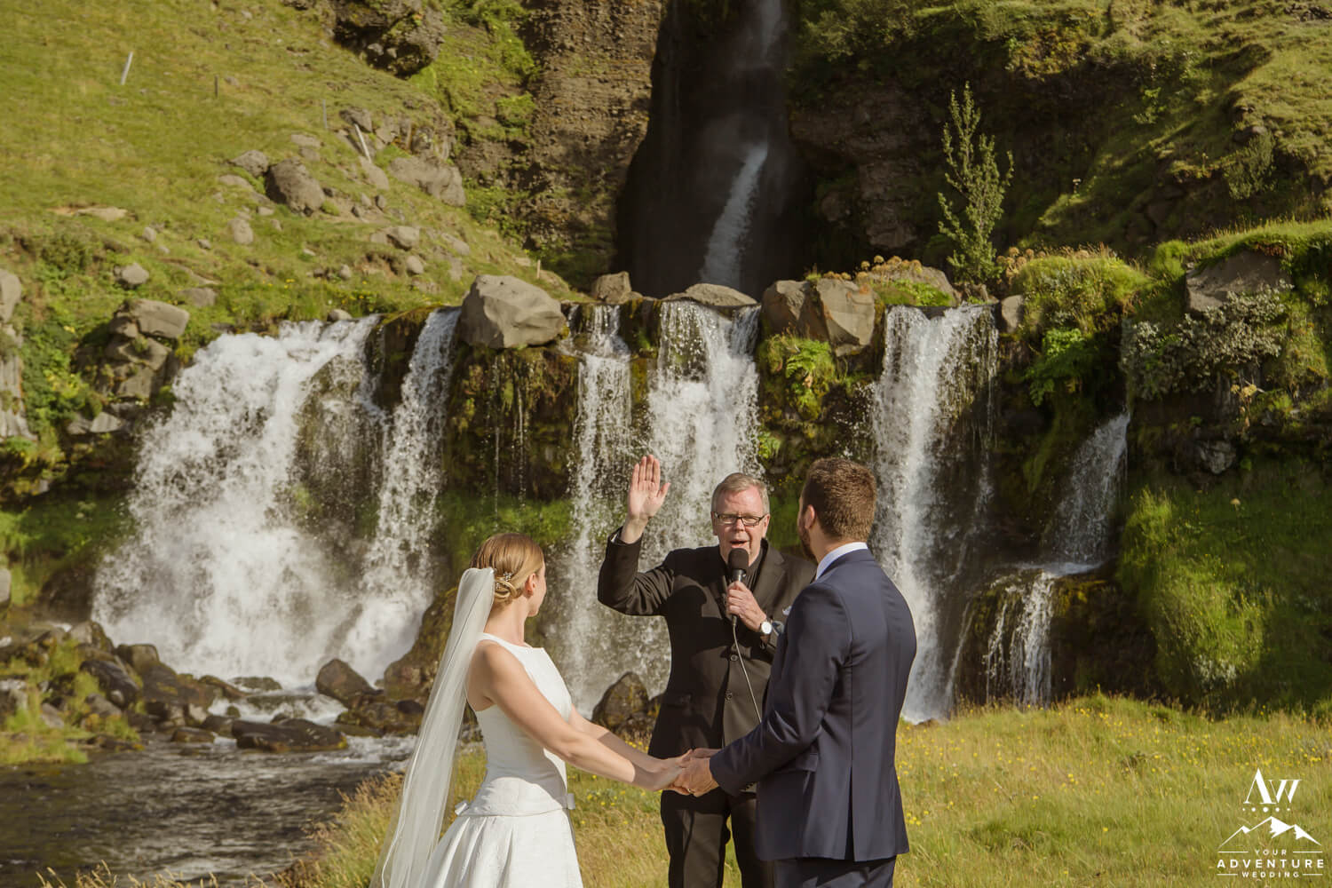 Upon arriving to the private property waterfall, our Day of Planner went to work setting up the ceremony seating, the champagne toast, and organizing the guests and bridal party. Lucy and her father shared a beautiful walk across a bridge and down the aisle to Dave. Our favorite Pastor, performed a custom ceremony complete with the couple reciting their own Iceland wedding vows. Immediately following the ceremony the group were given glasses of cava in celebration of the newlyweds! Truly a delightful end to their summer Iceland nuptials and ceremony!