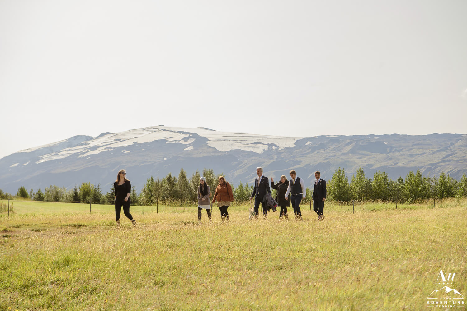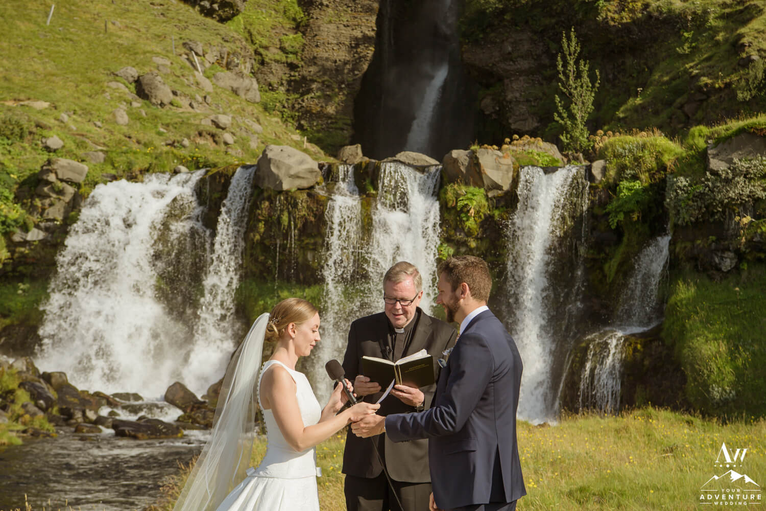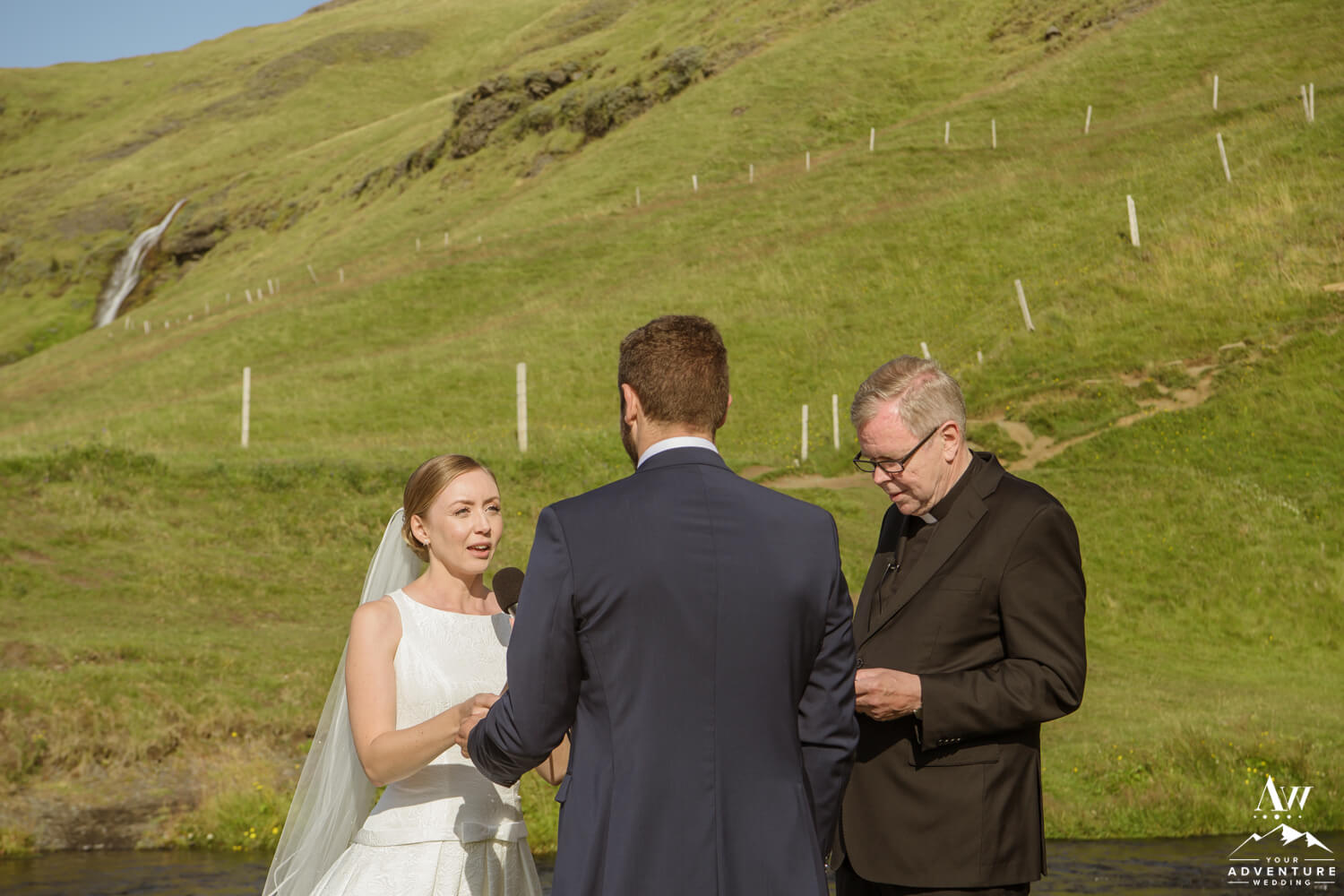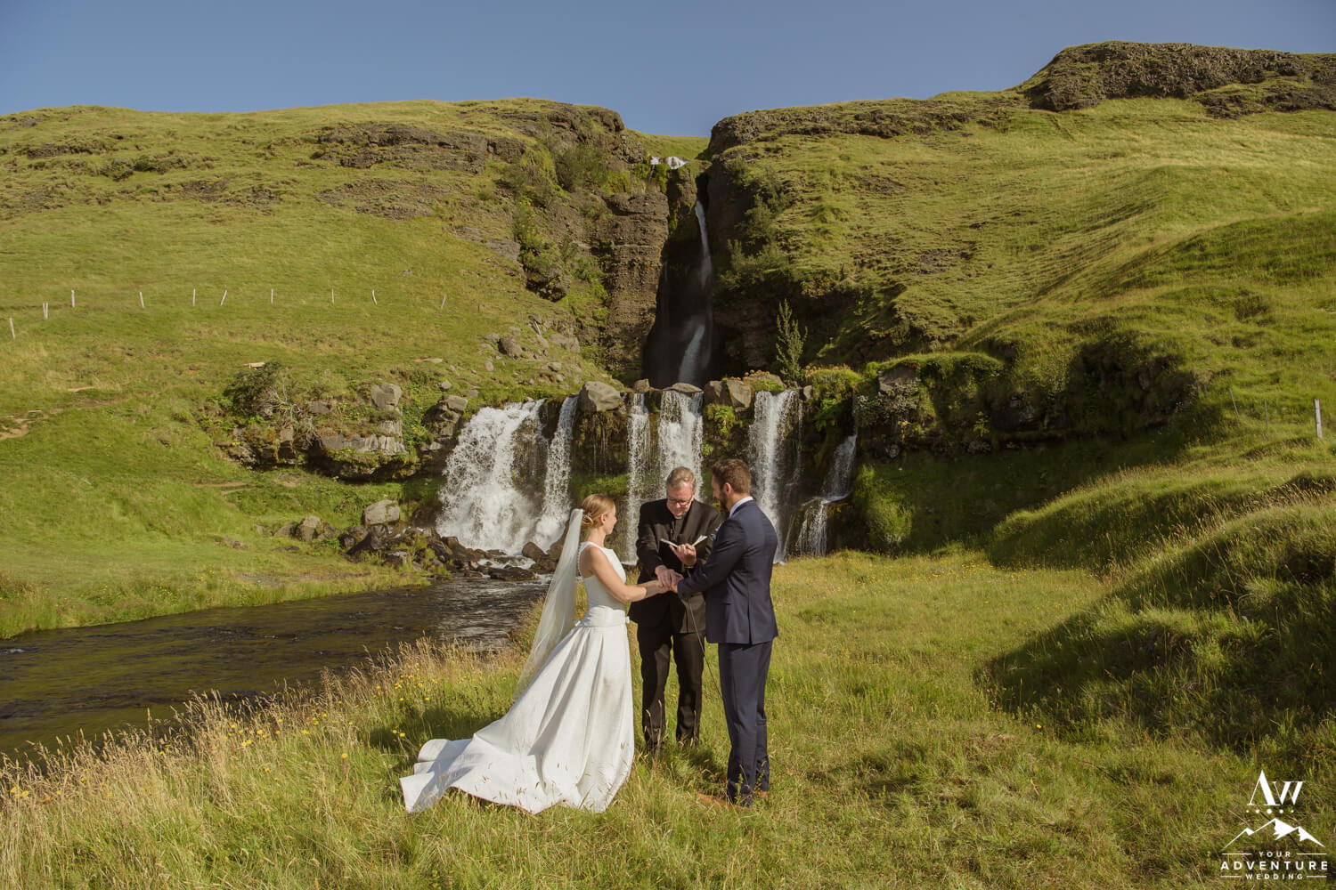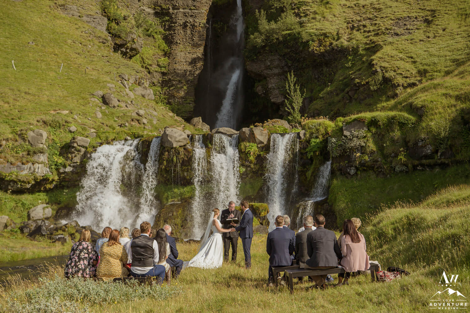 Upon arriving to the private property waterfall, our Day of Planner went to work setting up the ceremony seating, the champagne toast, and organizing the guests and bridal party. Lucy and her father shared a beautiful walk across a bridge and down the aisle to Dave. Our favorite Pastor, performed a custom ceremony complete with the couple reciting their own Iceland wedding vows. Immediately following the ceremony the group were given glasses of cava in celebration of the newlyweds! Truly a delightful end to their summer Iceland nuptials and ceremony!