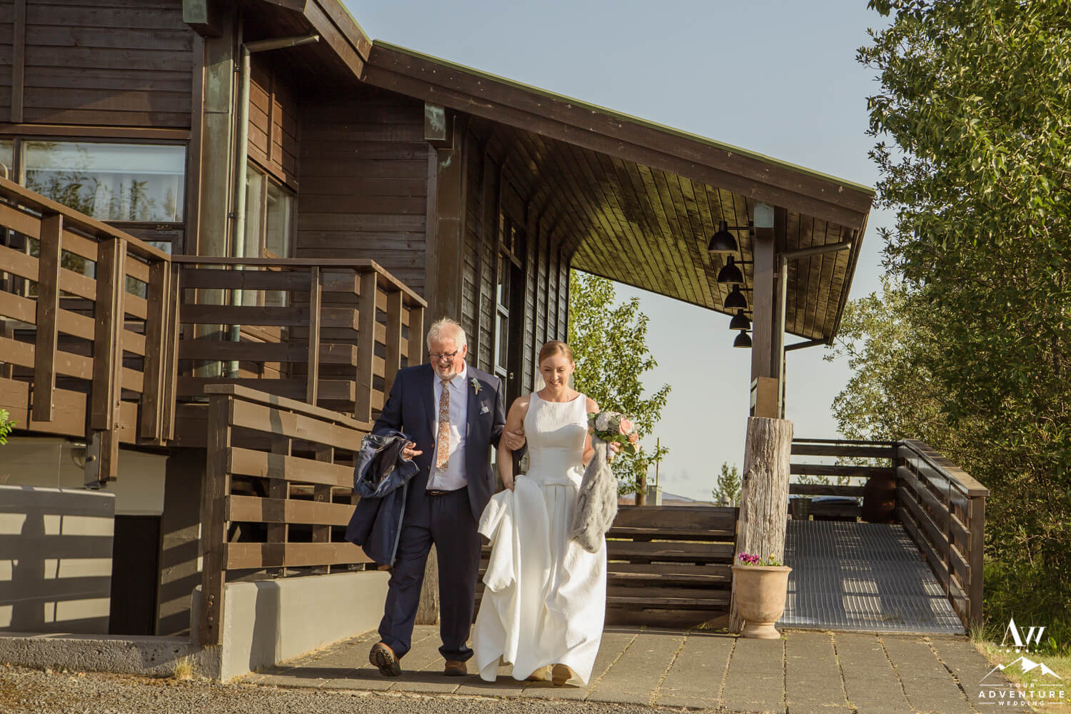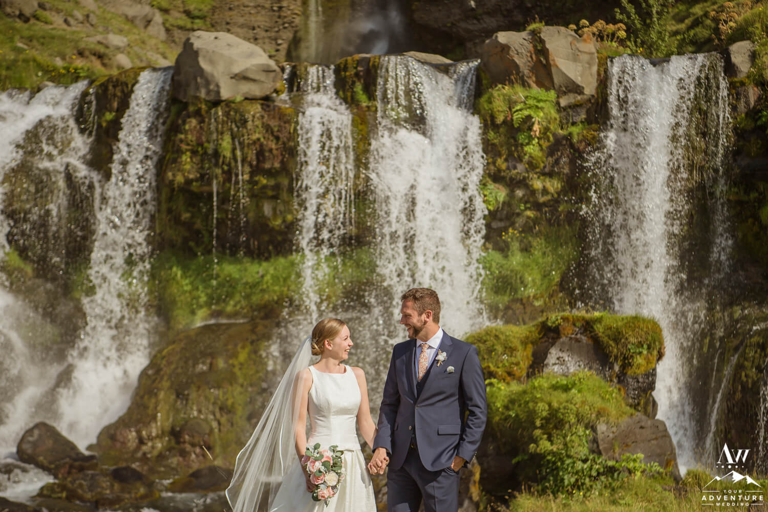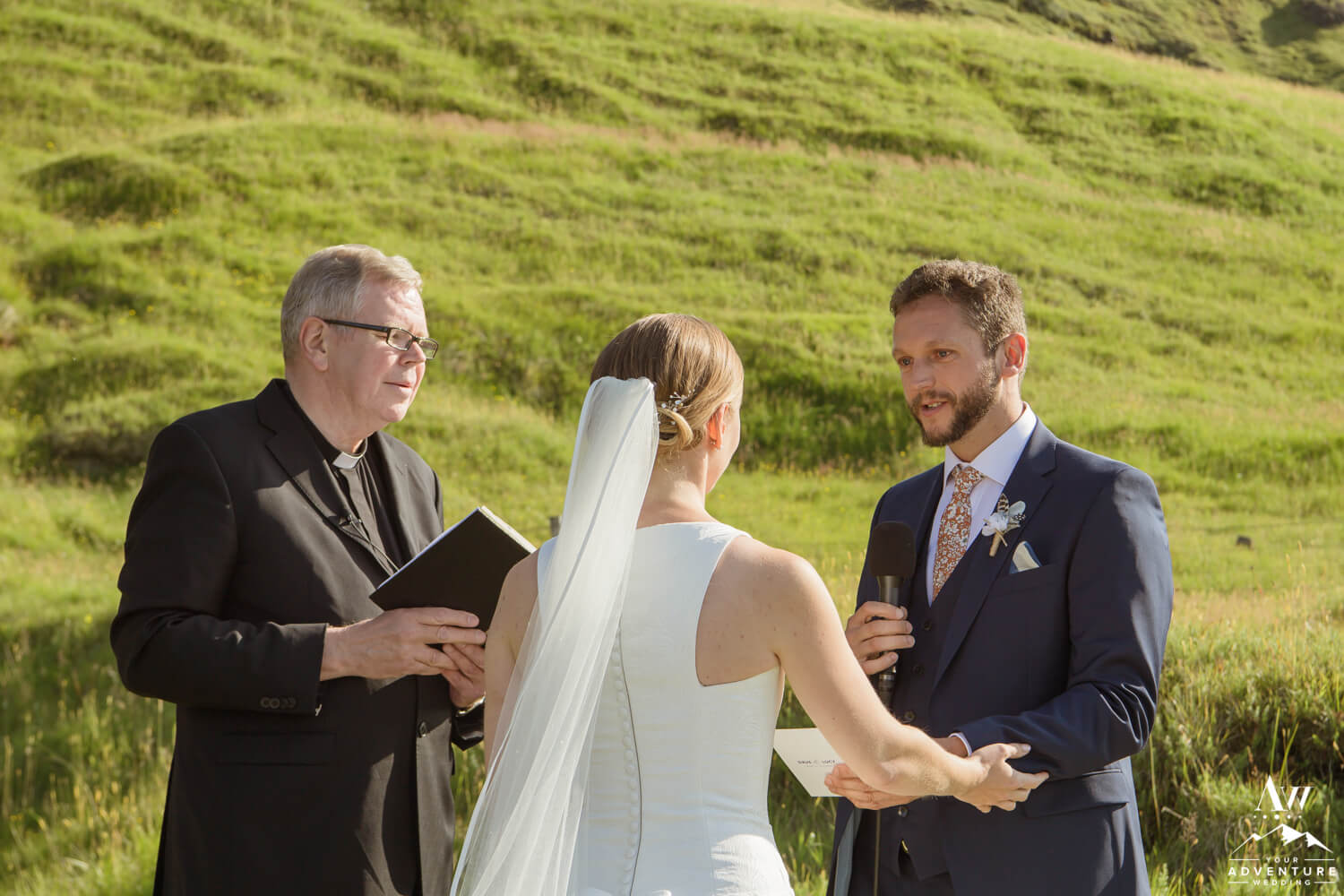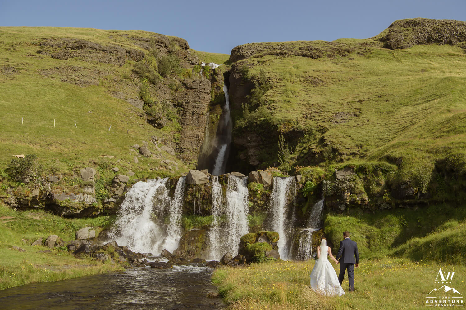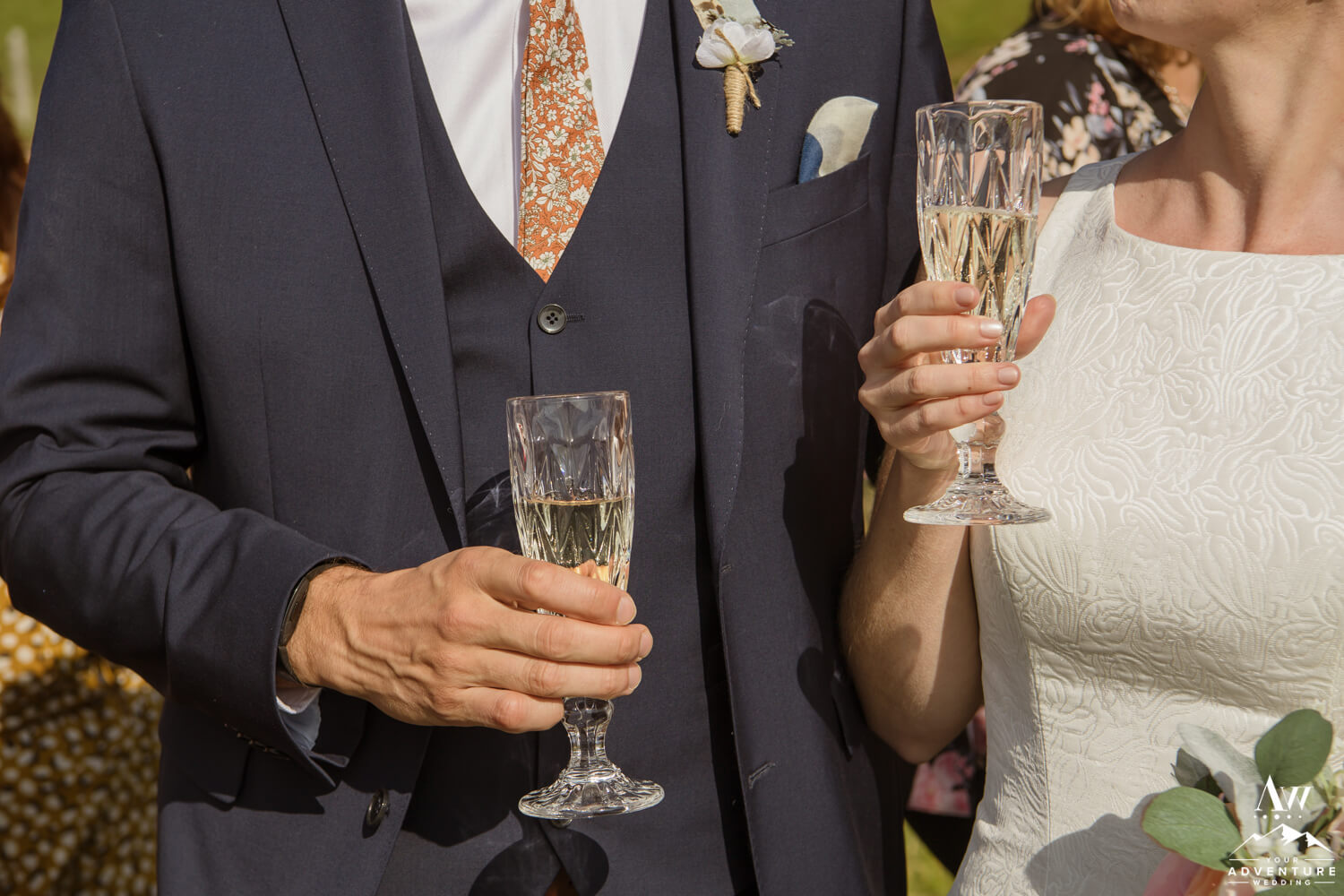 Upon arriving to the private property waterfall, our Day of Planner went to work setting up the ceremony seating, the champagne toast, and organizing the guests and bridal party. Lucy and her father shared a beautiful walk across a bridge and down the aisle to Dave. Our favorite Pastor, performed a custom ceremony complete with the couple reciting their own Iceland wedding vows. Immediately following the ceremony the group were given glasses of cava in celebration of the newlyweds! Truly a delightful end to their summer Iceland nuptials and ceremony!