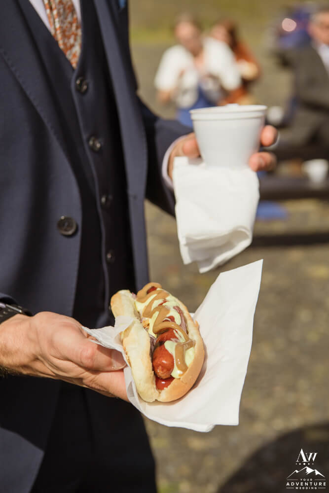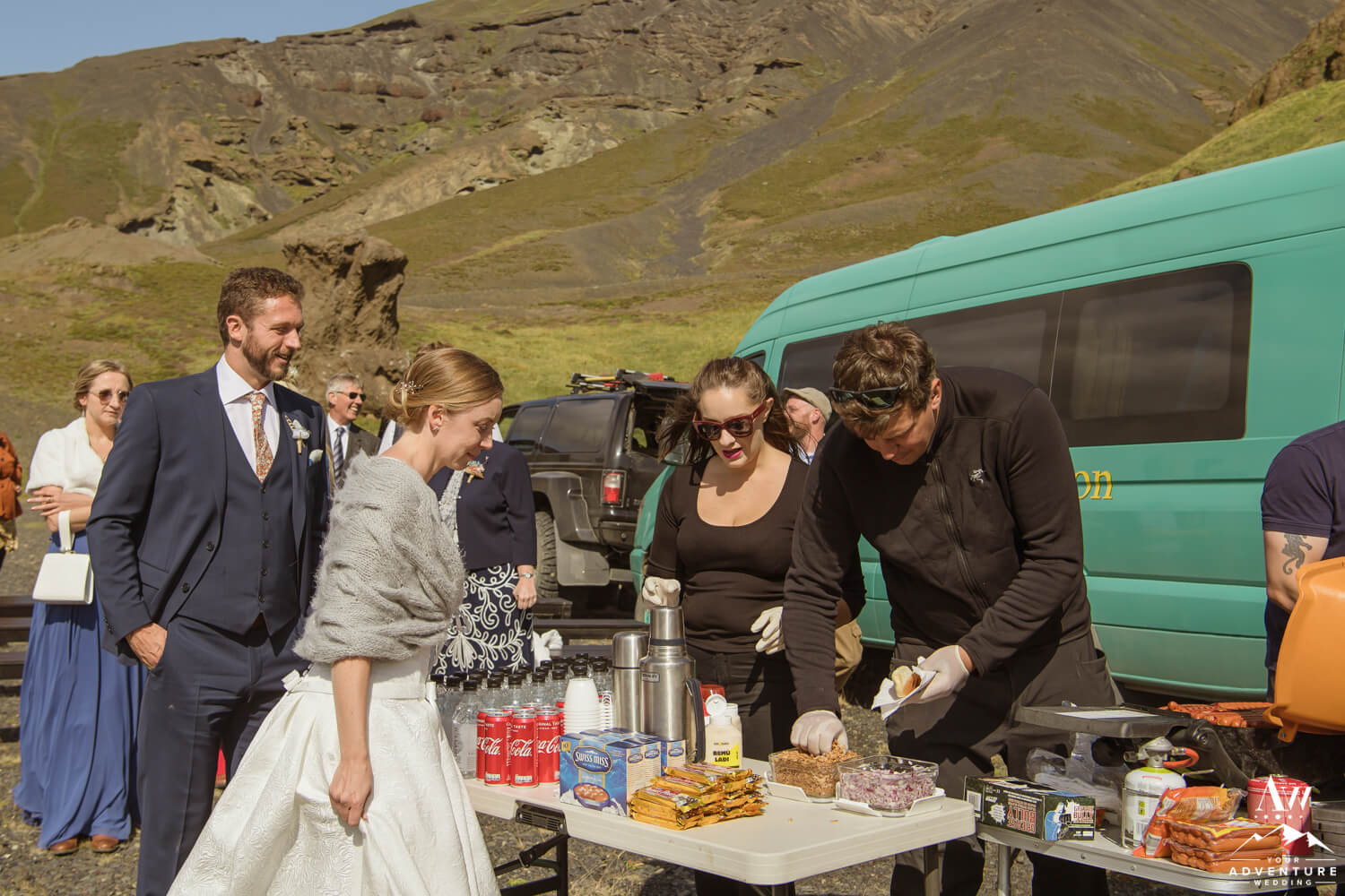 Next on the Iceland summer nuptials adventure wedding agenda was to take the group to a private property cave on the skirts of the highlands. Particularly this Iceland cave location would serve as a multi purpose stop. For instance, the first event that would take place was Lucy and Dave sharing their first dance as husband and wife. Being both a bit more on the introverted side, they welcomed their guests to join them about half way through the song. Following this lovely gesture, they treated their guests to a BBQ lunch complete with traditional hot dogs and hot chocolate!