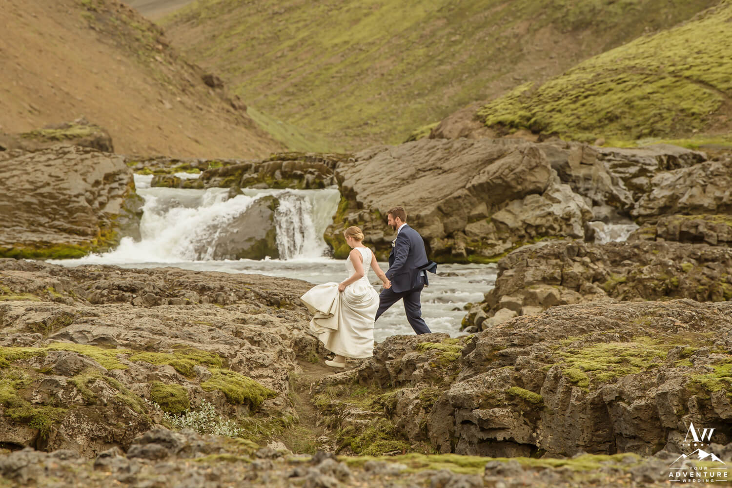 Here is where we officially step into the formal highlands of Iceland. Lucy and Dave ere stoked! For example, a serious sense of wonder, amazement, and disbelief filled the super jeep. It felt like we were transitioning between planets, not highland roads! From spring fed waterfalls to glacier ones, they explored throughout these areas and were sad to leave! Alas, their Iceland wedding reception awaited them…