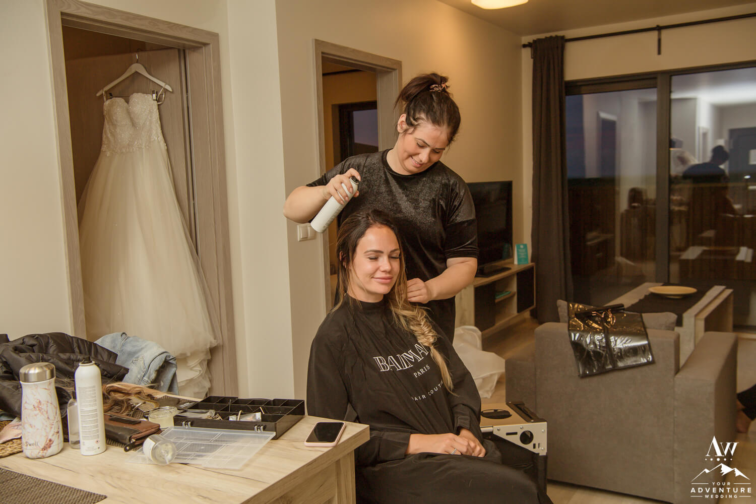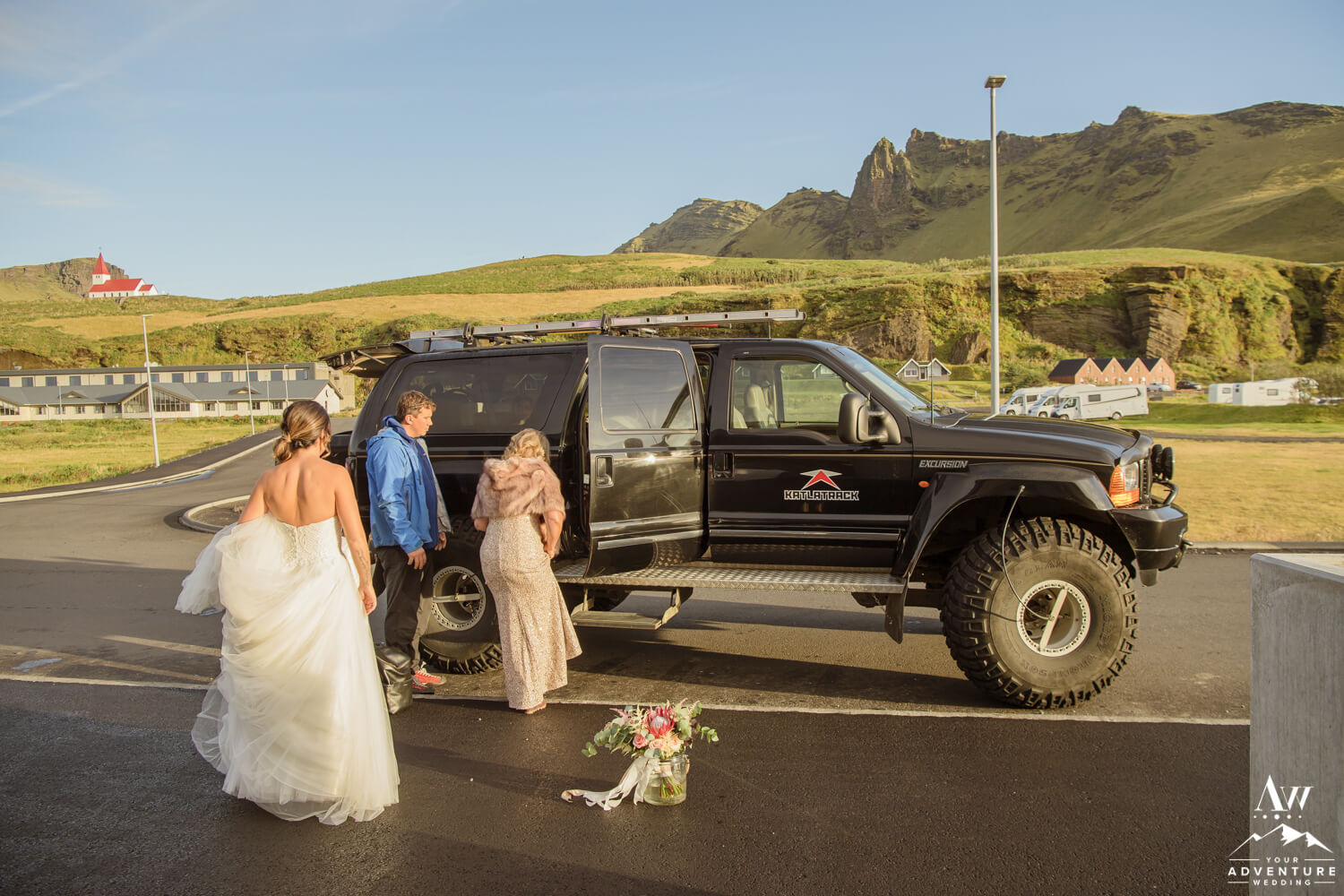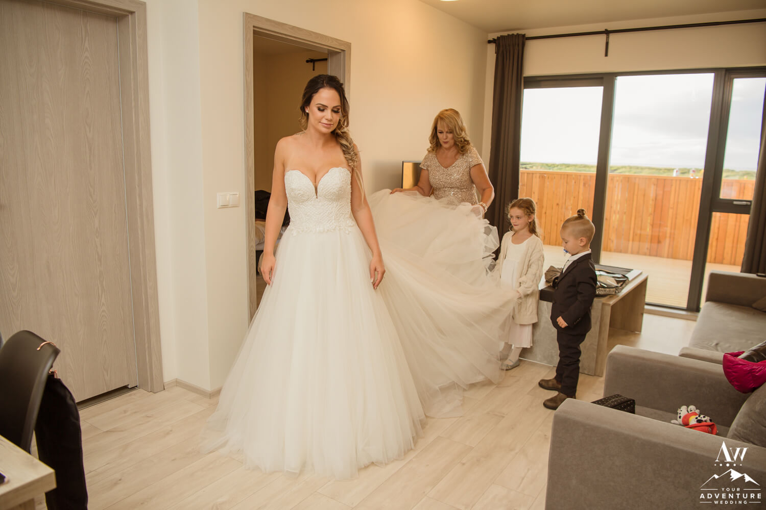 Vik is a tiny town in Southern Iceland that has less than 350 people living there year round. But on any given day of the week, it see’s 1,000’s of visitors. Travis and Chelsea chose to stay at the Vik Apartments to begin their intimate hiking wedding. The morning sun came and the moon was even still out when our hairstylist and elopement photographer arrived. Such a dreamy crisp morning! Choosing to stay traditional, Chelsea and Travis got ready separately and stayed in different jeeps until she walked down the aisle. So sweet to see the kids help get their mum into her Iceland wedding dress too!