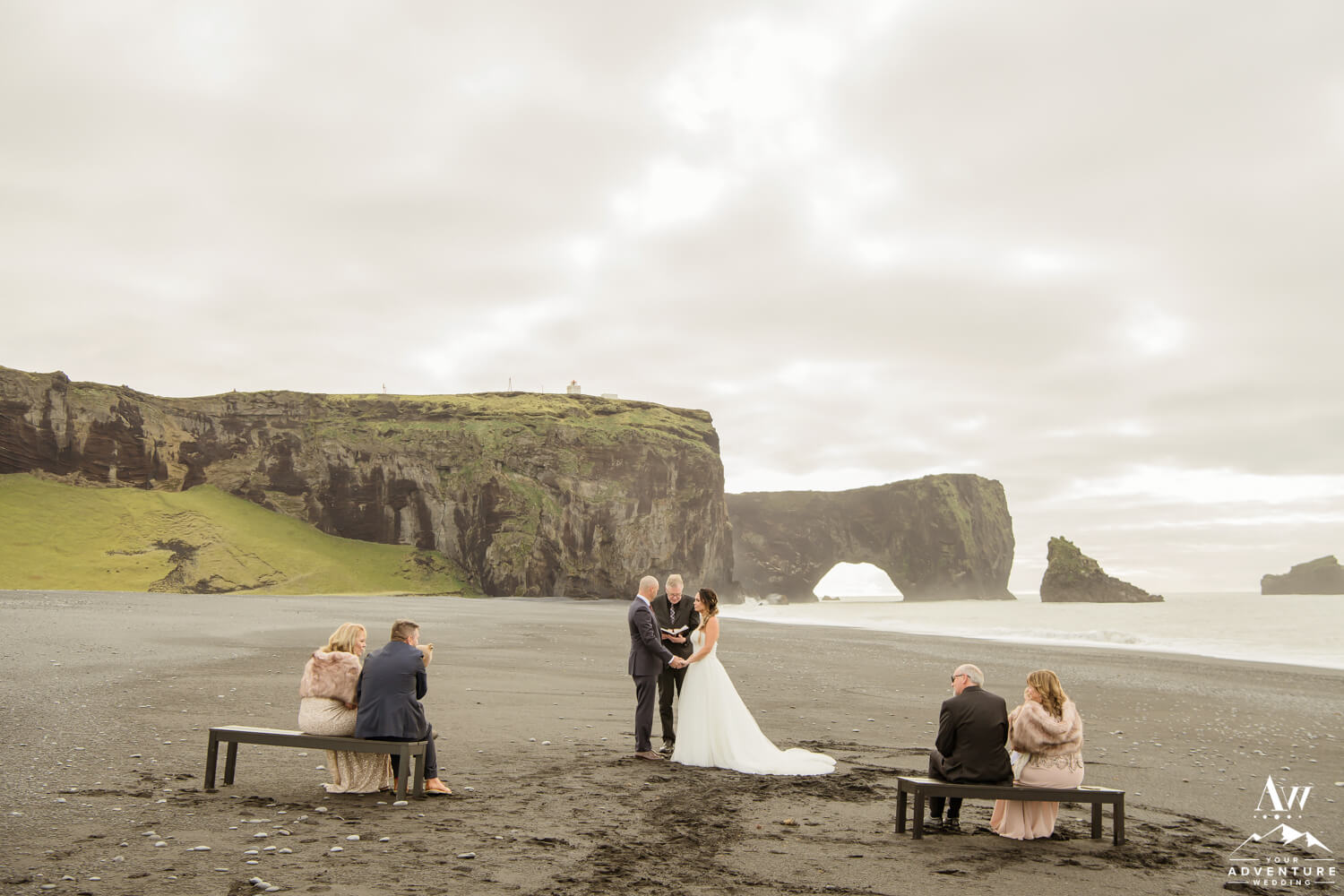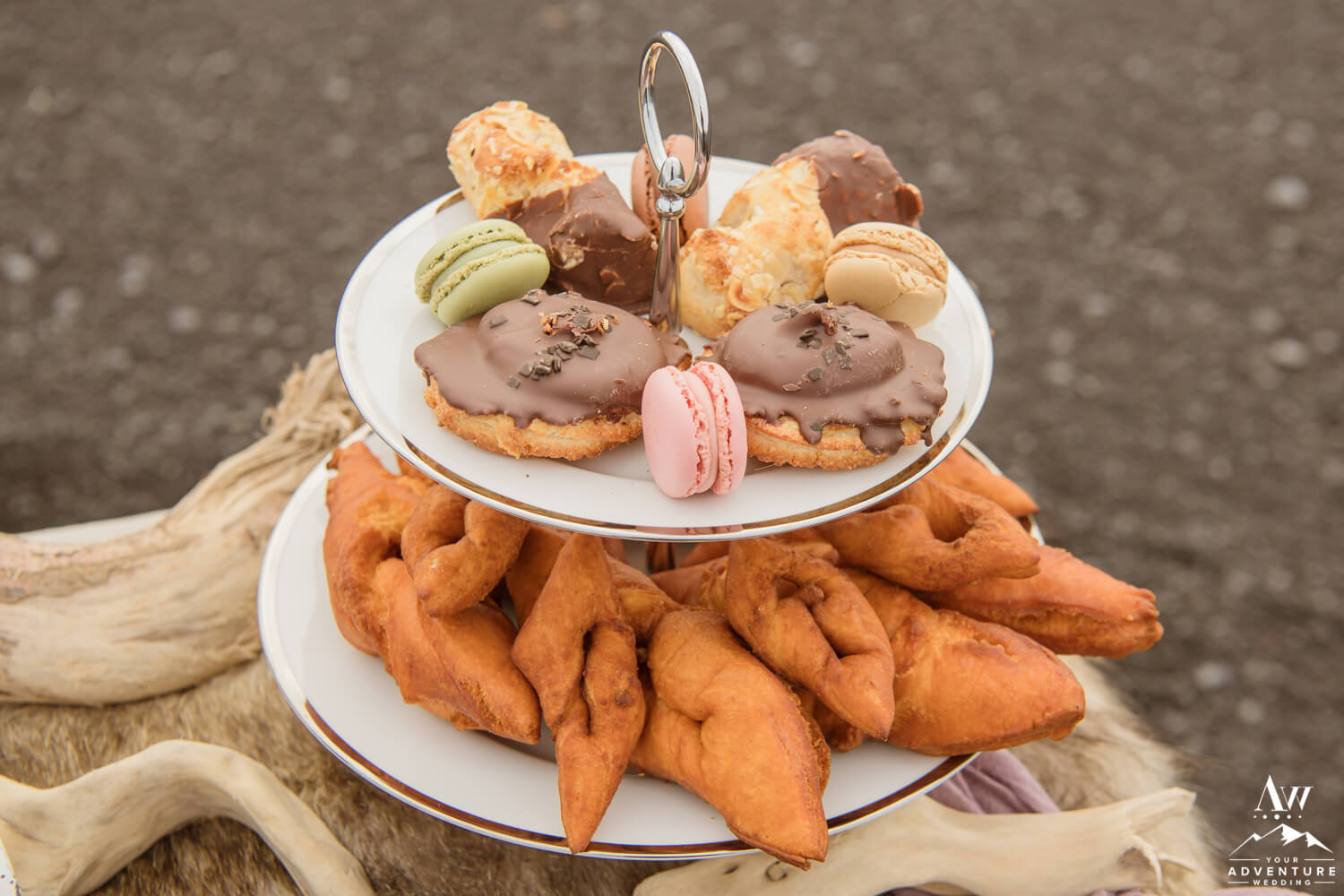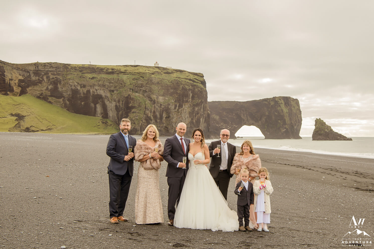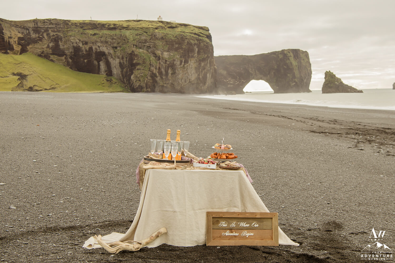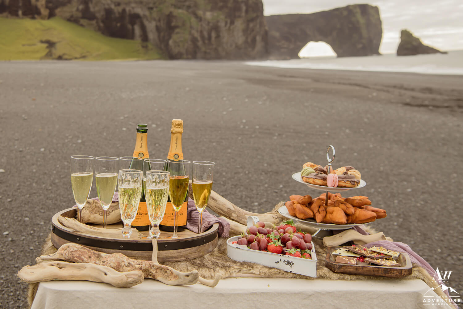 After everyone loaded into the super jeeps, they were on their way to their private property Iceland wedding ceremony location. Being so captivated by unique landscapes, they decided on having their ceremony on the private beach in front of Dyrhólaey sea arch. It was magical with the morning sun shinning everywhere! Subsequently when the ceremony concluded the group delighted in a luxury champagne toast complete with Icelandic pastries including kleinur, macarons, artisan chocolates, and colorful fruit!