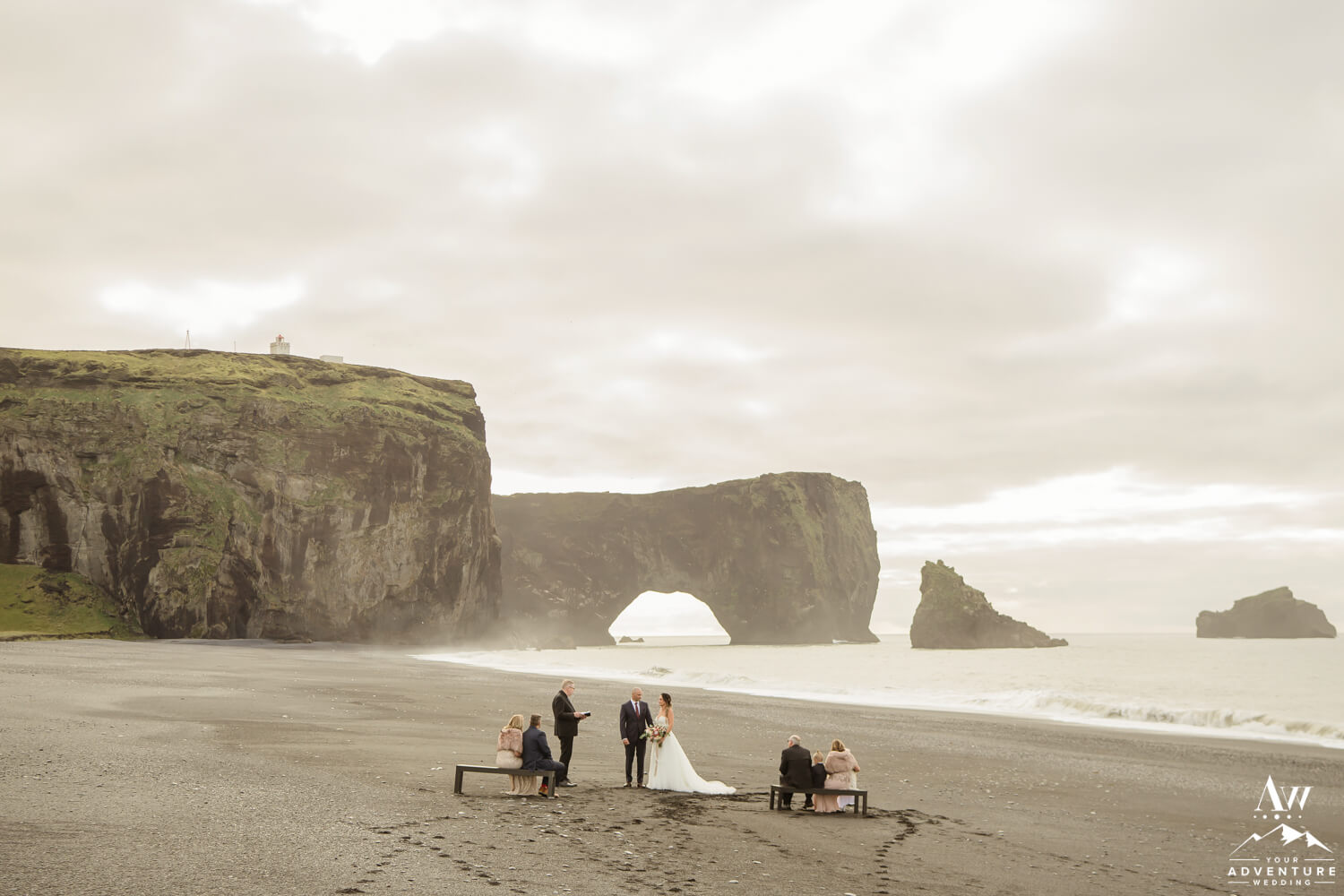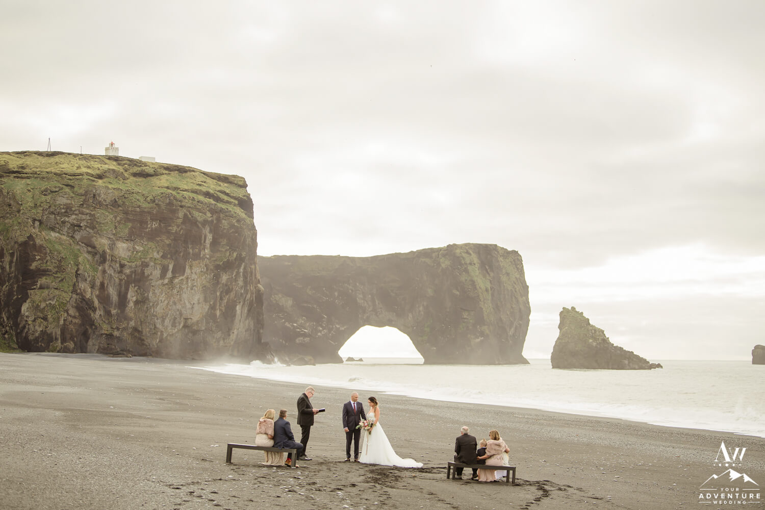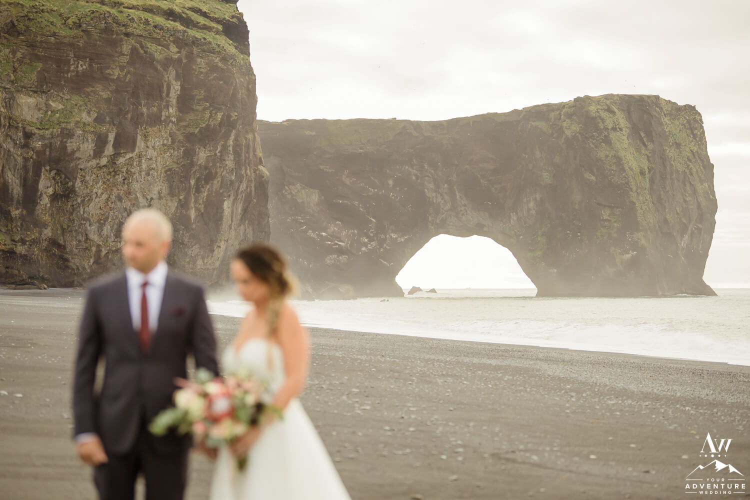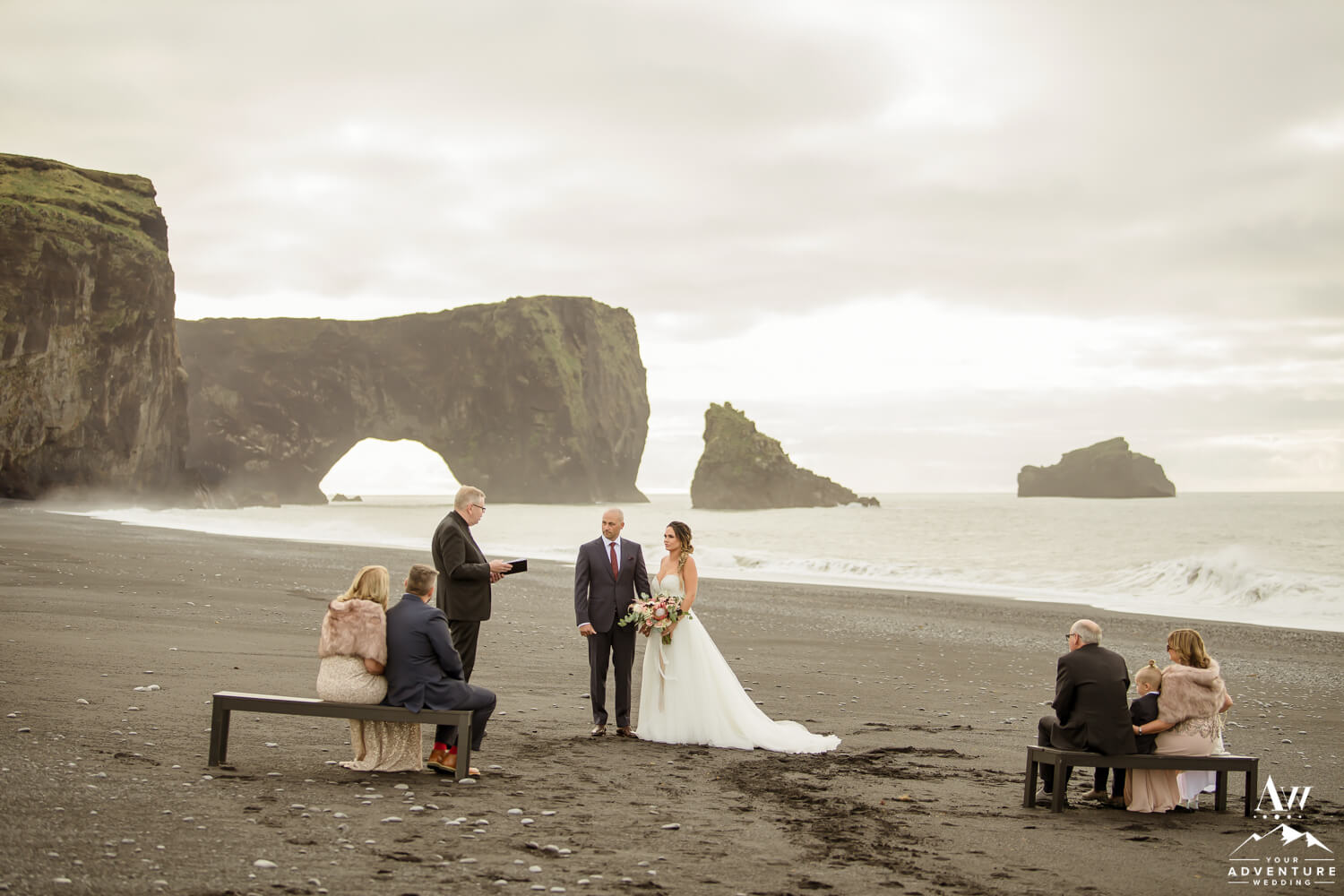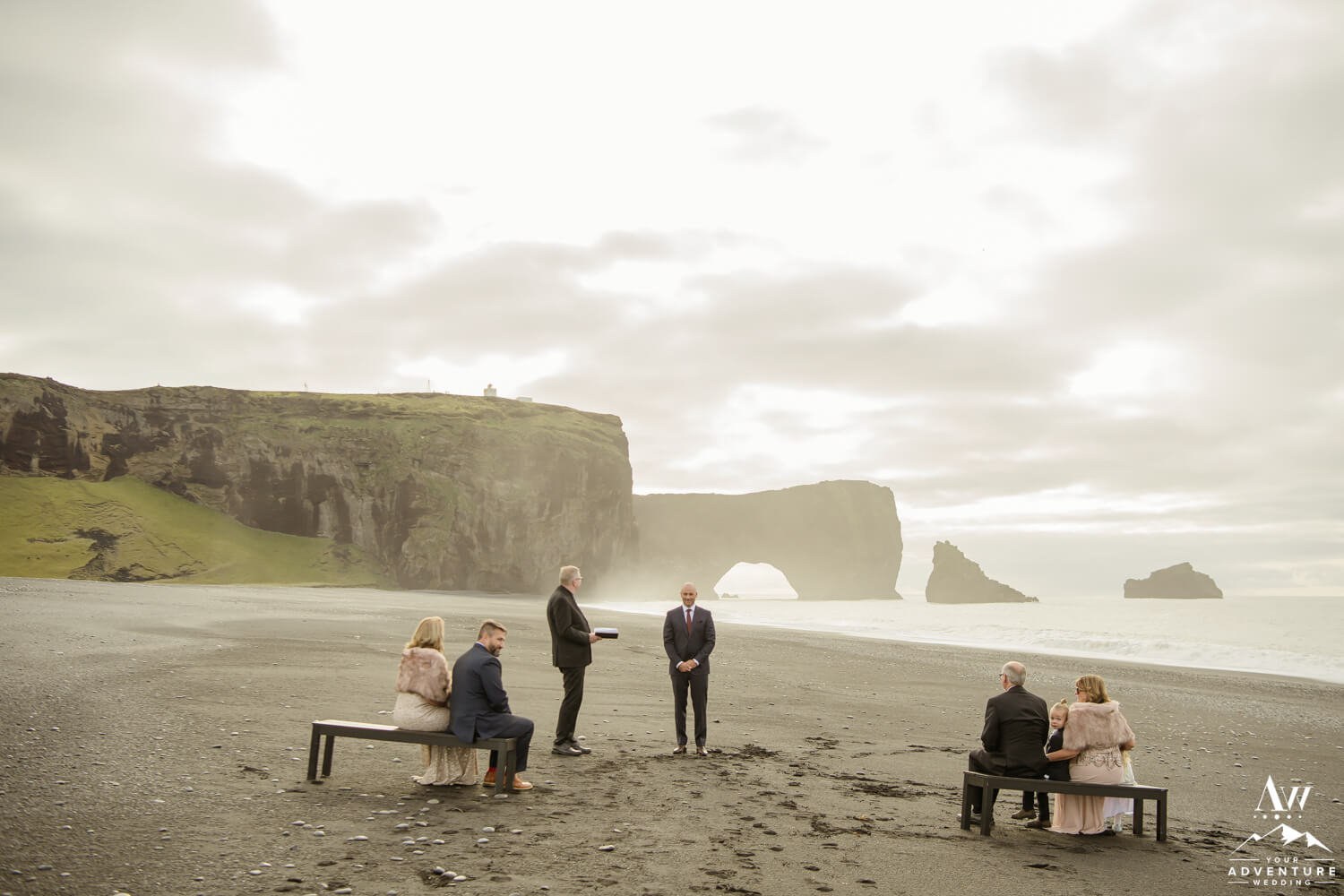 After everyone loaded into the super jeeps, they were on their way to their private property Iceland wedding ceremony location. Being so captivated by unique landscapes, they decided on having their ceremony on the private beach in front of Dyrhólaey sea arch. It was magical with the morning sun shinning everywhere! Subsequently when the ceremony concluded the group delighted in a luxury champagne toast complete with Icelandic pastries including kleinur, macarons, artisan chocolates, and colorful fruit!