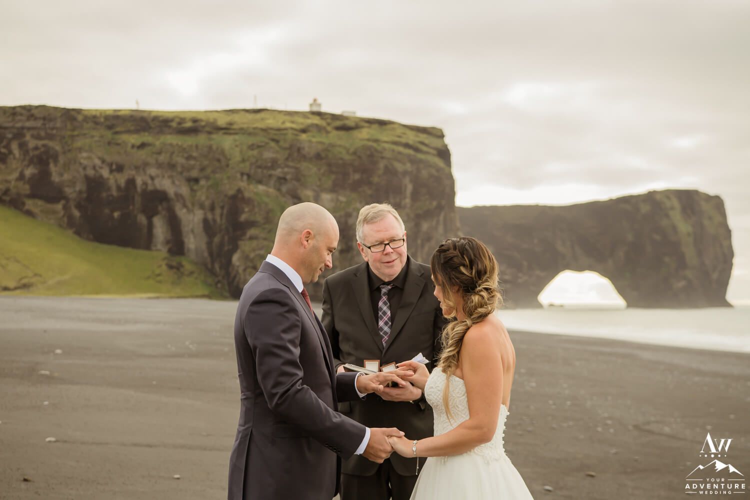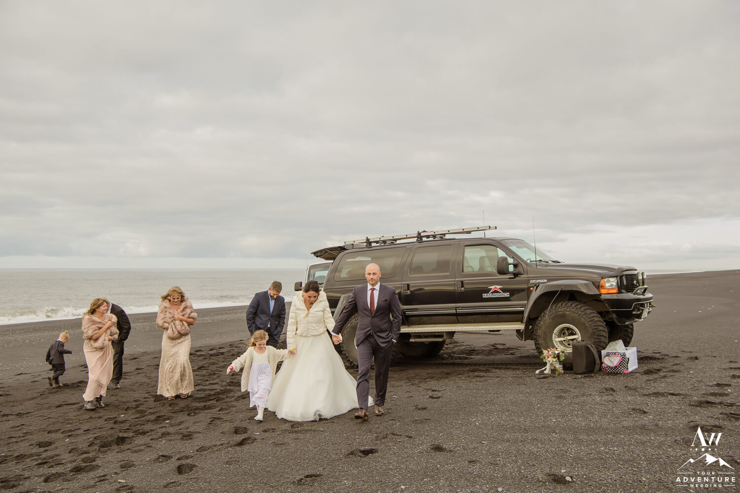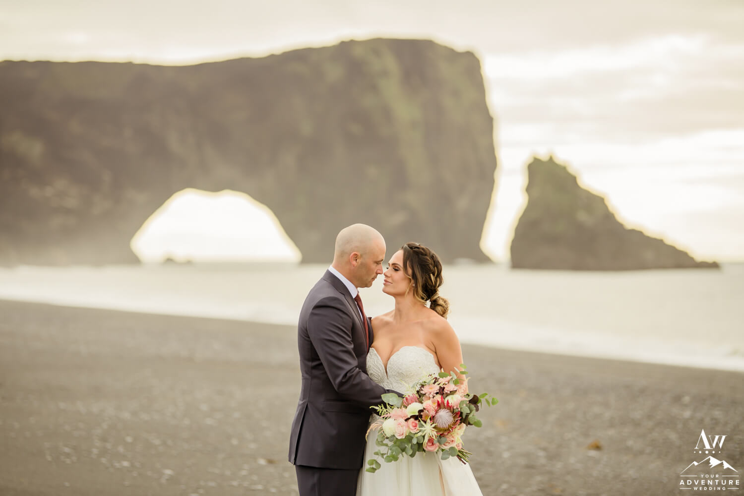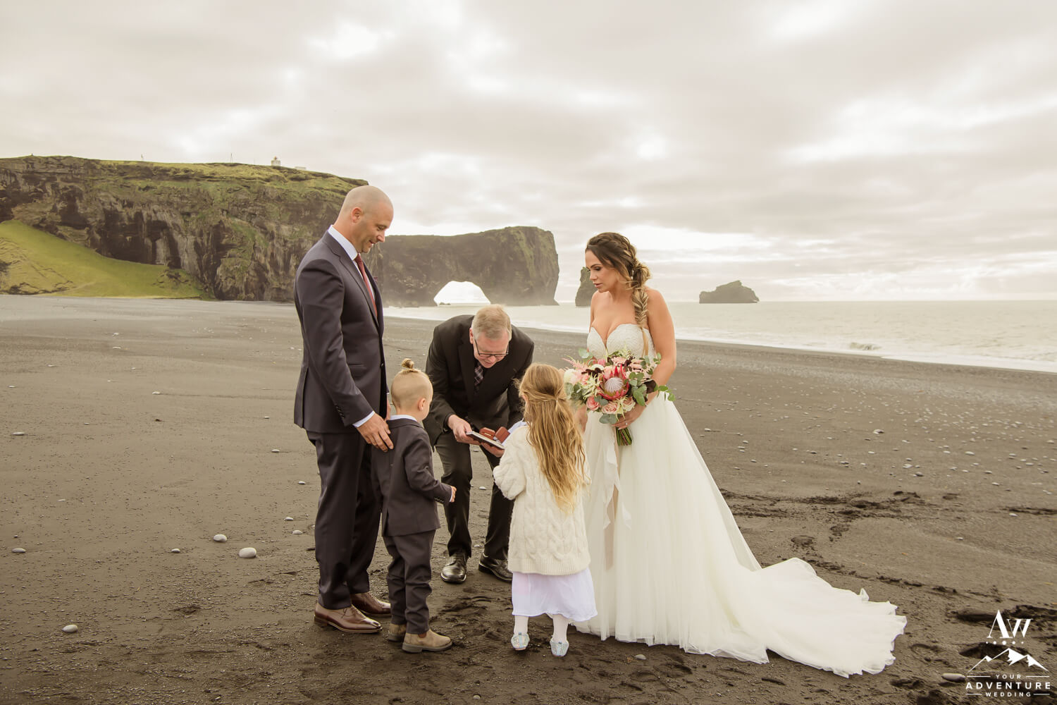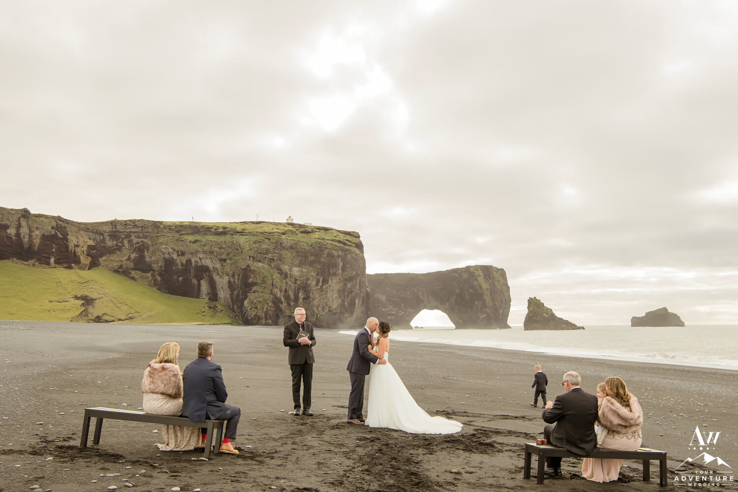After everyone loaded into the super jeeps, they were on their way to their private property Iceland wedding ceremony location. Being so captivated by unique landscapes, they decided on having their ceremony on the private beach in front of Dyrhólaey sea arch. It was magical with the morning sun shinning everywhere! Subsequently when the ceremony concluded the group delighted in a luxury champagne toast complete with Icelandic pastries including kleinur, macarons, artisan chocolates, and colorful fruit!