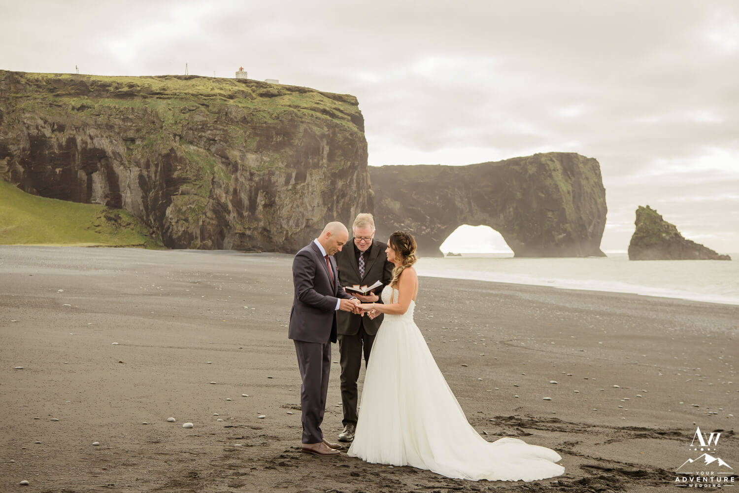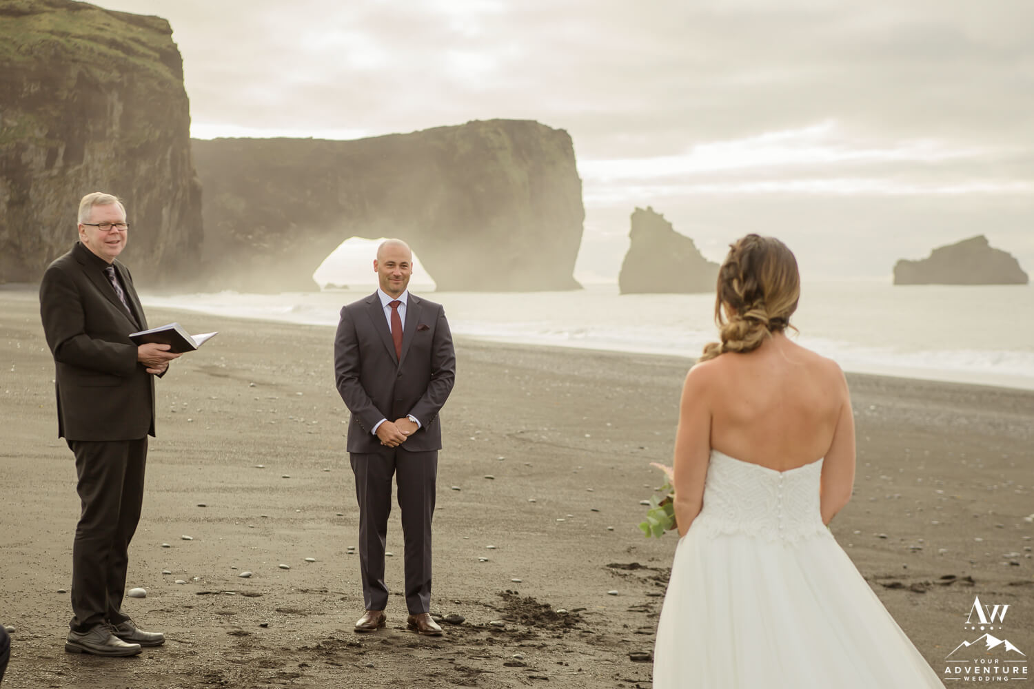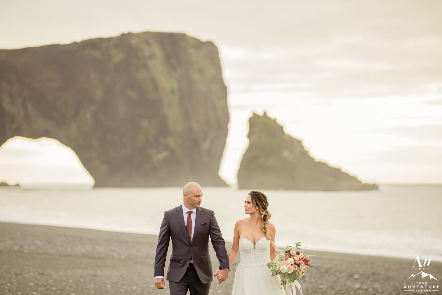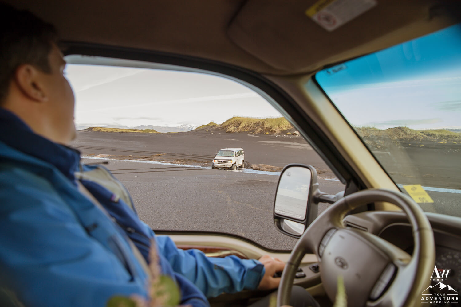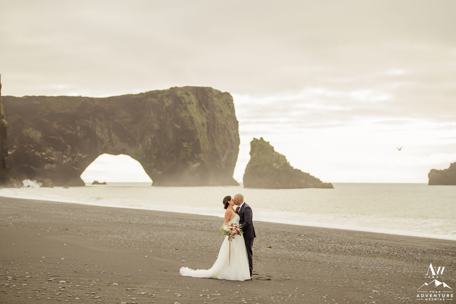 After everyone loaded into the super jeeps, they were on their way to their private property Iceland wedding ceremony location. Being so captivated by unique landscapes, they decided on having their ceremony on the private beach in front of Dyrhólaey sea arch. It was magical with the morning sun shinning everywhere! Subsequently when the ceremony concluded the group delighted in a luxury champagne toast complete with Icelandic pastries including kleinur, macarons, artisan chocolates, and colorful fruit!