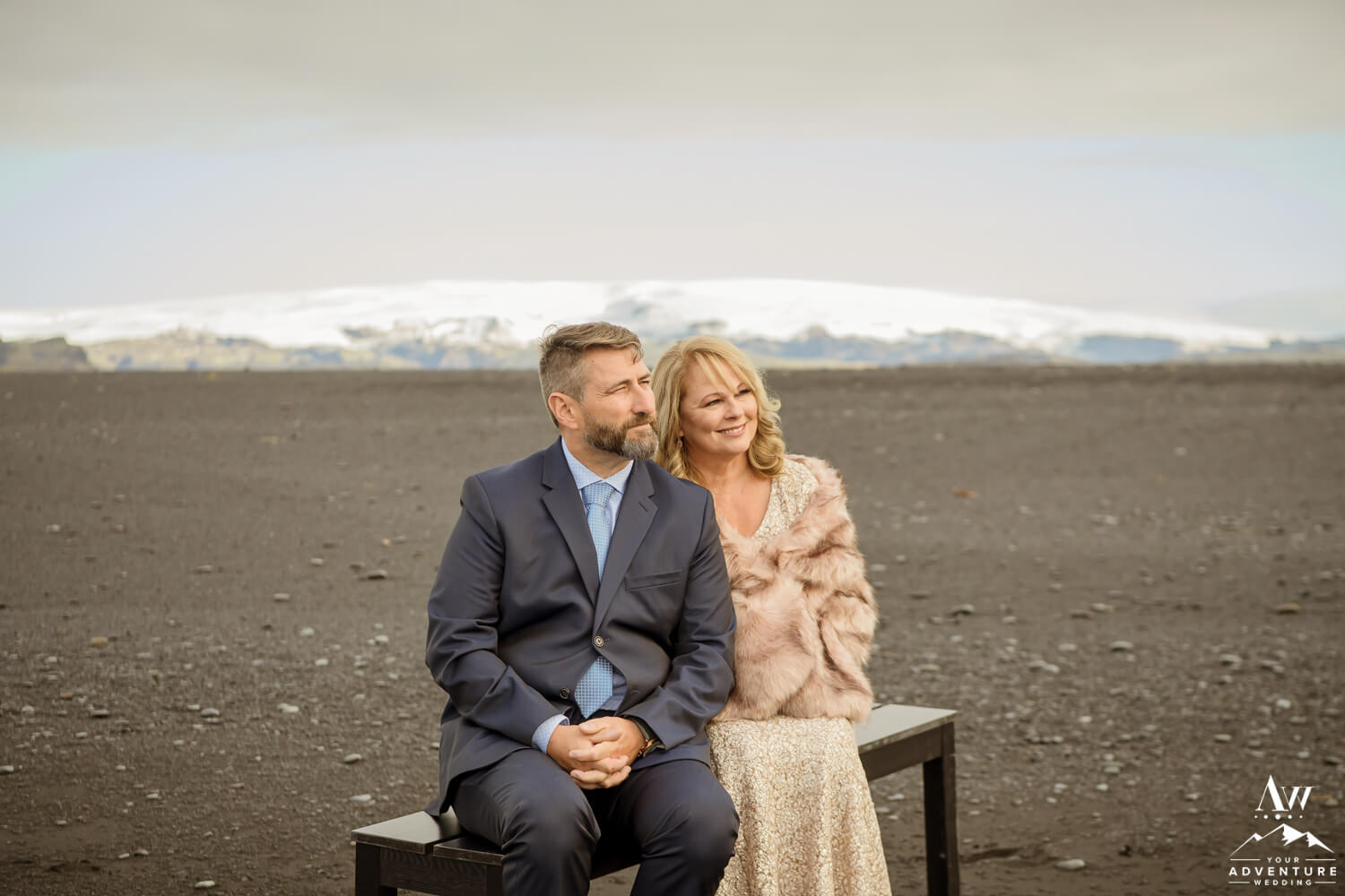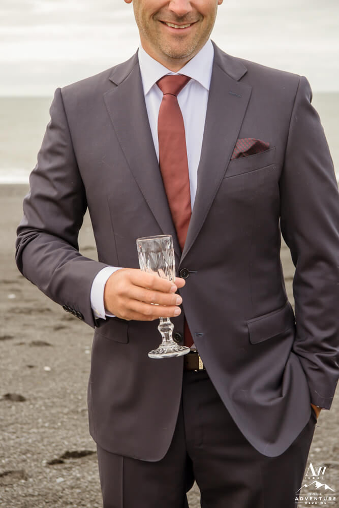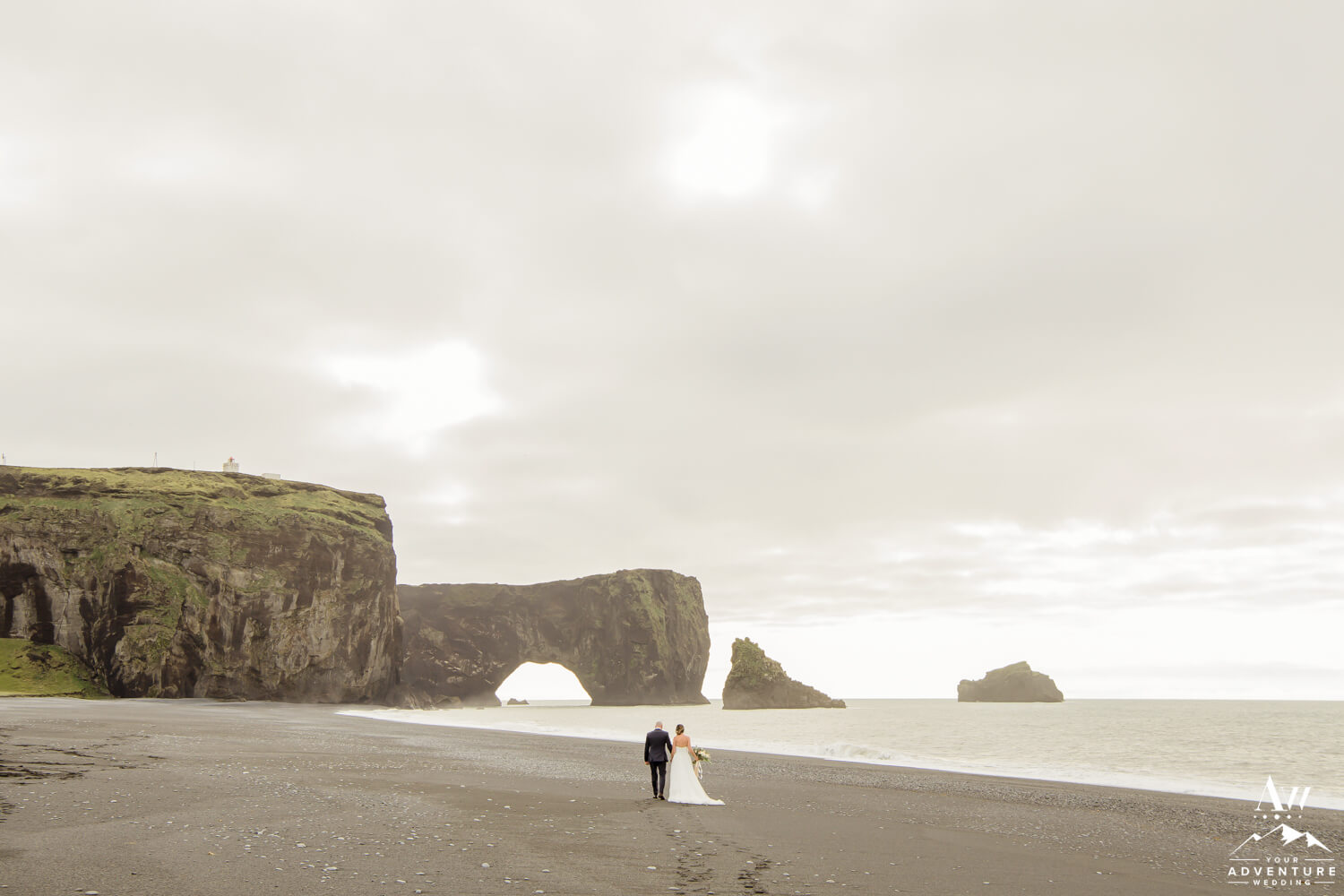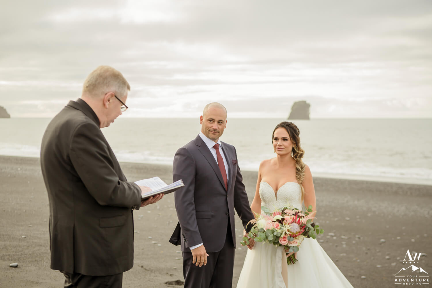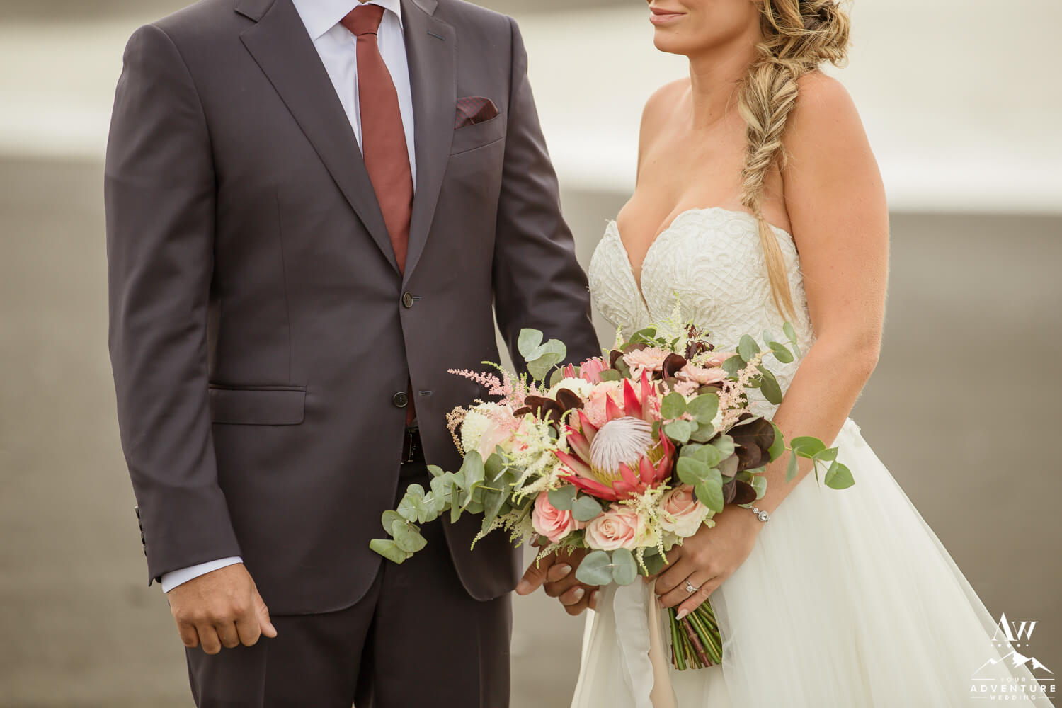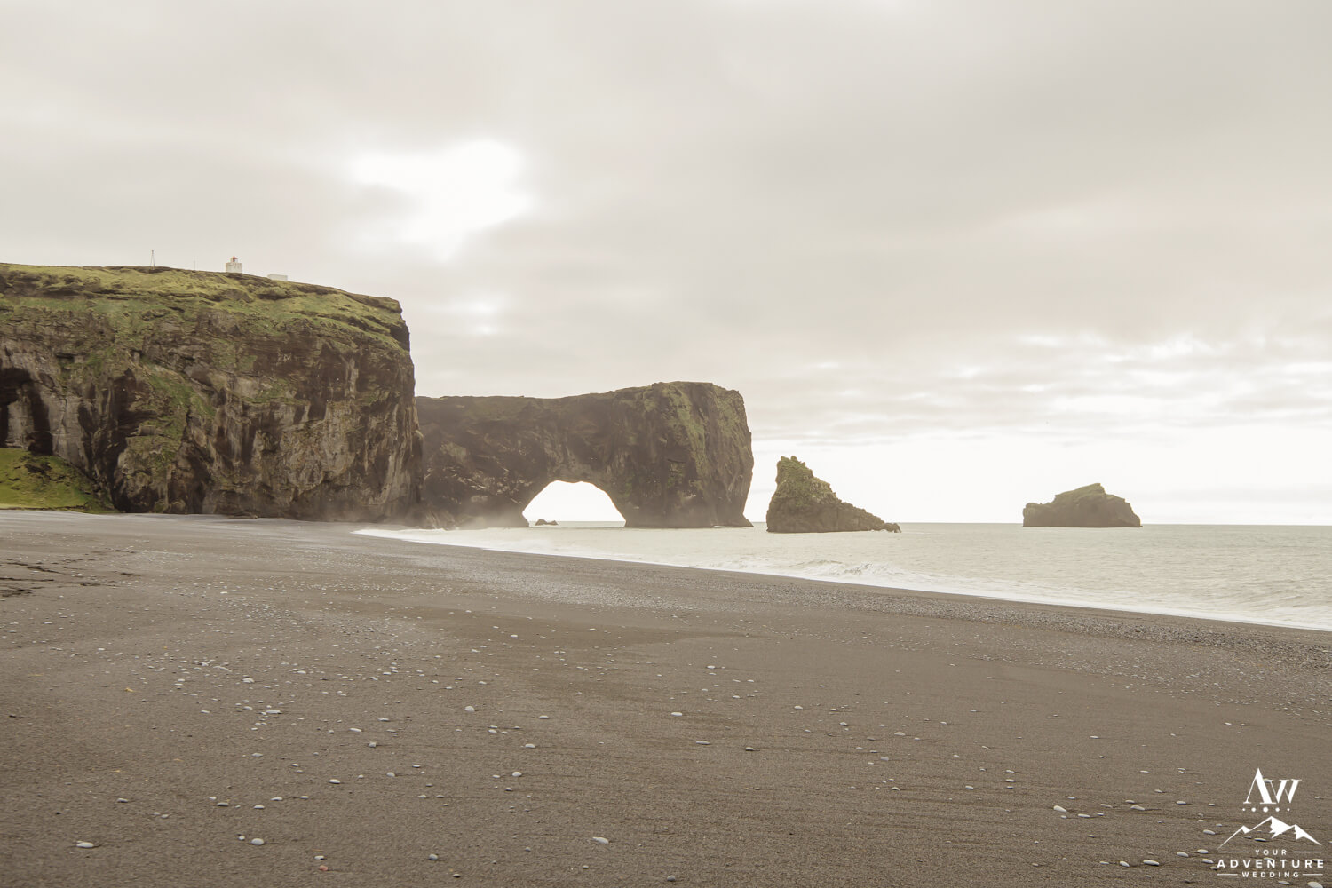 After everyone loaded into the super jeeps, they were on their way to their private property Iceland wedding ceremony location. Being so captivated by unique landscapes, they decided on having their ceremony on the private beach in front of Dyrhólaey sea arch. It was magical with the morning sun shinning everywhere! Subsequently when the ceremony concluded the group delighted in a luxury champagne toast complete with Icelandic pastries including kleinur, macarons, artisan chocolates, and colorful fruit!